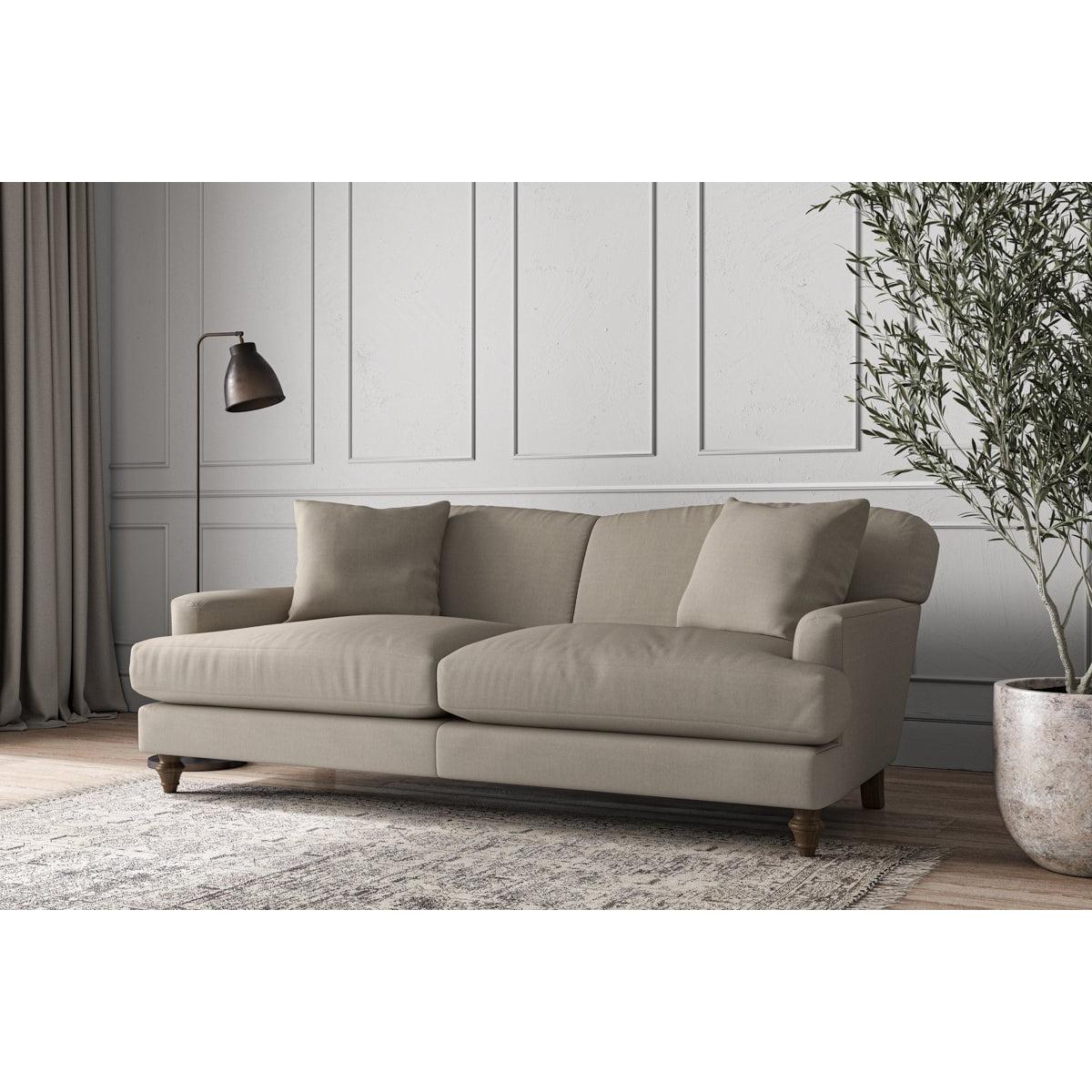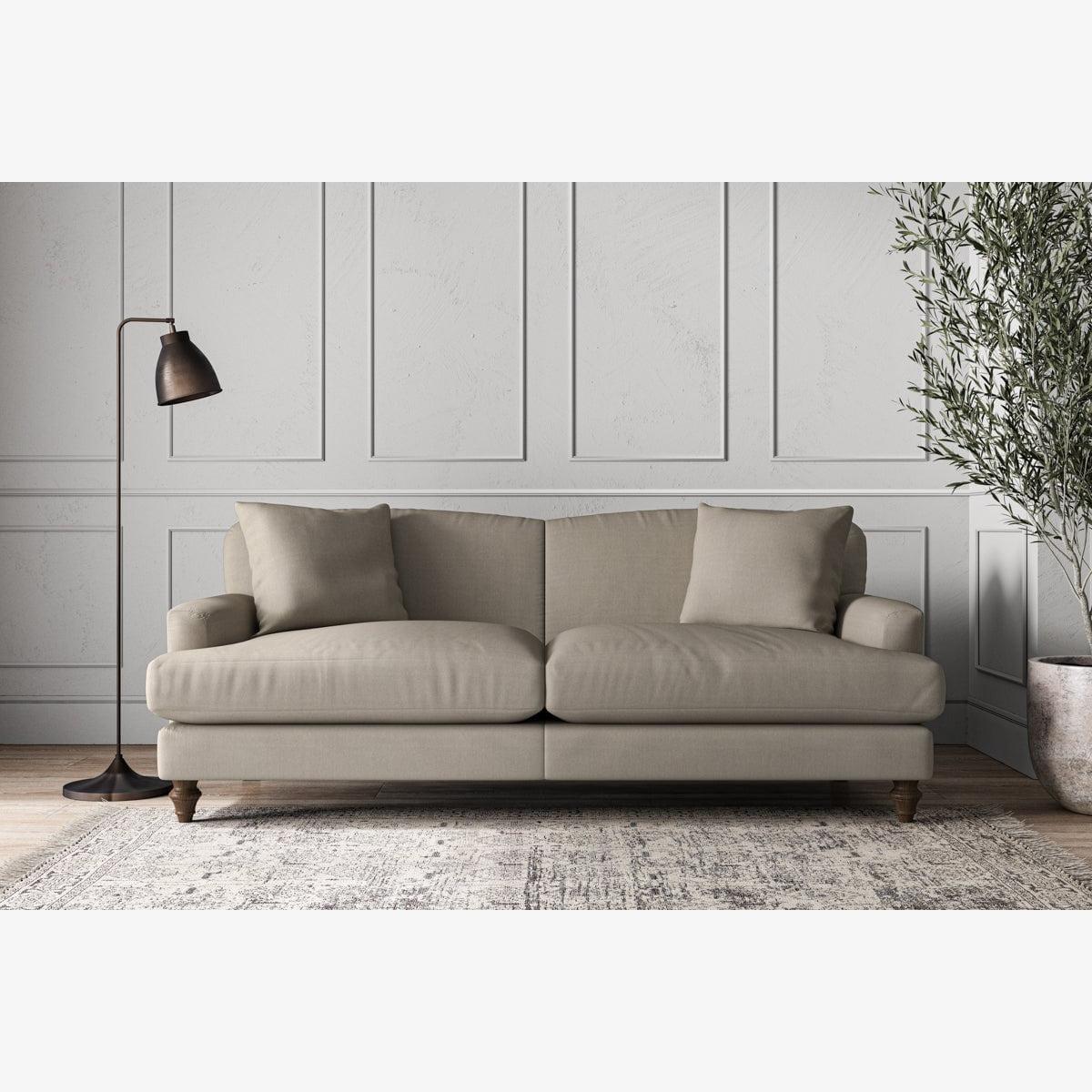 Our Deni large sofa is generously proportioned with deep, sumptuous seat cushions for luxurious comfort. Handcrafted from a solid hardwood frame with high-grade steel serpentine springs and foam and fibre wrap filling, this timeless collection celebrates the best of British quality and design. Fine details include in-built back cushions, hand-turned hardwood feet and two scatter cushions for added comfort. Our upholstery fabrics are chosen for their style and quality, where all fabrics are FR treated for domestic upholstery ensuring peace of mind as well as meeting specialist UK furniture requirements. Our curated colour palette offers a variety of sophisticated muted shades. Please note, our white background cut-out photography is shown in Natural for shape and style reference. Fabric Swatch OrderingWe recommend ordering fabric swatches before placing your order, giving you the chance to feel the fabric and see your colour choices within your own home. You can order up to 6 free fabric swatches by clicking here. it fit?Before placing your order, it's important to take the time to measure the space you intend to place your made-to-order furniture to ensure it fits properly. You can read more in our You can read more in our Sofa Buying Guide.