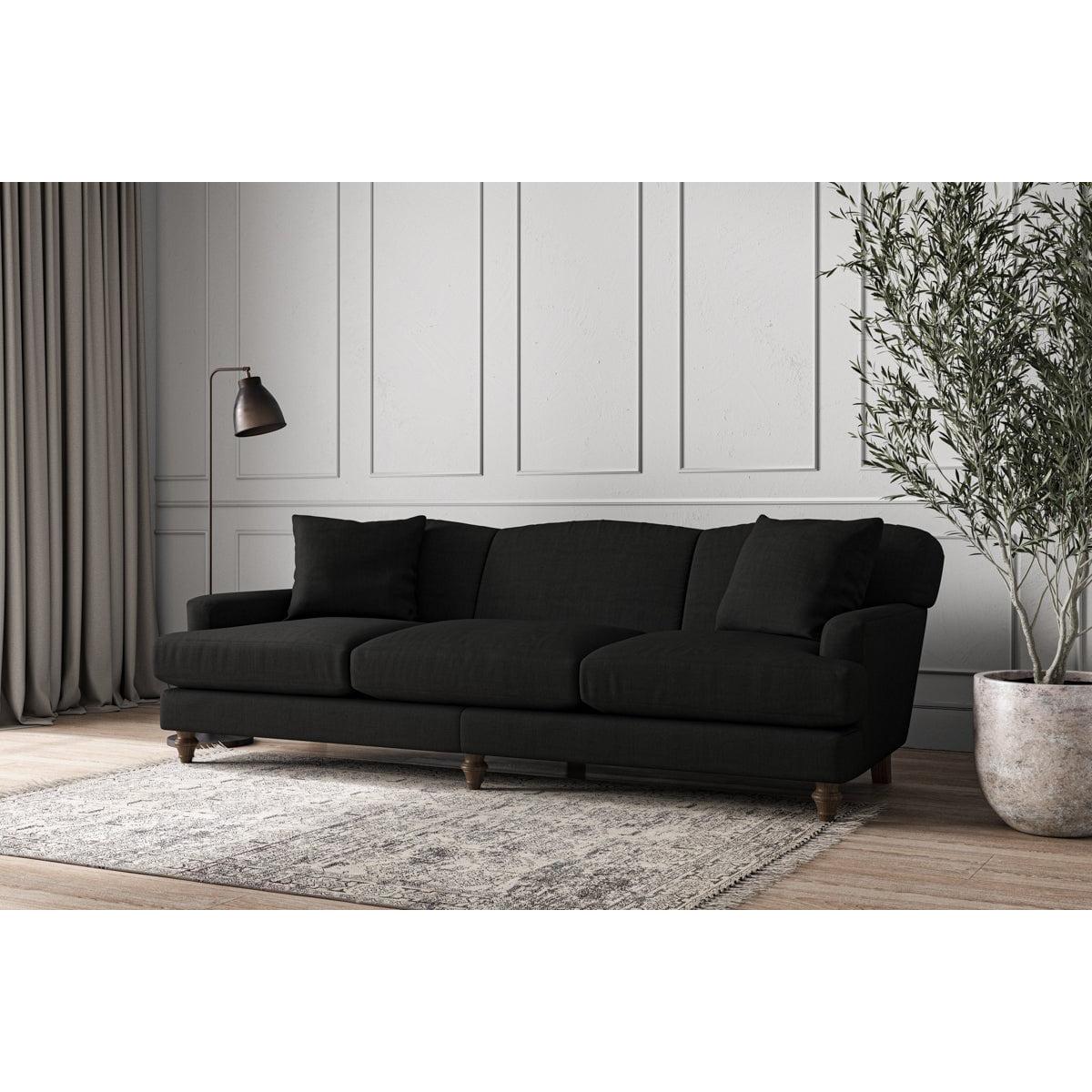 Our Deni super grand sofa is generously proportioned with deep, sumptuous seat cushions for luxurious comfort. Handcrafted from a solid hardwood frame with high-grade steel serpentine springs and foam and fibre wrap filling, this timeless collection celebrates the best of British quality and design. Fine details include in-built back cushions, hand-turned hardwood feet and a set of two scatter cushions for added comfort. Our upholstery fabrics are sourced from Italy’s finest mills and are chosen for their style and quality. We have selected a beautiful heavyweight, soft washed linen with an outstanding texture. Our linen is perfectly suited to upholstery, with an appealing natural, and tactile feel. It is also heavy and durable. The linen is FR treated for domestic upholstery ensuring peace of mind as well as meeting specialist UK furniture requirements. Our curated colour palette offers a variety of 11 sophisticated muted shades. Please note, our white background cut-out photography is shown in Natural for shape and style reference. Fabric Swatch Ordering We recommend ordering fabric swatches before placing your order, giving you the chance to feel the fabric and see your colour choices within your own home. You can order up to 6 free fabric swatches by clicking here. Before placing your order, it's important to take the time to measure the space you intend to place your made-to-order furniture to ensure it fits properly. You can read more in our Sofa Buying Guide.