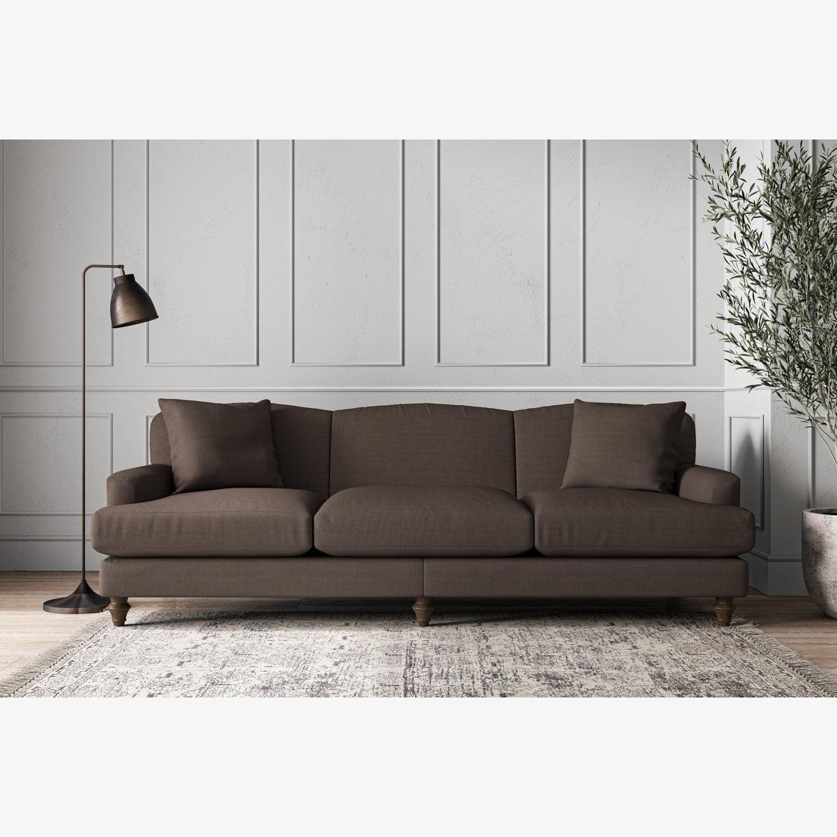 Our Deni super grand sofa is generously proportioned with deep, sumptuous seat cushions for luxurious comfort. Handcrafted from a solid hardwood frame with high-grade steel serpentine springs and foam and fibre wrap filling, this timeless collection celebrates the best of British quality and design. Fine details include in-built back cushions, hand-turned hardwood feet and a set of two scatter cushions for added comfort. Our upholstery fabrics are chosen for their style and quality, where all fabrics are FR treated for domestic upholstery ensuring peace of mind as well as meeting specialist UK furniture requirements. Our curated colour palette offers a variety of sophisticated muted shades. Please note, our white background cut-out photography is shown in Natural for shape and style reference. Fabric Swatch Ordering We recommend ordering fabric swatches before placing your order, giving you the chance to feel the fabric and see your colour choices within your own home. You can order up to 6 free fabric swatches by clicking here. Before placing your order, it's important to take the time to measure the space you intend to place your made-to-order furniture to ensure it fits properly. You can read more in our Sofa Buying Guide.