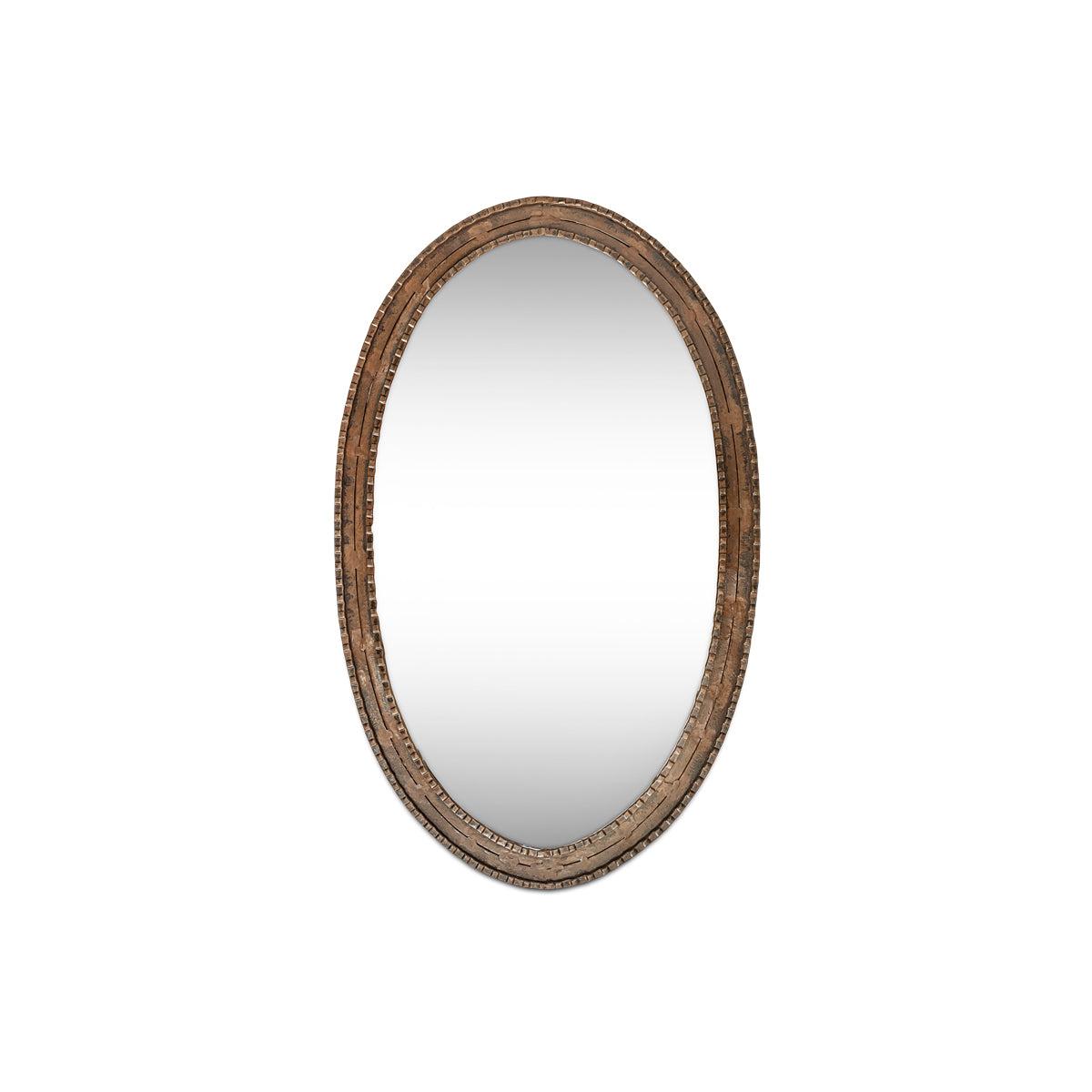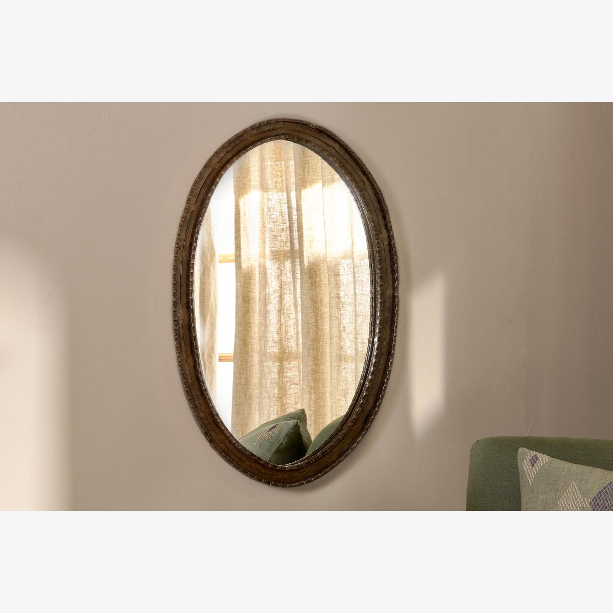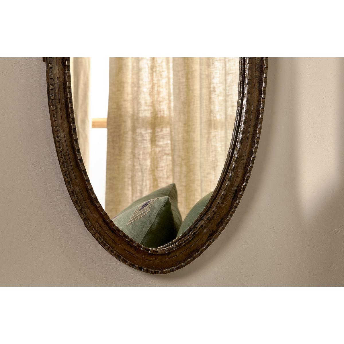 The Drishti mirror has a uniquely handcrafted design etched into the mirrors edge. The heavy iron frame has a rustic, antique black finish that adds a bold touch to interiors, bringing light and a sense of space to even the darkest day. The oval shape works well in any living space, bedroom or hallway. Available in two sizes.