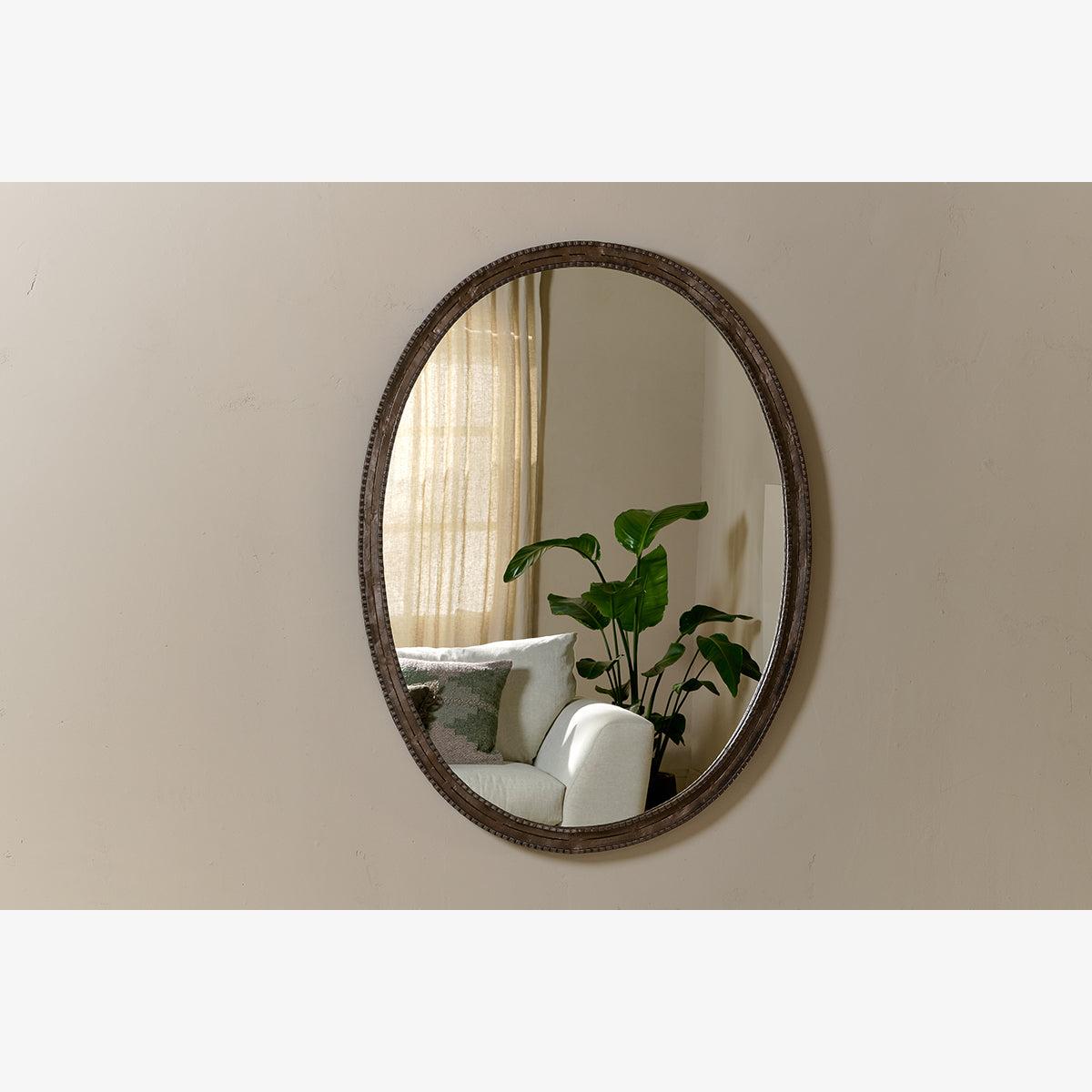 The Drishti mirror has a uniquely handcrafted design etched into the mirrors edge. The heavy iron frame has a rustic, antique black finish that adds a bold touch to interiors, bringing light and a sense of space to even the darkest day. The oval shape works well in any living space, bedroom or hallway. Available in two sizes.