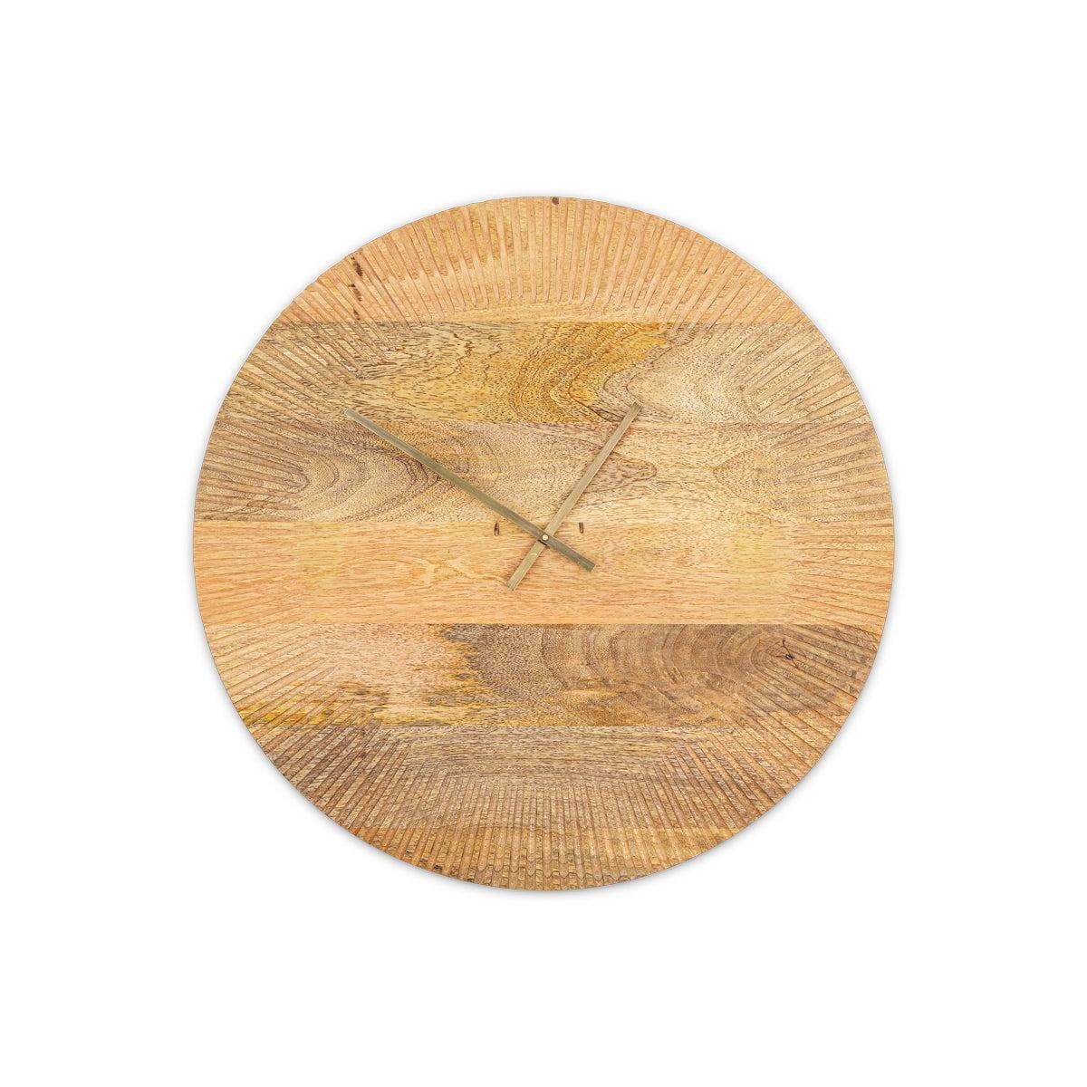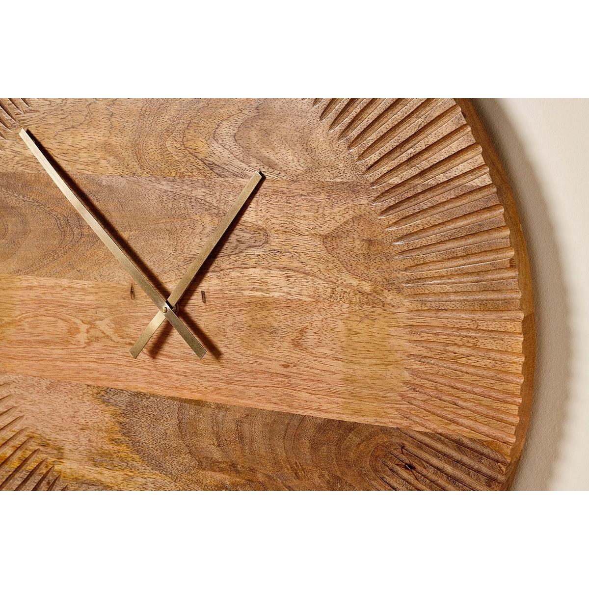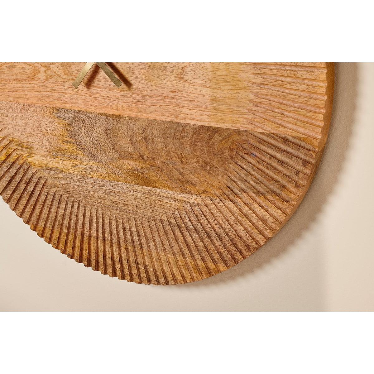 The Eady mango wood clock is hand carved from sustainable mango wood. The appealing groove design is carefully hand carved, creating an eye -catching edging detail. The clock showcases a set of brass hands. The natural mango wood has an attractive natural grain and warm tone. The Eady is a great way to add a natural and calming element to a wall space. The brass of the clock hands work well with the natural wood clock face.