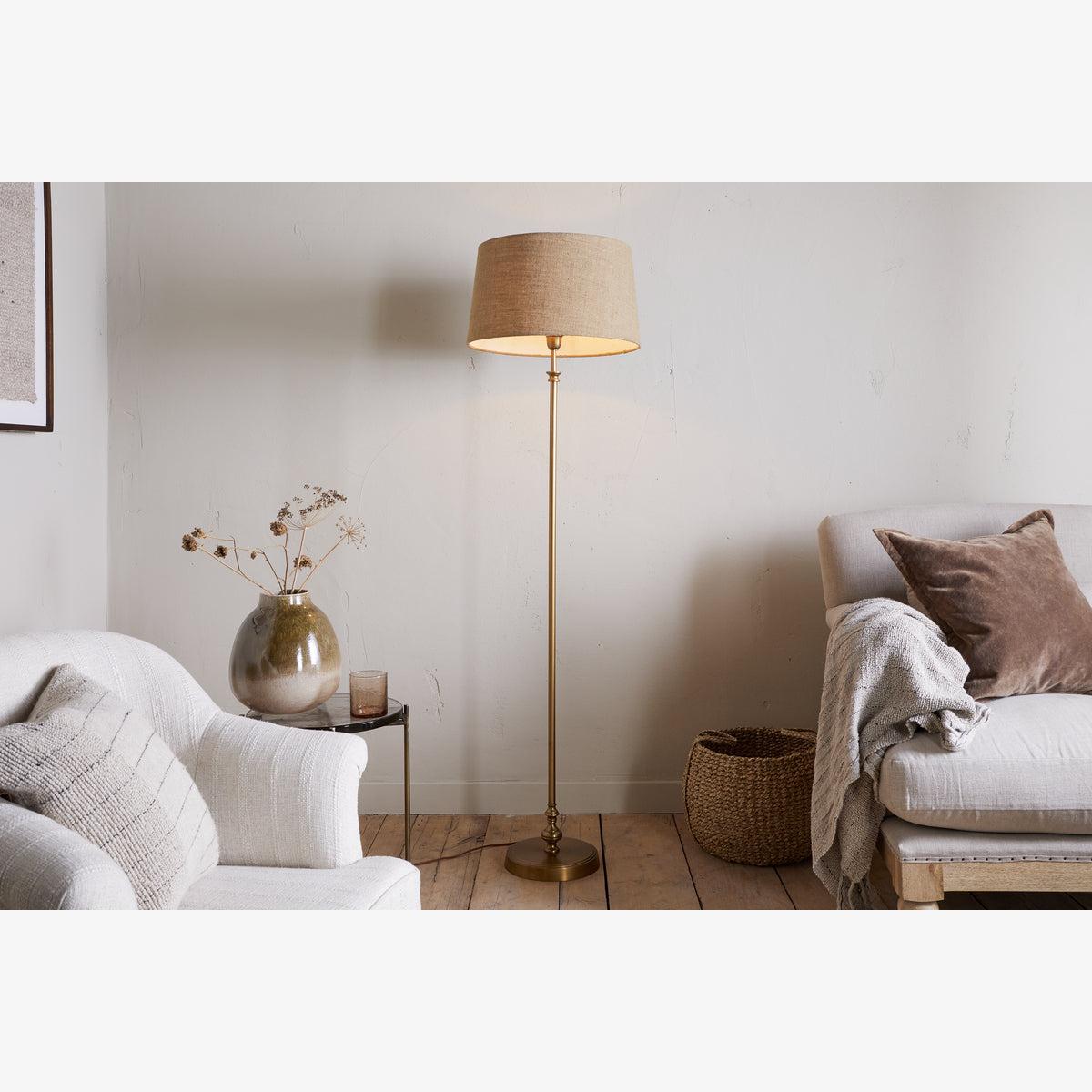 I love this metal floor lamp for its classic yet contemporary feel, especially because of its antique brass finish which adds warmth and sophistication to a space. It works particularly well in cosy living rooms or reading corners, where its understated elegance can complement both modern and vintage interiors. For styling, I suggest pairing it with neutral or earthy tones to emphasise its rich brass tone, and placing it beside textured fabrics or woven accessories to enhance its tactile appeal. Keep the lighting soft with a warm bulb to create a welcoming atmosphere, and ensure it doesn’t overpower the room’s other design elements - it’s perfect for adding a subtle layer of sophistication.
