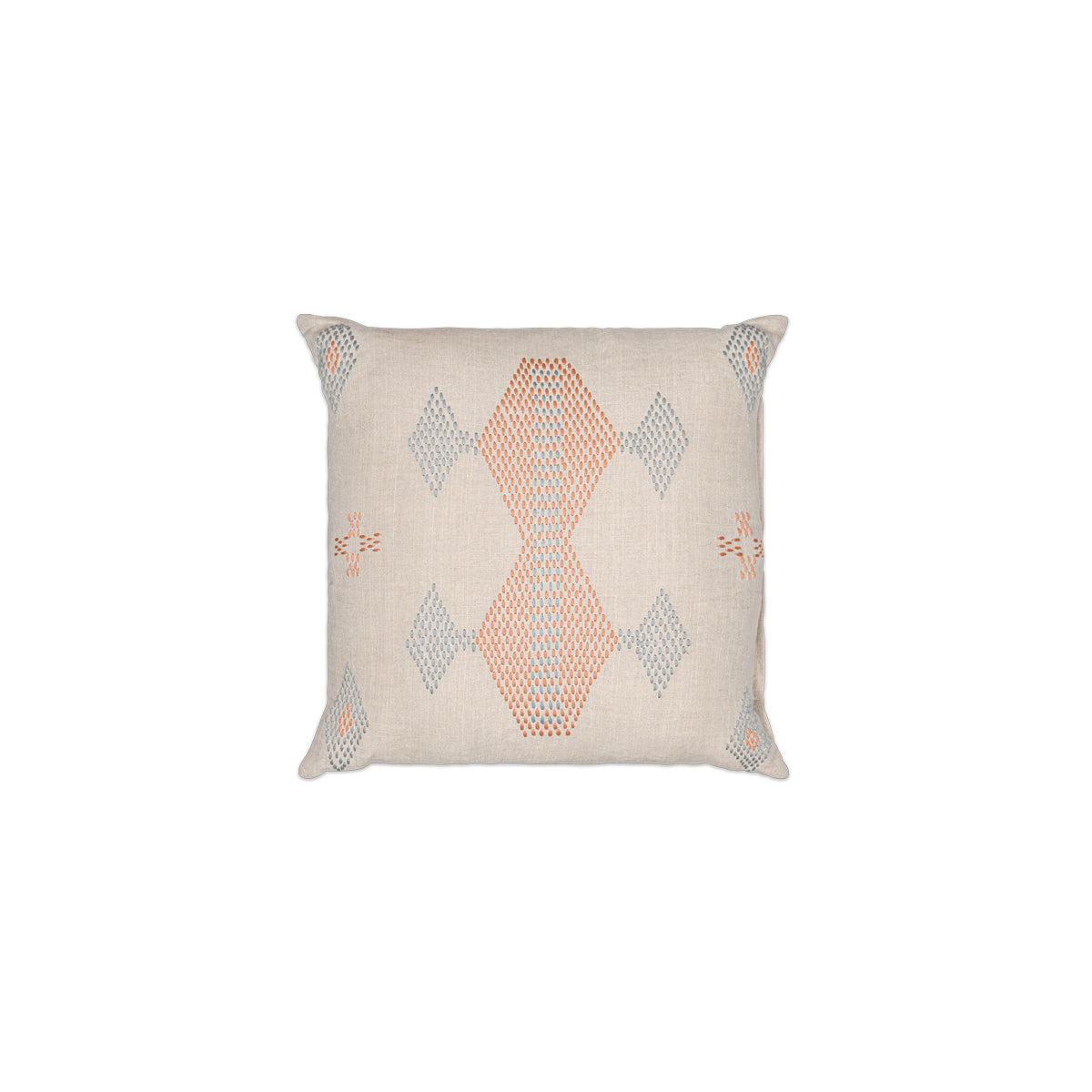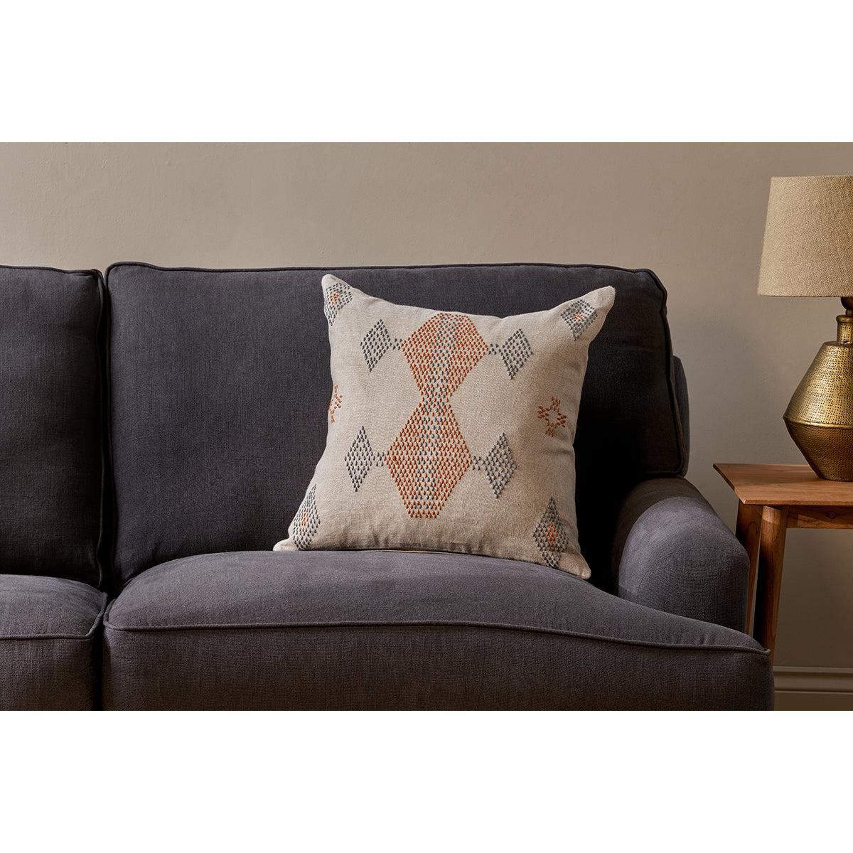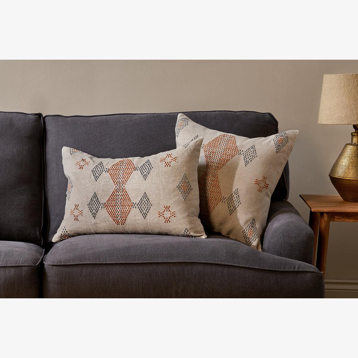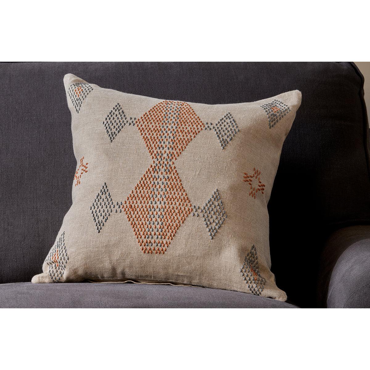 The Ekta embroidered linen cushion cover is crafted from a soft slubby linen. The calm natural hues are embellished with the eye - catching embroidery detail. The striking pattern is stitched from a beautiful palette of warm rust and soft sage green. Scatter cushions are an easy way to update an interior scheme adding a new colour tone and detail to your living space or bedroom. The rust and sage green bring a welcome pop of colour.