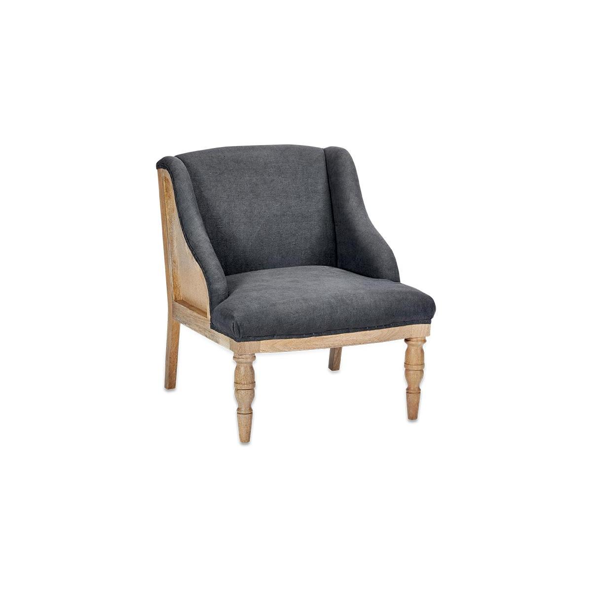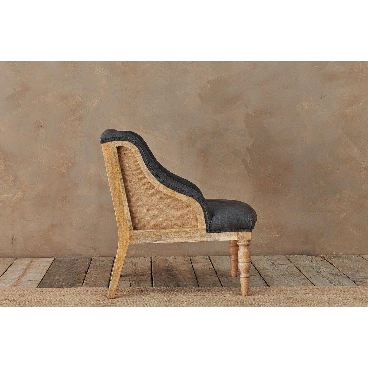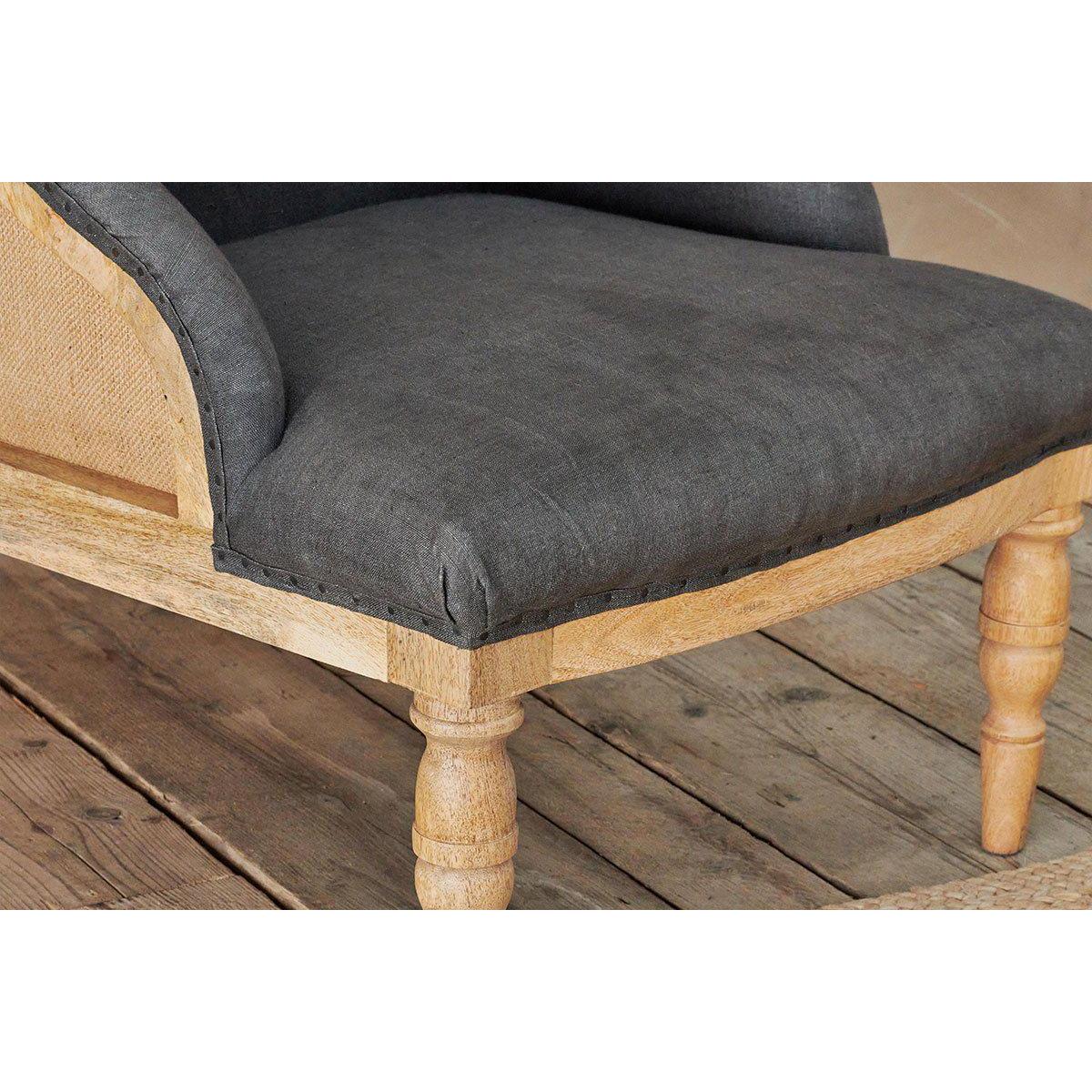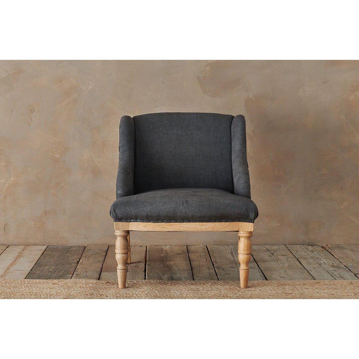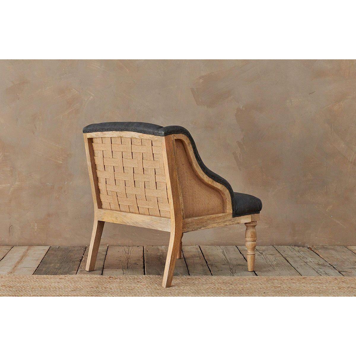 Our Ebu upholstered chair is a timeless classic with a twist, the deconstructed back and sides reveals a natural mango wood frame and hemp lining. The front is upholstered in a charcoal, tactile linen. These beautifully crafted pieces make a subtle and elegant addition to a living room or bedroom. | nkuku Elbu Deconstructed Linen Armchair | Seating | Charcoal | 75 x 60 x 66 cm