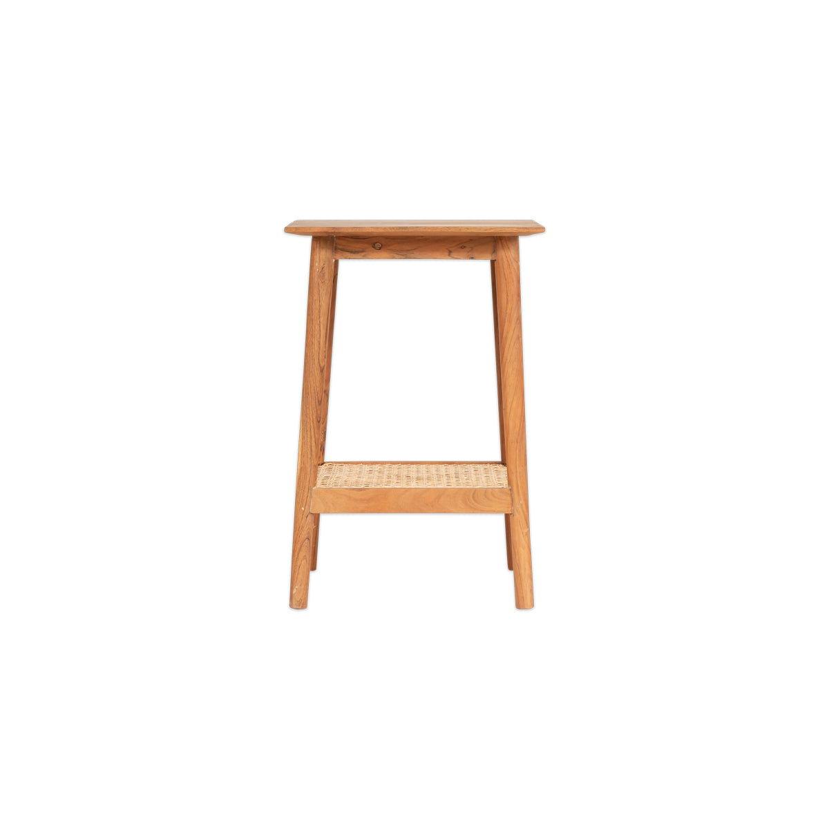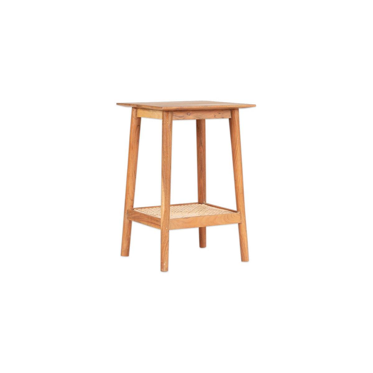 The simple design of this elegant Erabar Side Table is defined by the warm tones of acacia wood and cane. The low shelf has an attractive and skillful woven cane detail that adds an appealing creative touch. The wood has a sandblasted finish that adds texture and character. Position in a bedroom as a practical side table, perfect for holding a table lamp and book, or add a natural element to a living space. The warm tones of the acacia and the natural grain of the wood provide a subtle point of difference.