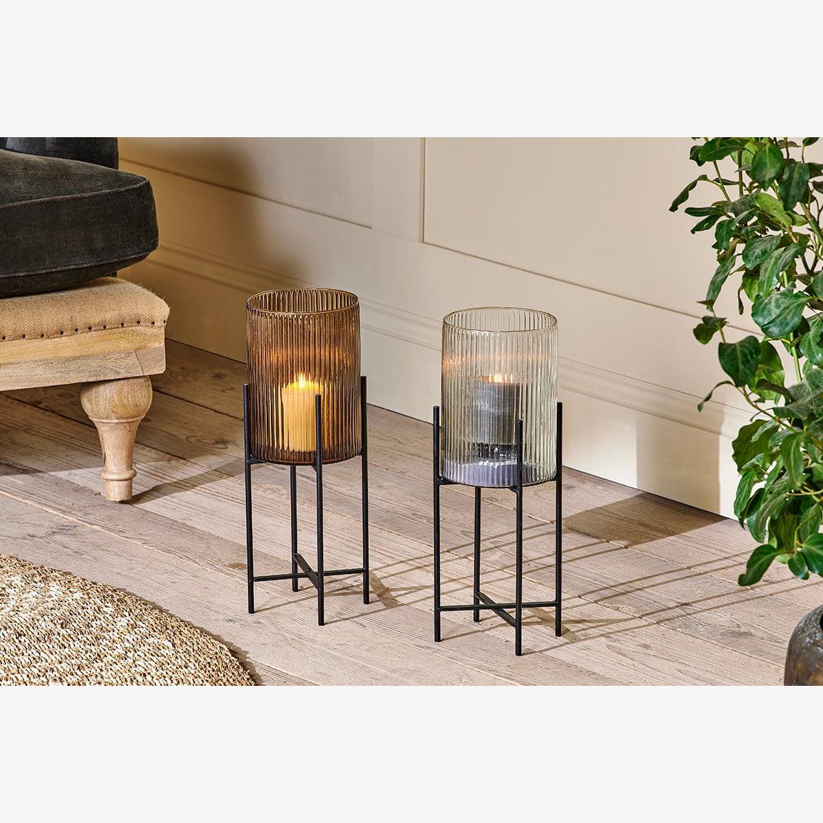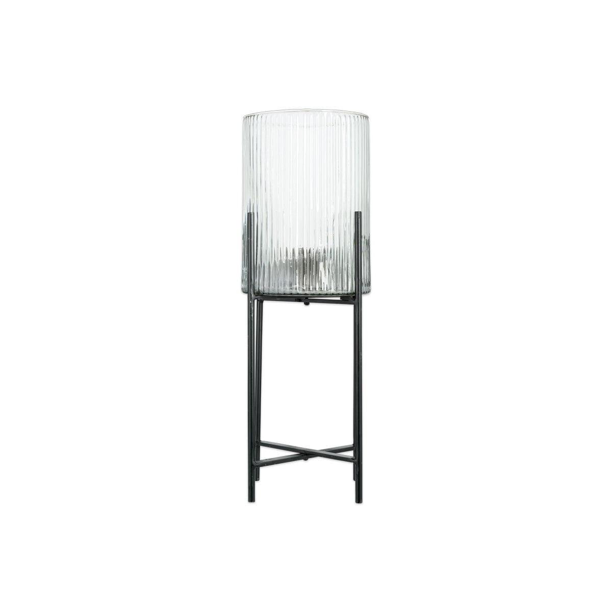 Set an ambient mood with the Eskaya standing glass lantern. The ribbed glass finish on this cylindrical shaped lantern gently filters the candlelight. The simple black stand elevates the lantern to create more impact. The Eskaya standing lantern is the ideal piece to light up a dark corner in a room or transport it outside on warmer evenings and add some soft lighting to an alfresco scene. The Eskaya standing lantern is crafted from recycled glass and has clear glass finish.