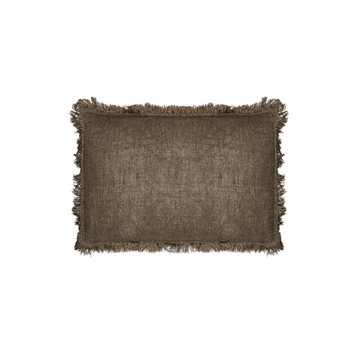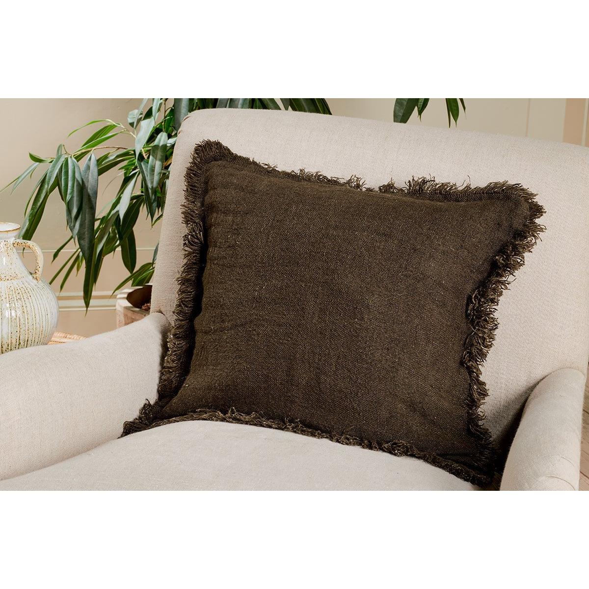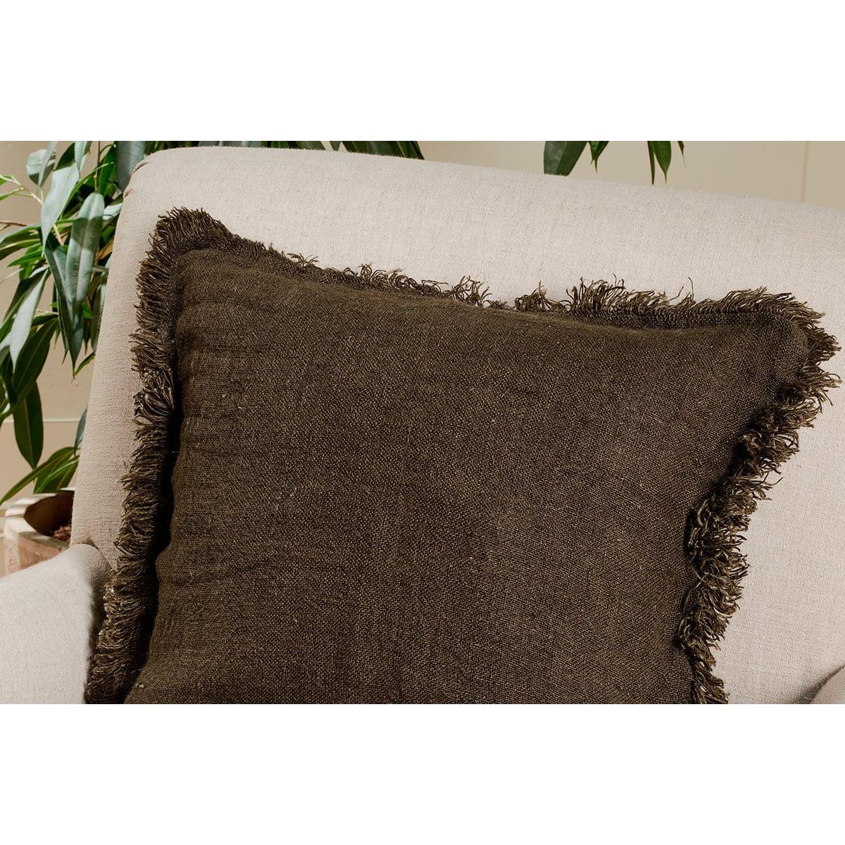 The dark charcoal tones of the Feo linen cushion cover sit well on the slubby, relaxed, handwoven linen. The addition of fringing adds character and interest to this eye - catching cushion cover. The Feo are designed to scatter in a mix of colours and the charcoal contrasts perfectly against a variety of backdrops. Style with our natural linen Feo linen cushion cover.