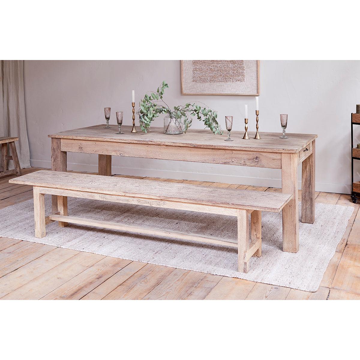 Our new is admired not only for its warmth and effortless simplicity, but for the fact that it welcomes in a new material to the nkuku range. The Fioni design uses reclaimed wooden ceiling beams from India where they are repurposed and handcrafted to create unique and timeless pieces that offer the perfect foundation for an understated dining area. Sanded and lightly finished with a white wash, the mixed woods are harmonised in appearance yet still allow for subtle variations in tone and grain to shine through, lending a laidback farmhouse aesthetic to the overall look of this well proportioned bench.