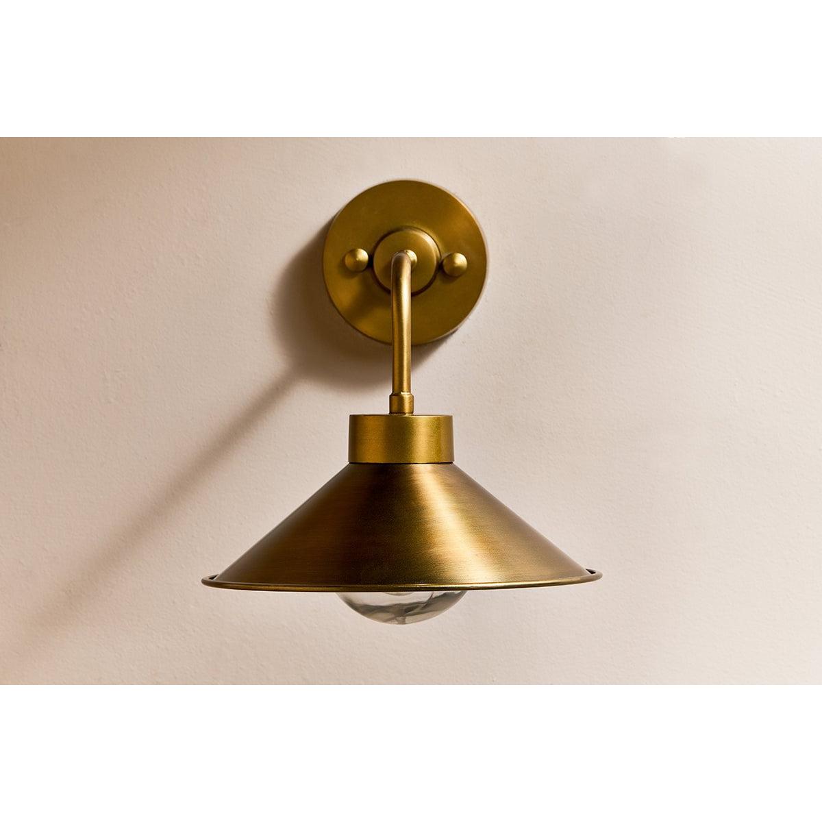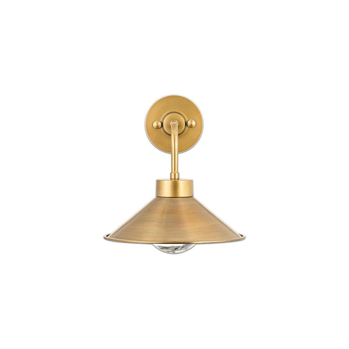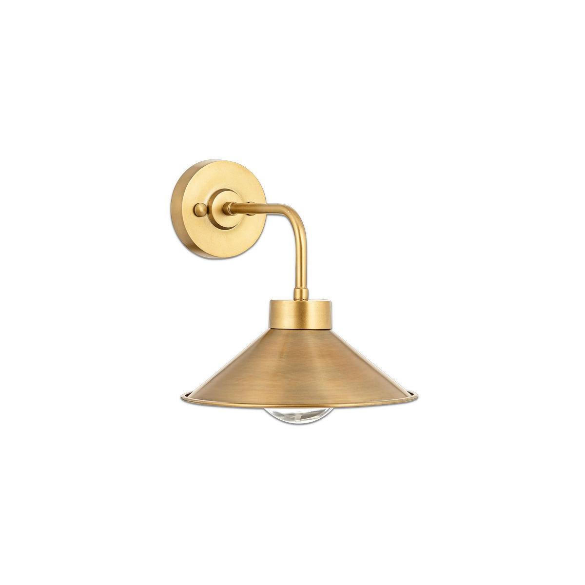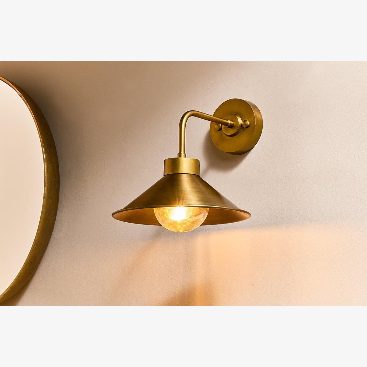 The Galgao bathroom wall light has an attractive cone shaped antique brass shade and clear glass globe. Antique brass and glass are timeless materials that display elegantly together. The globe has a hammered finish that provides a soft diffusion of light. The Galgao works well in pairs, in a traditional format either side of a mirror.