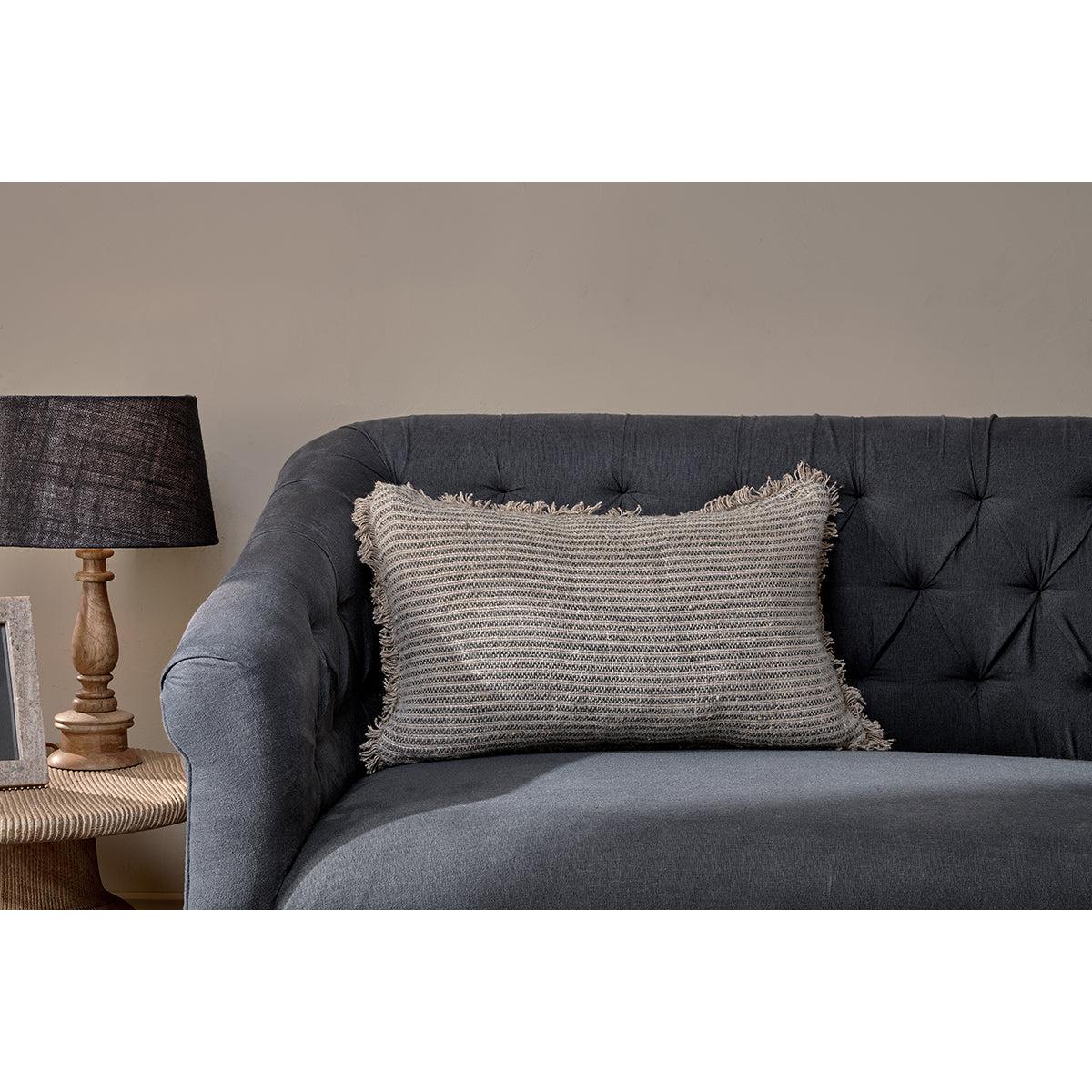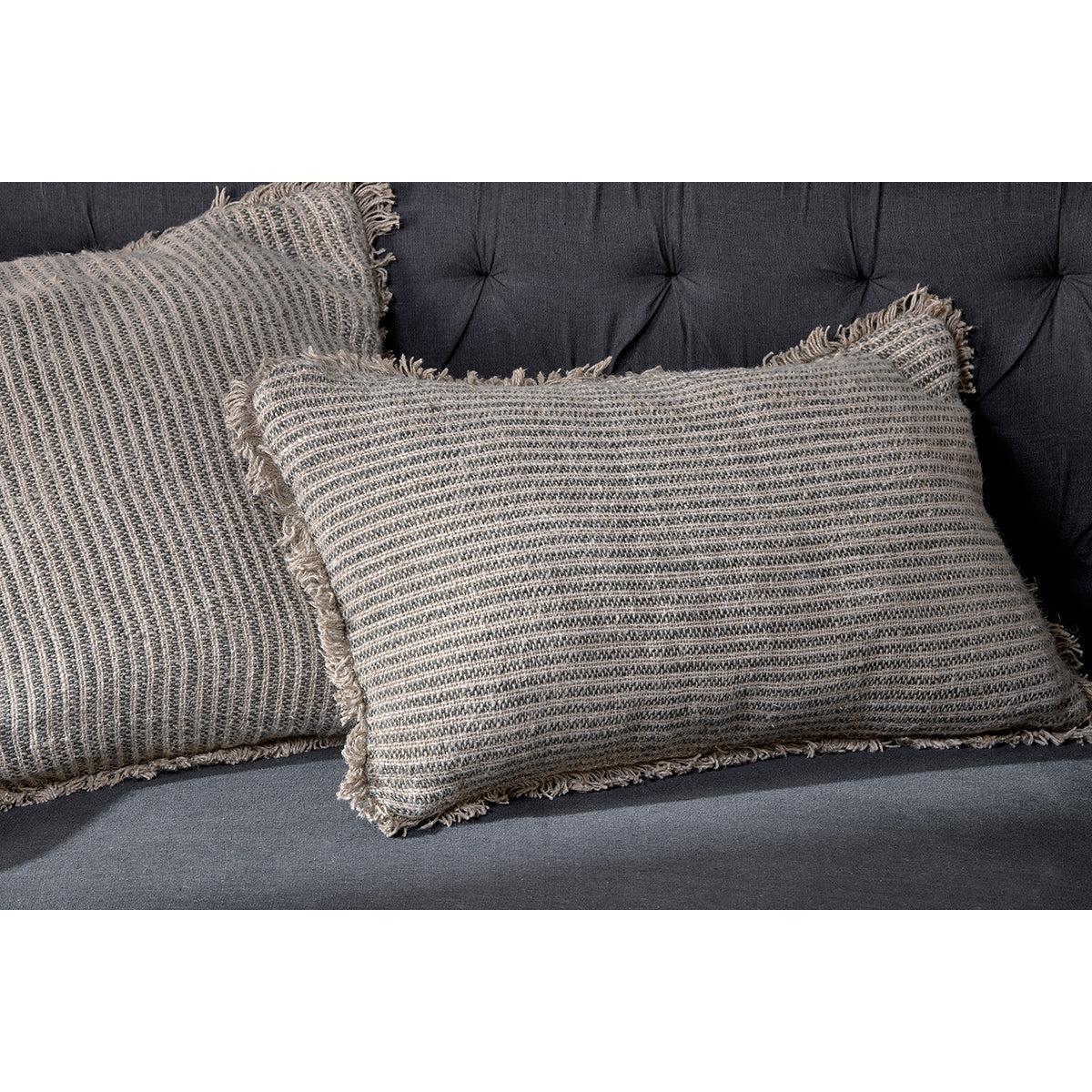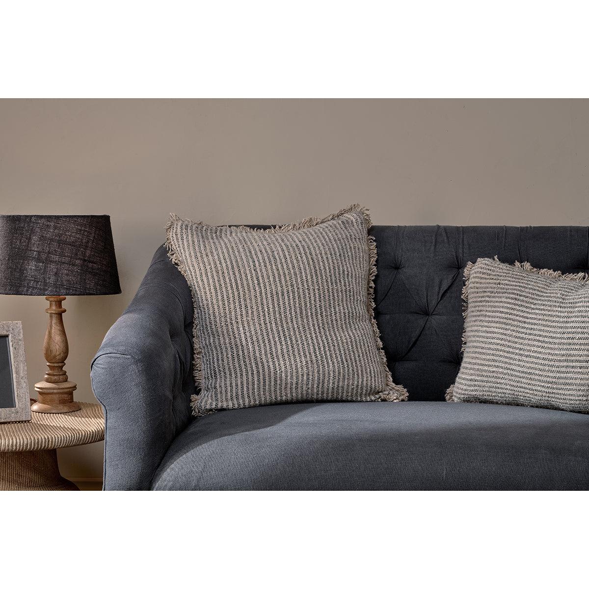 The linen Gili cushion blends a subtle, soft green stripe design with a softly textured finish for a laidback, understated look. Woven on traditional looms from pure linen for an organic and tactile feel, the lines blur softly between the colours for a muted natural effect. The fringed edges add to the relaxed aesthetic that will beautifully complement a natural scheme or highlight a darker sofa or armchair. Please note, this is the outer cover only. Available in two sizes.