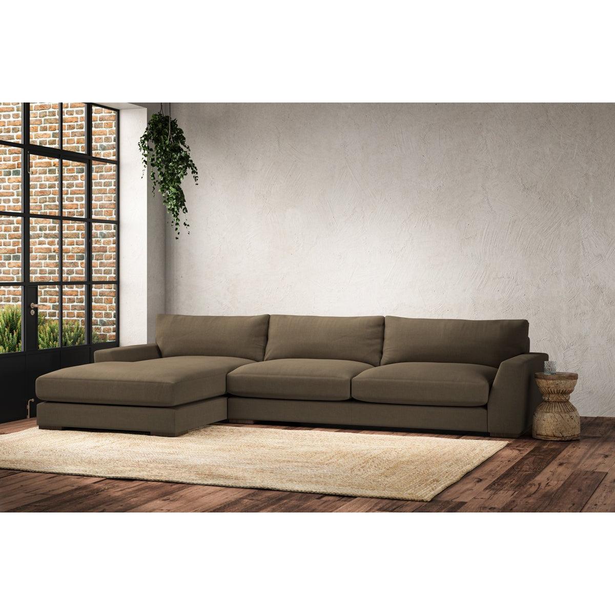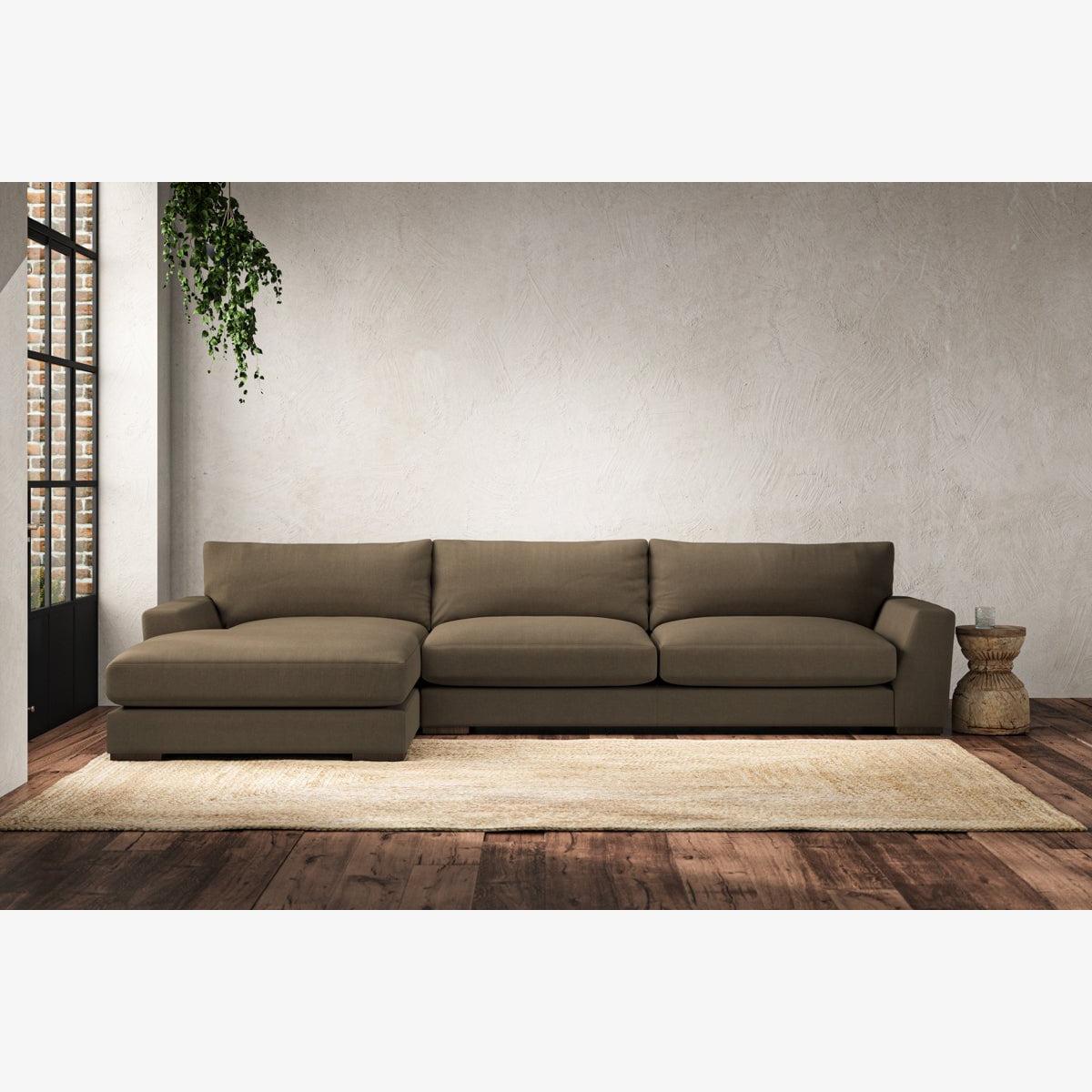 The laid-back sculptural shape of the Guddu grand left hand chaise sofa brings effortless style to an interior. The generous arms and deep seat cushions make this collection the perfect choice for families or those that like a bit of extra space to stretch out. Details include separate back cushions, exceptional quality fabrics and solid wood block feet. Each piece is handcrafted by experts using traditional techniques for a quality finish that celebrates the best of British craftmanship. The hardwood frame and high-grade steel serpentine springs are selected for enduring quality, and the cushions are made from foam with a fibre wrap for added comfort. The fabric is hand cut to size, playing close attention to the characteristics of the material, and the sculpted hardwood feet provides the finishing detail. Our upholstery fabrics are sourced from Italy’s finest mills and are chosen for their style and quality. We have selected a beautiful heavyweight, soft washed linen with an outstanding texture. Our linen is perfectly suited to upholstery, with an appealing natural, and tactile feel. It is also heavy and durable. The linen is FR treated for domestic upholstery ensuring peace of mind as well as meeting specialist UK furniture requirements. Our curated colour palette offers a variety of 11 sophisticated muted shades. Please note, our white background cut-out photography is shown in Natural for shape and style reference. Fabric Swatch Ordering We recommend ordering fabric swatches before placing your order, giving you the chance to feel the fabric and see your colour choices within your own home. You can order up to 6 free fabric swatches by clicking here. Before placing your order, it's important to take the time to measure the space you intend to place your made-to-order furniture to ensure it fits properly. You can read more in our Sofa Buying Guide.