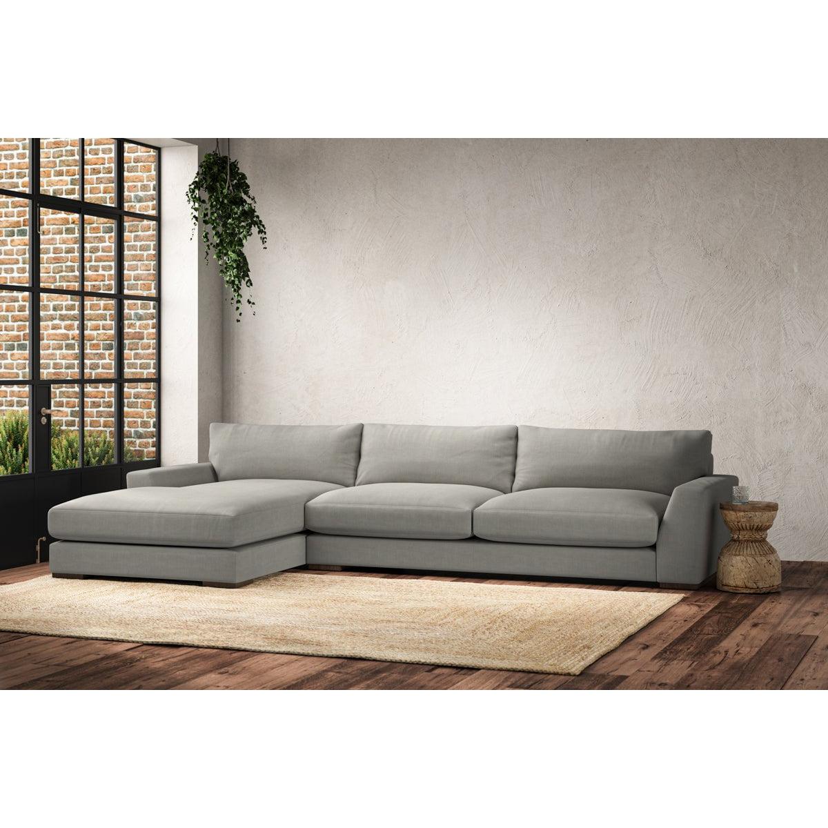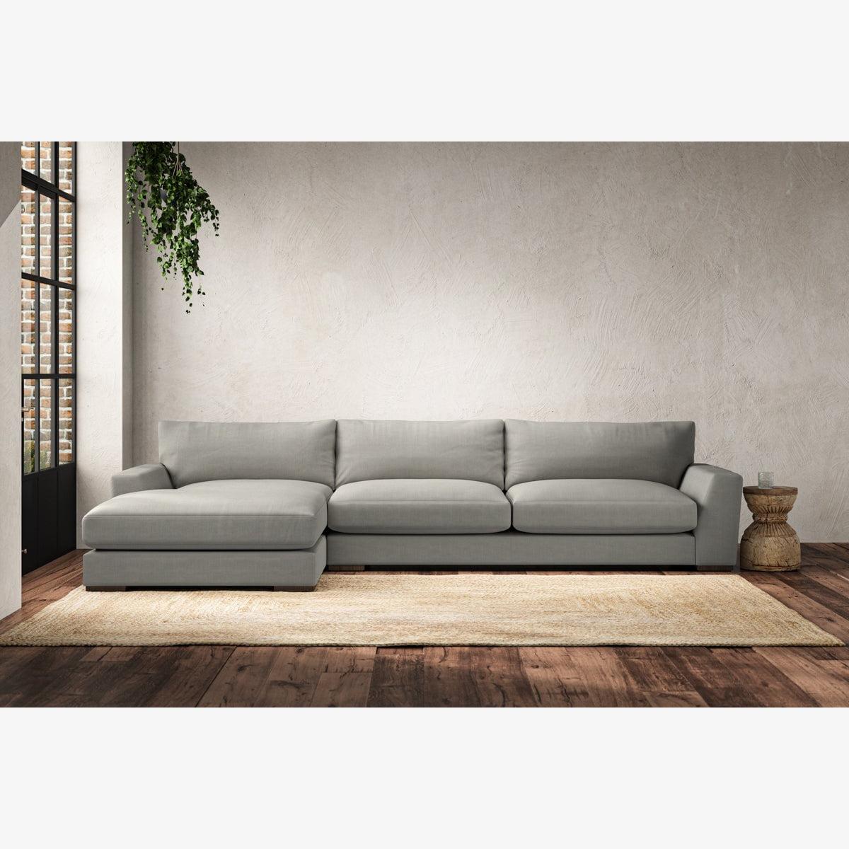 The laid-back sculptural shape of the Guddu grand left hand chaise sofa brings effortless style to an interior. The generous arms and deep seat cushions make this collection the perfect choice for families or those that like a bit of extra space to stretch out. Details include separate back cushions, exceptional quality fabrics and solid wood block feet. Each piece is handcrafted by experts using traditional techniques for a quality finish that celebrates the best of British craftmanship. The hardwood frame and high-grade steel serpentine springs are selected for enduring quality, and the cushions are made from foam with a fibre wrap for added comfort. The fabric is hand cut to size, playing close attention to the characteristics of the material, and the sculpted hardwood feet provides the finishing detail. Our upholstery fabrics are sourced from Italy’s finest mills and are chosen for their style and quality. We have selected a beautiful heavyweight, soft washed linen with an outstanding texture. Our linen is perfectly suited to upholstery, with an appealing natural, and tactile feel. It is also heavy and durable. The linen is FR treated for domestic upholstery ensuring peace of mind as well as meeting specialist UK furniture requirements. Our curated colour palette offers a variety of 11 sophisticated muted shades. Please note, our white background cut-out photography is shown in Natural for shape and style reference. Fabric Swatch Ordering We recommend ordering fabric swatches before placing your order, giving you the chance to feel the fabric and see your colour choices within your own home. You can order up to 6 free fabric swatches by clicking here. Before placing your order, it's important to take the time to measure the space you intend to place your made-to-order furniture to ensure it fits properly. You can read more in our Sofa Buying Guide.