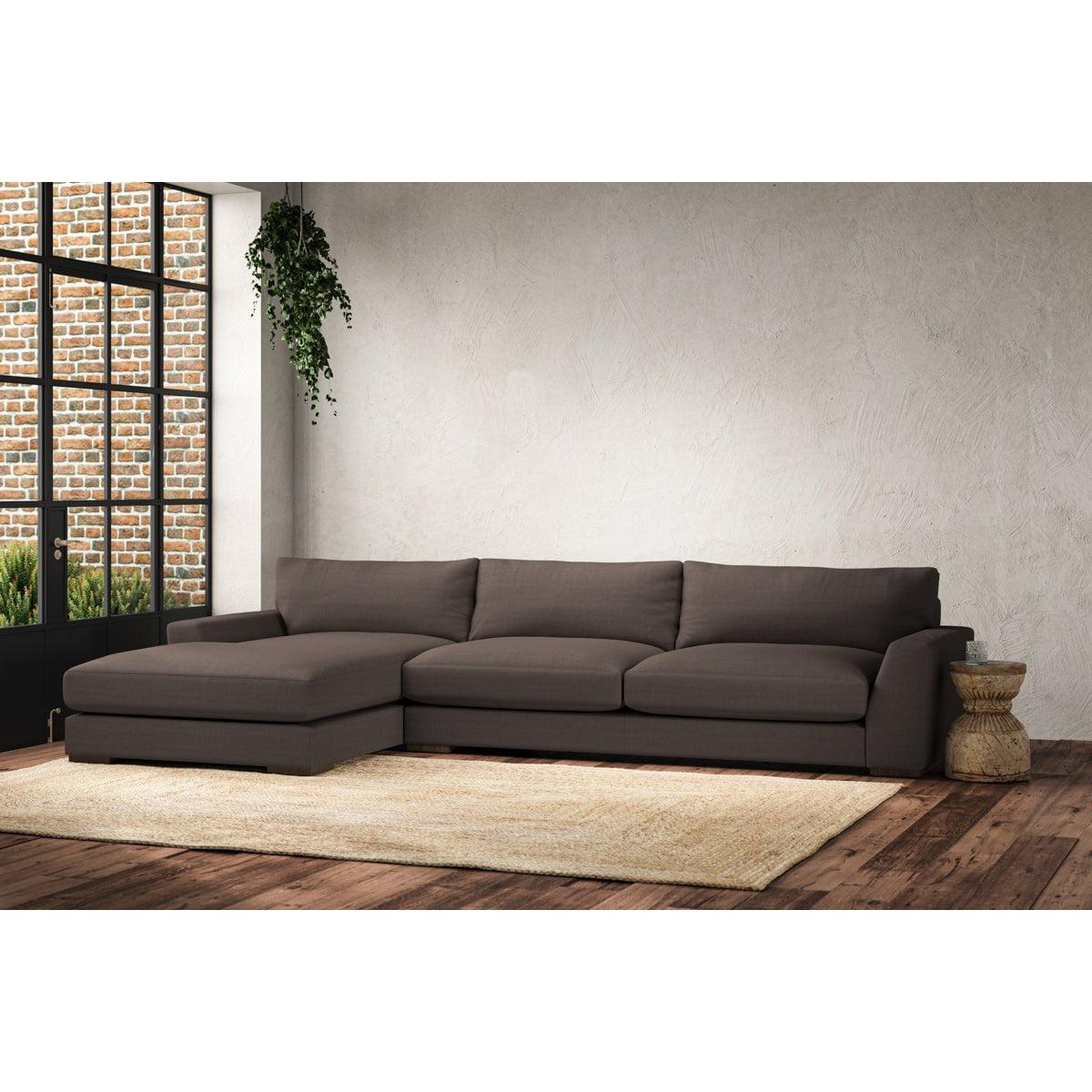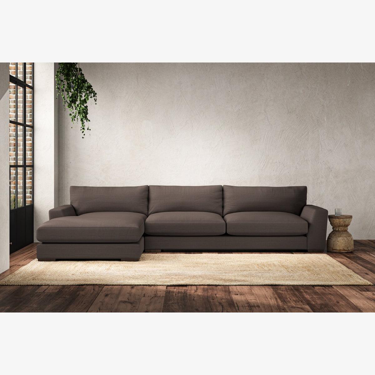 The laid-back sculptural shape of the Guddu grand left hand chaise sofa brings effortless style to an interior. The generous arms and deep seat cushions make this collection the perfect choice for families or those that like a bit of extra space to stretch out. Details include separate back cushions, exceptional quality fabrics and solid wood block feet. Each piece is handcrafted by experts using traditional techniques for a quality finish that celebrates the best of British craftmanship. The hardwood frame and high-grade steel serpentine springs are selected for enduring quality, and the cushions are made from foam with a fibre wrap for added comfort. The fabric is hand cut to size, playing close attention to the characteristics of the material, and the sculpted hardwood feet provides the finishing detail. Our upholstery fabrics are chosen for their style and quality, where all fabrics are FR treated for domestic upholstery ensuring peace of mind as well as meeting specialist UK furniture requirements. Our curated colour palette offers a variety of sophisticated muted shades. Please note, our white background cut-out photography is shown in Natural for shape and style reference. Fabric Swatch Ordering We recommend ordering fabric swatches before placing your order, giving you the chance to feel the fabric and see your colour choices within your own home. You can order up to 6 free fabric swatches by clicking here. Before placing your order, it's important to take the time to measure the space you intend to place your made-to-order furniture to ensure it fits properly. You can read more in our Sofa Buying Guide.