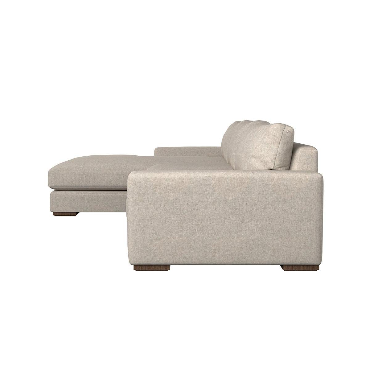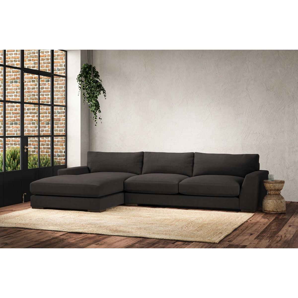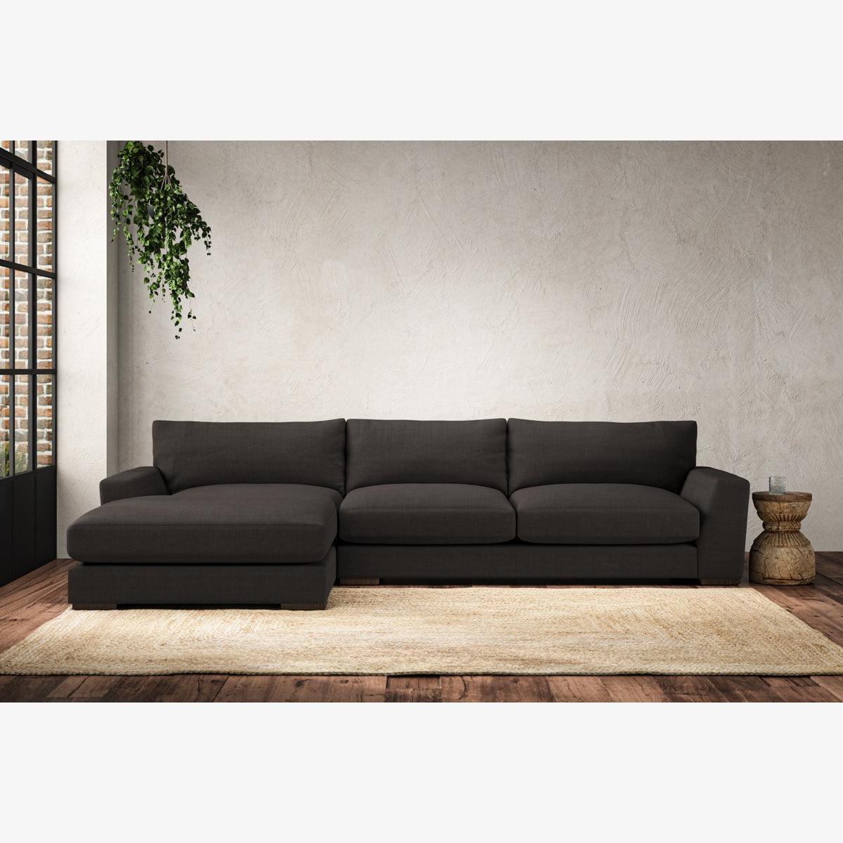 The laid-back sculptural shape of the Guddu large left hand chaise sofa brings effortless style to an interior. The generous arms and deep seat cushions make this collection the perfect choice for families or those that like a bit of extra space to stretch out. Details include separate back cushions, exceptional quality fabrics and solid wood block feet. Each piece is handcrafted by experts using traditional techniques for a quality finish that celebrates the best of British craftmanship. The hardwood frame and high-grade steel serpentine springs are selected for enduring quality, and the cushions are made from foam with a fibre wrap for added comfort. The fabric is hand cut to size, playing close attention to the characteristics of the material, and the sculpted hardwood feet provides the finishing detail. Our upholstery fabrics are sourced from Italy’s finest mills and are chosen for their style and quality. We have selected a beautiful heavyweight, soft washed linen with an outstanding texture. Our linen is perfectly suited to upholstery, with an appealing natural, and tactile feel. It is also heavy and durable. The linen is FR treated for domestic upholstery ensuring peace of mind as well as meeting specialist UK furniture requirements. Our curated colour palette offers a variety of 11 sophisticated muted shades. Please note, our white background cut-out photography is shown in Natural for shape and style reference. Fabric Swatch Ordering We recommend ordering fabric swatches before placing your order, giving you the chance to feel the fabric and see your colour choices within your own home. You can order up to 6 free fabric swatches by clicking here. Before placing your order, it's important to take the time to measure the space you intend to place your made-to-order furniture to ensure it fits properly. You can read more in our Sofa Buying Guide.