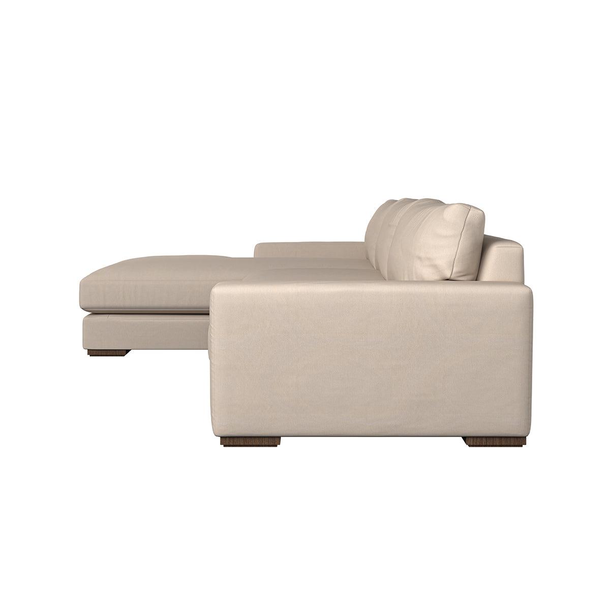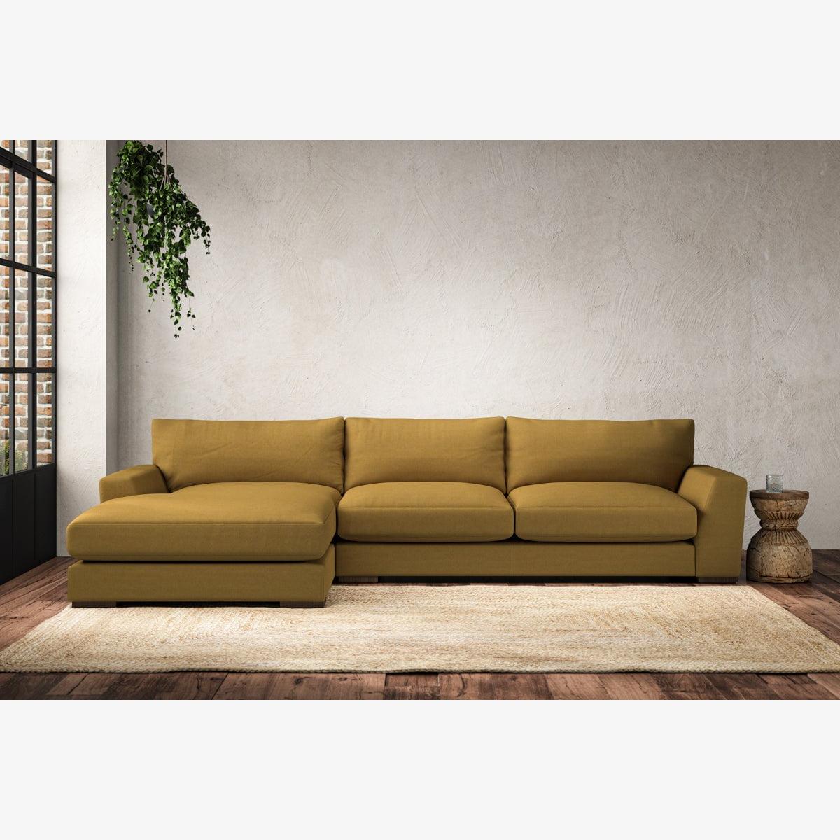 The laid-back sculptural shape of the Guddu large left hand chaise sofa brings effortless style to an interior. The generous arms and deep seat cushions make this collection the perfect choice for families or those that like a bit of extra space to stretch out. Details include separate back cushions, exceptional quality fabrics and solid wood block feet. Each piece is handcrafted by experts using traditional techniques for a quality finish that celebrates the best of British craftmanship. The hardwood frame and high-grade steel serpentine springs are selected for enduring quality, and the cushions are made from foam with a fibre wrap for added comfort. The fabric is hand cut to size, playing close attention to the characteristics of the material, and the sculpted hardwood feet provides the finishing detail. Our upholstery fabrics are chosen for their style and quality, where all fabrics are FR treated for domestic upholstery ensuring peace of mind as well as meeting specialist UK furniture requirements. Our curated colour palette offers a variety of sophisticated muted shades. Please note, our white background cut-out photography is shown in Natural for shape and style reference. Fabric Swatch Ordering We recommend ordering fabric swatches before placing your order, giving you the chance to feel the fabric and see your colour choices within your own home. You can order up to 6 free fabric swatches by clicking here. Before placing your order, it's important to take the time to measure the space you intend to place your made-to-order furniture to ensure it fits properly. You can read more in our Sofa Buying Guide.