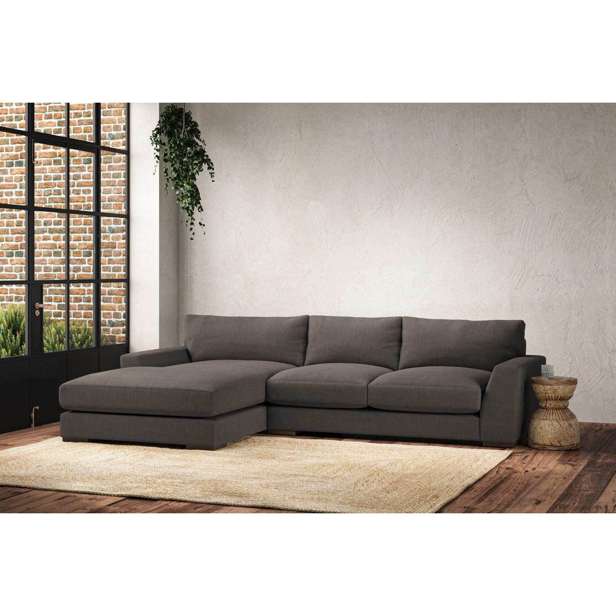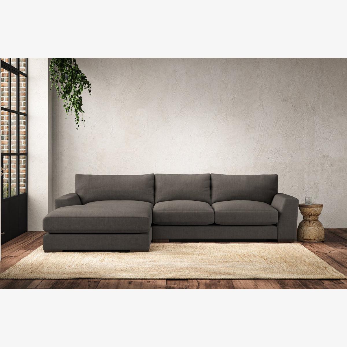 The laid-back sculptural shape of the Guddu medium left hand chaise sofa brings effortless style to an interior. The generous arms and deep seat cushions make this collection the perfect choice for families or those that like a bit of extra space to stretch out. Details include separate back cushions, exceptional quality fabrics and solid wood block feet. Each piece is handcrafted by experts using traditional techniques for a quality finish that celebrates the best of British craftmanship. The hardwood frame and high-grade steel serpentine springs are selected for enduring quality, and the cushions are made from foam with a fibre wrap for added comfort. The fabric is hand cut to size, playing close attention to the characteristics of the material, and the sculpted hardwood feet provides the finishing detail. Our upholstery fabrics are sourced from Italy’s finest mills and are chosen for their style and quality. We have selected a beautiful heavyweight, soft washed linen with an outstanding texture. Our linen is perfectly suited to upholstery, with an appealing natural, and tactile feel. It is also heavy and durable. The linen is FR treated for domestic upholstery ensuring peace of mind as well as meeting specialist UK furniture requirements. Our curated colour palette offers a variety of 11 sophisticated muted shades. Please note, our white background cut-out photography is shown in Natural for shape and style reference. Fabric Swatch Ordering We recommend ordering fabric swatches before placing your order, giving you the chance to feel the fabric and see your colour choices within your own home. You can order up to 6 free fabric swatches by clicking here. Before placing your order, it's important to take the time to measure the space you intend to place your made-to-order furniture to ensure it fits properly. You can read more in our Sofa Buying Guide.