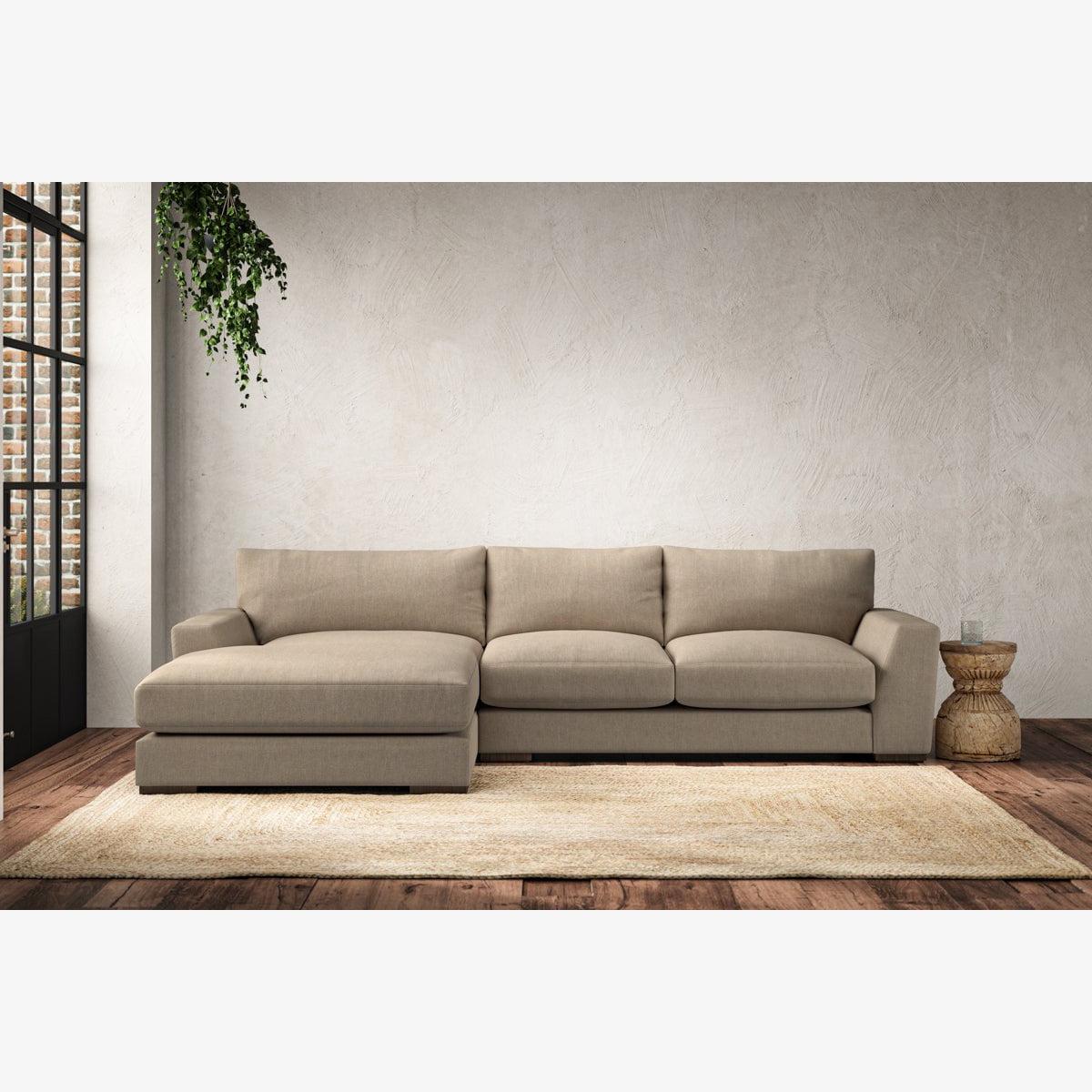 The laid-back sculptural shape of the Guddu medium left hand chaise sofa brings effortless style to an interior. The generous arms and deep seat cushions make this collection the perfect choice for families or those that like a bit of extra space to stretch out. Details include separate back cushions, exceptional quality fabrics and solid wood block feet. Each piece is handcrafted by experts using traditional techniques for a quality finish that celebrates the best of British craftmanship. The hardwood frame and high-grade steel serpentine springs are selected for enduring quality, and the cushions are made from foam with a fibre wrap for added comfort. The fabric is hand cut to size, playing close attention to the characteristics of the material, and the sculpted hardwood feet provides the finishing detail. Our upholstery fabrics are sourced from Italy’s finest mills and are chosen for their style and quality. We have selected a beautiful heavyweight, soft washed linen with an outstanding texture. Our linen is perfectly suited to upholstery, with an appealing natural, and tactile feel. It is also heavy and durable. The linen is FR treated for domestic upholstery ensuring peace of mind as well as meeting specialist UK furniture requirements. Our curated colour palette offers a variety of 11 sophisticated muted shades. Please note, our white background cut-out photography is shown in Natural for shape and style reference. Fabric Swatch Ordering We recommend ordering fabric swatches before placing your order, giving you the chance to feel the fabric and see your colour choices within your own home. You can order up to 6 free fabric swatches by clicking here. Before placing your order, it's important to take the time to measure the space you intend to place your made-to-order furniture to ensure it fits properly. You can read more in our Sofa Buying Guide.