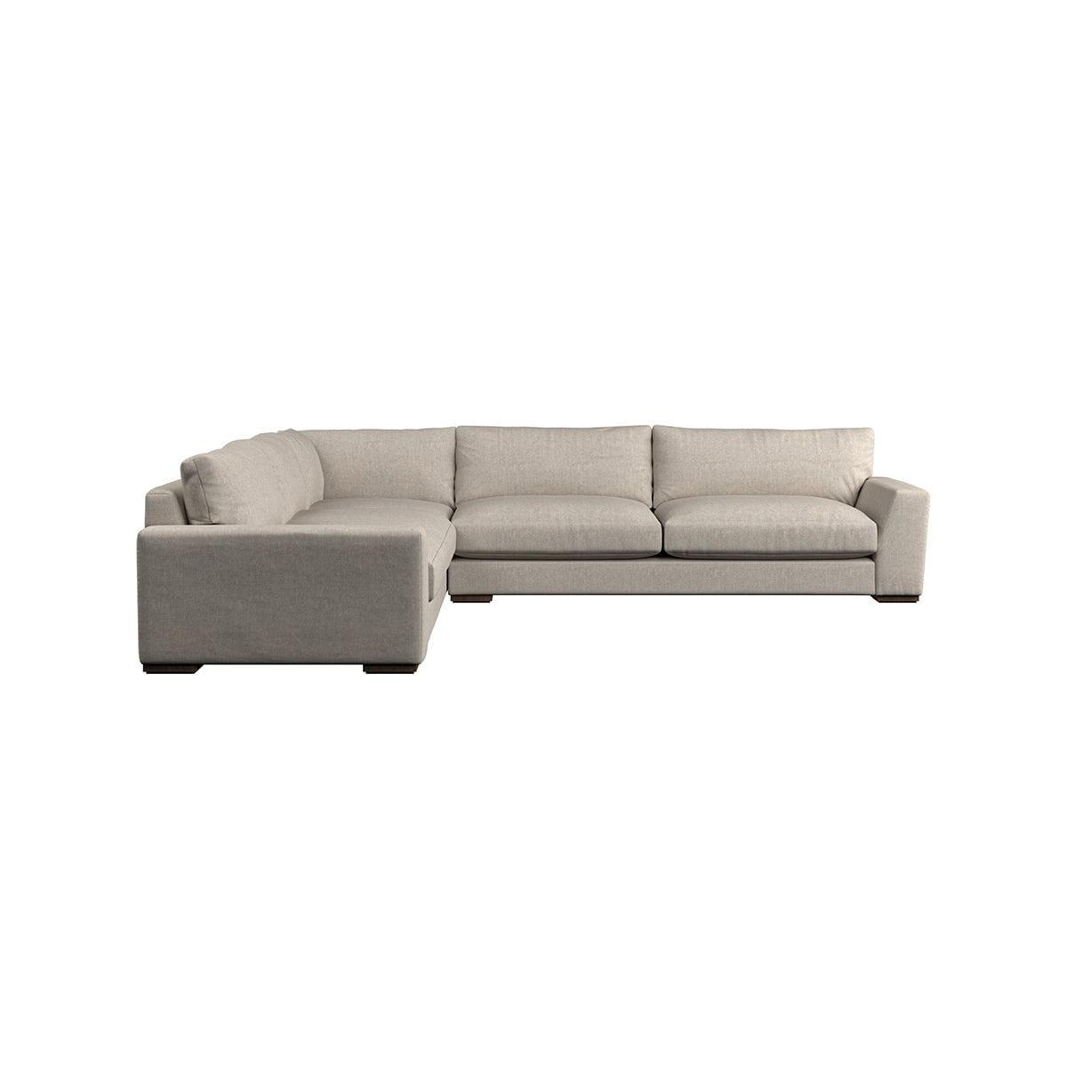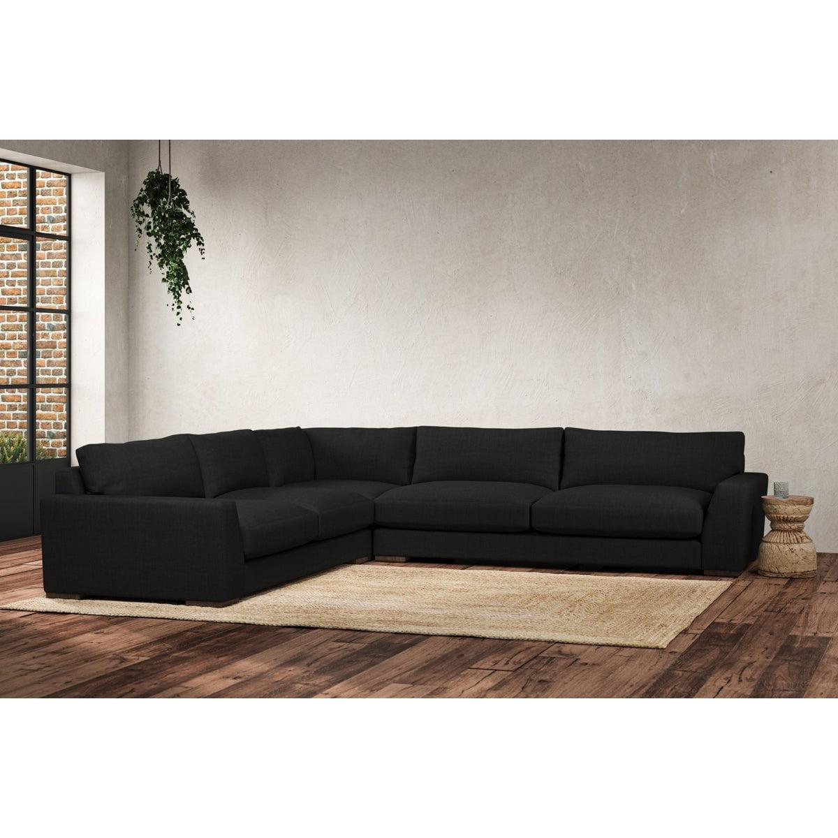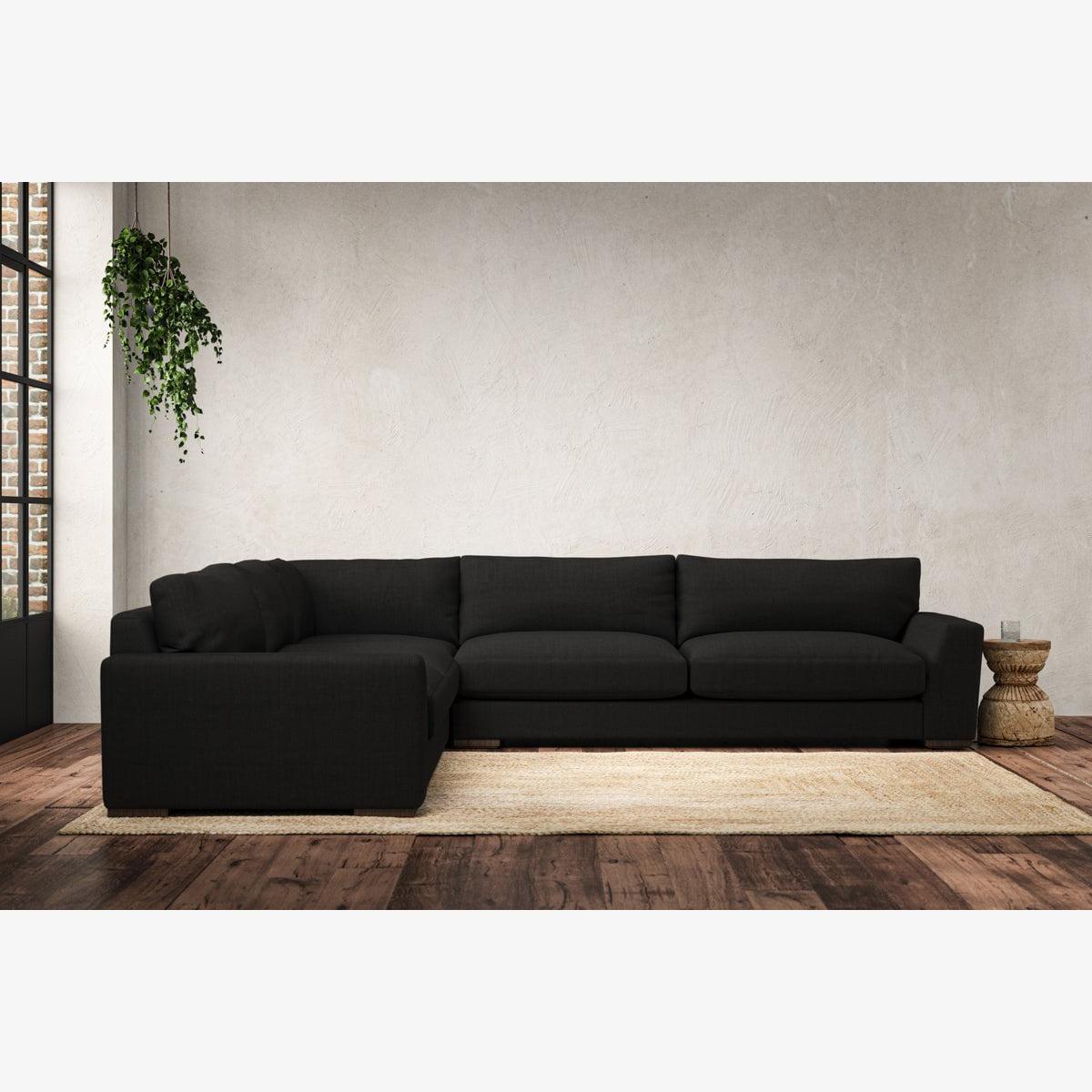 The laid-back sculptural shape of the Guddu grand left hand corner sofa brings effortless style to an interior. The generous arms and deep seat cushions make this collection the perfect choice for families or those that like a bit of extra space to stretch out. Details include separate back cushions, exceptional quality fabrics and solid wood block feet. Each piece is handcrafted by experts using traditional techniques for a quality finish that celebrates the best of British craftmanship. The hardwood frame and high-grade steel serpentine springs are selected for enduring quality, and the cushions are made from foam with a fibre wrap for added comfort. The fabric is hand cut to size, playing close attention to the characteristics of the material, and the sculpted hardwood feet provides the finishing detail. Our upholstery fabrics are sourced from Italy’s finest mills and are chosen for their style and quality. We have selected a beautiful heavyweight, soft washed linen with an outstanding texture. Our linen is perfectly suited to upholstery, with an appealing natural, and tactile feel. It is also heavy and durable. The linen is FR treated for domestic upholstery ensuring peace of mind as well as meeting specialist UK furniture requirements. Our curated colour palette offers a variety of 11 sophisticated muted shades. Please note, our white background cut-out photography is shown in Natural for shape and style reference. Fabric Swatch Ordering We recommend ordering fabric swatches before placing your order, giving you the chance to feel the fabric and see your colour choices within your own home. You can order up to 6 free fabric swatches by clicking here. Before placing your order, it's important to take the time to measure the space you intend to place your made-to-order furniture to ensure it fits properly. You can read more in our Sofa Buying Guide.