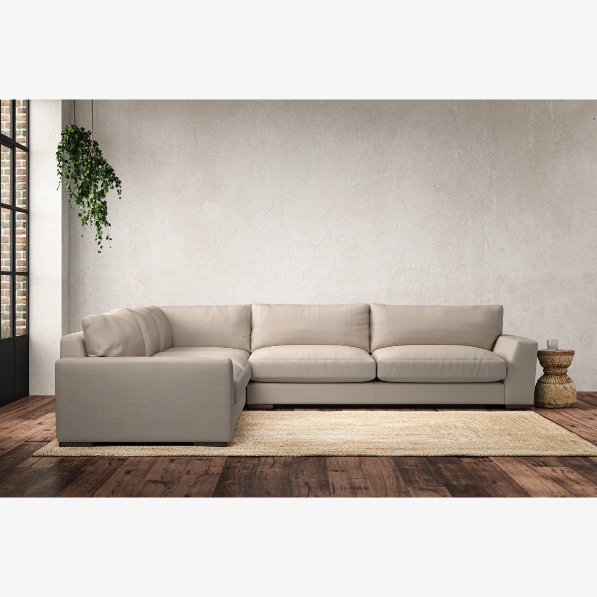 The laid-back sculptural shape of the Guddu grand left hand corner sofa brings effortless style to an interior. The generous arms and deep seat cushions make this collection the perfect choice for families or those that like a bit of extra space to stretch out. Details include separate back cushions, exceptional quality fabrics and solid wood block feet. Each piece is handcrafted by experts using traditional techniques for a quality finish that celebrates the best of British craftmanship. The hardwood frame and high-grade steel serpentine springs are selected for enduring quality, and the cushions are made from foam with a fibre wrap for added comfort. The fabric is hand cut to size, playing close attention to the characteristics of the material, and the sculpted hardwood feet provides the finishing detail. Our upholstery fabrics are chosen for their style and quality, where all fabrics are FR treated for domestic upholstery ensuring peace of mind as well as meeting specialist UK furniture requirements. Our curated colour palette offers a variety of sophisticated muted shades. Please note, our white background cut-out photography is shown in Natural for shape and style reference. Fabric Swatch OrderingWe recommend ordering fabric swatches before placing your order, giving you the chance to feel the fabric and see your colour choices within your own home. You can order up to 6 free fabric swatches by clicking here. it fit?Before placing your order, it's important to take the time to measure the space you intend to place your made-to-order furniture to ensure it fits properly. You can read more in our Sofa Buying Guide.