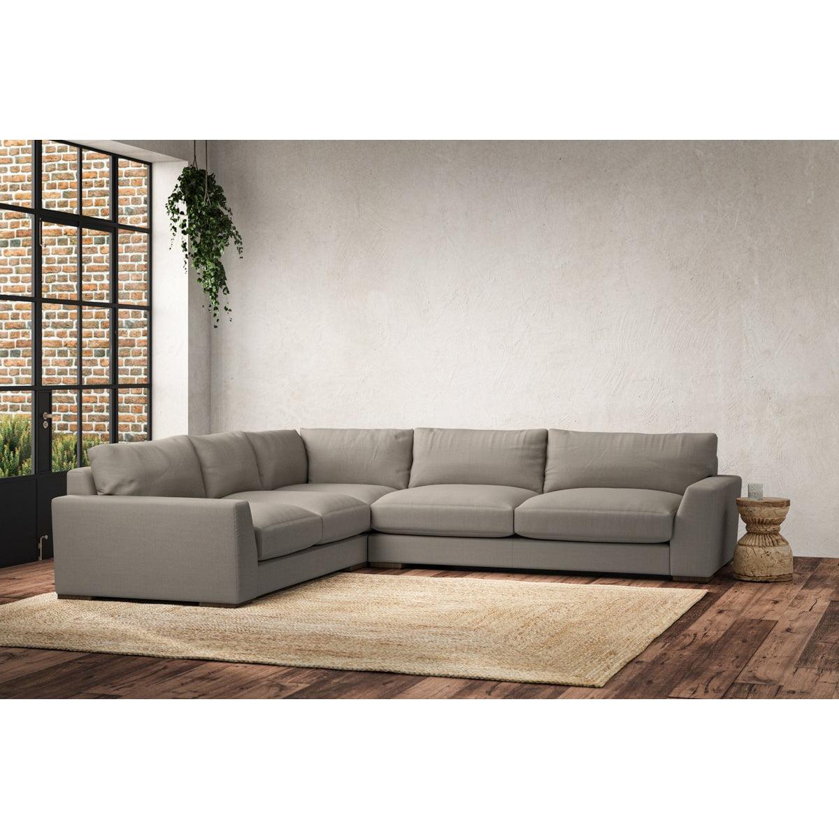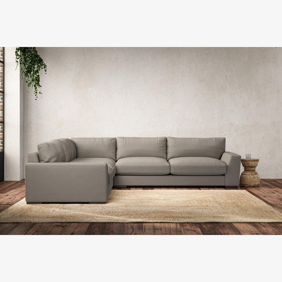 The laid-back sculptural shape of the Guddu large left hand corner sofa brings effortless style to an interior. The generous arms and deep seat cushions make this collection the perfect choice for families or those that like a bit of extra space to stretch out. Details include separate back cushions, exceptional quality fabrics and solid wood block feet. Each piece is handcrafted by experts using traditional techniques for a quality finish that celebrates the best of British craftmanship. The hardwood frame and high-grade steel serpentine springs are selected for enduring quality, and the cushions are made from foam with a fibre wrap for added comfort. The fabric is hand cut to size, playing close attention to the characteristics of the material, and the sculpted hardwood feet provides the finishing detail. Our upholstery fabrics are chosen for their style and quality, where all fabrics are FR treated for domestic upholstery ensuring peace of mind as well as meeting specialist UK furniture requirements. Our curated colour palette offers a variety of sophisticated muted shades. Please note, our white background cut-out photography is shown in Natural for shape and style reference. Fabric Swatch OrderingWe recommend ordering fabric swatches before placing your order, giving you the chance to feel the fabric and see your colour choices within your own home. You can order up to 6 free fabric swatches by clicking here. it fit?Before placing your order, it's important to take the time to measure the space you intend to place your made-to-order furniture to ensure it fits properly. You can read more in our Sofa Buying Guide.