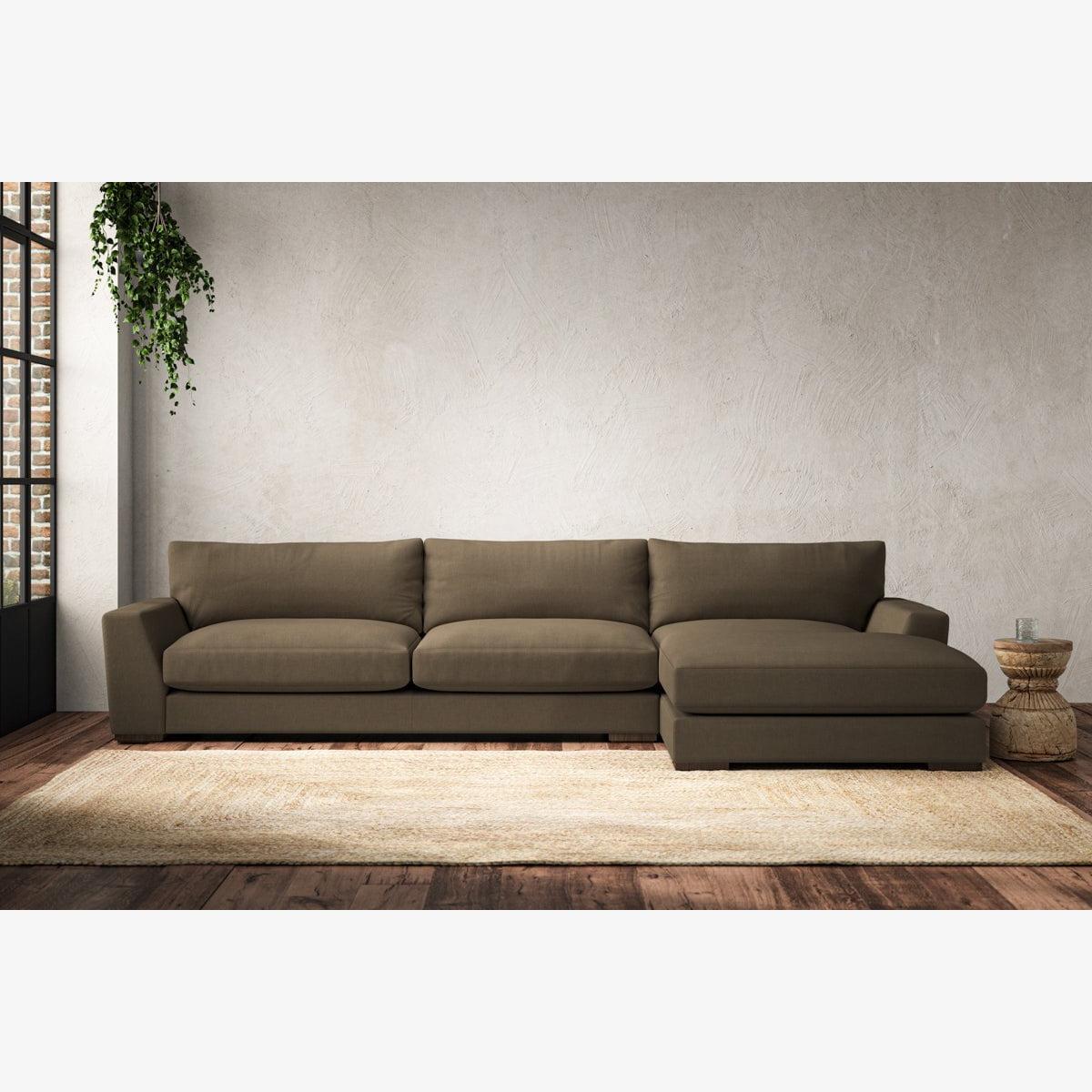 The laid-back sculptural shape of the Guddu grand right hand chaise sofa brings effortless style to an interior. The generous arms and deep seat cushions make this collection the perfect choice for families or those that like a bit of extra space to stretch out. Details include separate back cushions, exceptional quality fabrics and solid wood block feet. Each piece is handcrafted by experts using traditional techniques for a quality finish that celebrates the best of British craftmanship. The hardwood frame and high-grade steel serpentine springs are selected for enduring quality, and the cushions are made from foam with a fibre wrap for added comfort. The fabric is hand cut to size, playing close attention to the characteristics of the material, and the sculpted hardwood feet provides the finishing detail. Our upholstery fabrics are sourced from Italy’s finest mills and are chosen for their style and quality. We have selected a beautiful heavyweight, soft washed linen with an outstanding texture. Our linen is perfectly suited to upholstery, with an appealing natural, and tactile feel. It is also heavy and durable. The linen is FR treated for domestic upholstery ensuring peace of mind as well as meeting specialist UK furniture requirements. Our curated colour palette offers a variety of 11 sophisticated muted shades. Please note, our white background cut-out photography is shown in Natural for shape and style reference. Fabric Swatch Ordering We recommend ordering fabric swatches before placing your order, giving you the chance to feel the fabric and see your colour choices within your own home. You can order up to 6 free fabric swatches by clicking here. Before placing your order, it's important to take the time to measure the space you intend to place your made-to-order furniture to ensure it fits properly. You can read more in our Sofa Buying Guide.