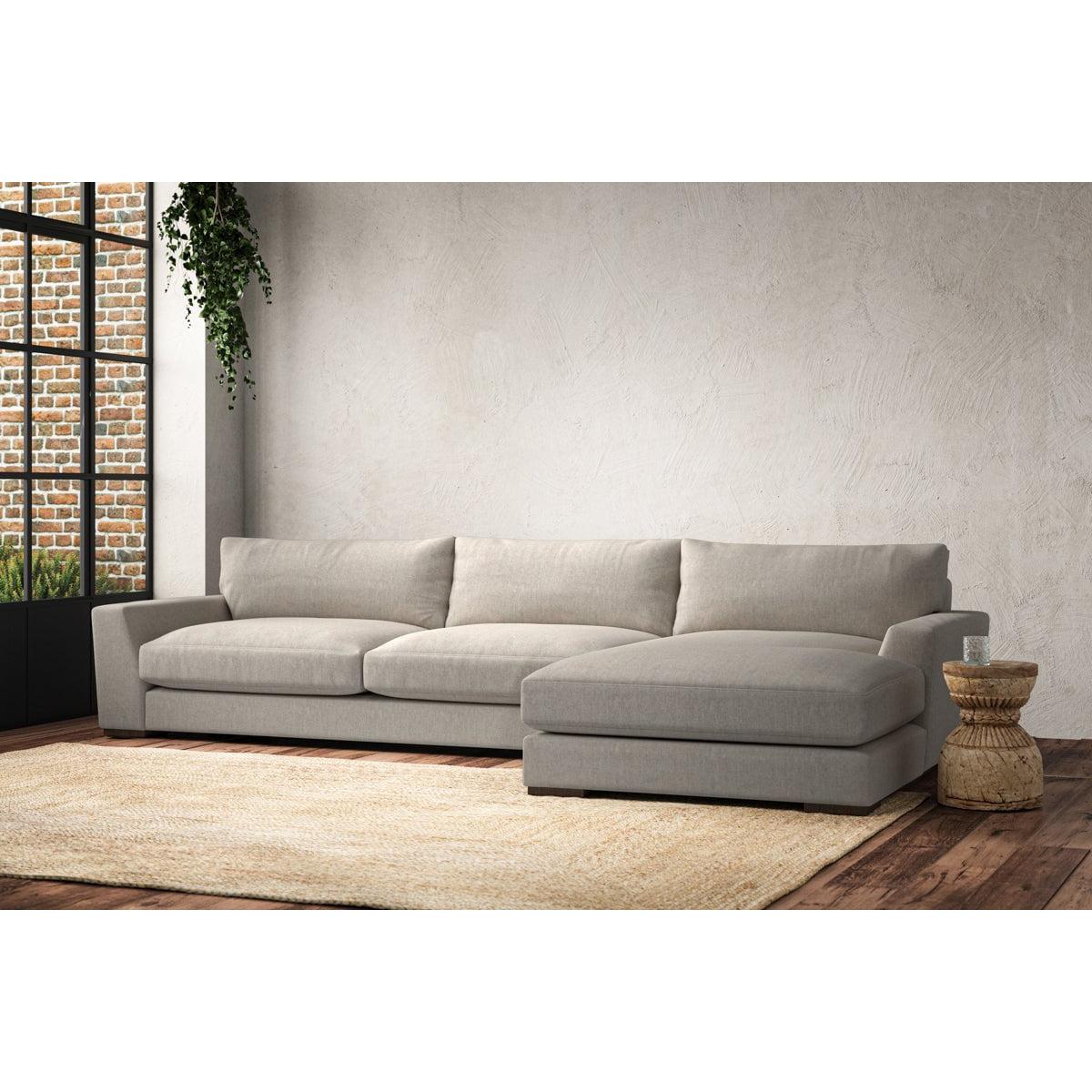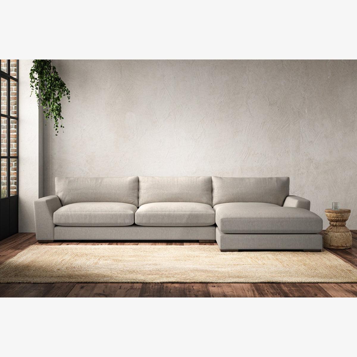 The laid-back sculptural shape of the Guddu grand right hand chaise sofa brings effortless style to an interior. The generous arms and deep seat cushions make this collection the perfect choice for families or those that like a bit of extra space to stretch out. Details include separate back cushions, exceptional quality fabrics and solid wood block feet. Each piece is handcrafted by experts using traditional techniques for a quality finish that celebrates the best of British craftmanship. The hardwood frame and high-grade steel serpentine springs are selected for enduring quality, and the cushions are made from foam with a fibre wrap for added comfort. The fabric is hand cut to size, playing close attention to the characteristics of the material, and the sculpted hardwood feet provides the finishing detail. Our upholstery fabrics are sourced from Italy’s finest mills and are chosen for their style and quality. We have selected a beautiful heavyweight, soft washed linen with an outstanding texture. Our linen is perfectly suited to upholstery, with an appealing natural, and tactile feel. It is also heavy and durable. The linen is FR treated for domestic upholstery ensuring peace of mind as well as meeting specialist UK furniture requirements. Our curated colour palette offers a variety of 11 sophisticated muted shades. Please note, our white background cut-out photography is shown in Natural for shape and style reference. Fabric Swatch OrderingWe recommend ordering fabric swatches before placing your order, giving you the chance to feel the fabric and see your colour choices within your own home. You can order up to 6 free fabric swatches by clicking here. it fit?Before placing your order, it's important to take the time to measure the space you intend to place your made-to-order furniture to ensure it fits properly. You can read more in our Sofa Buying Guide.