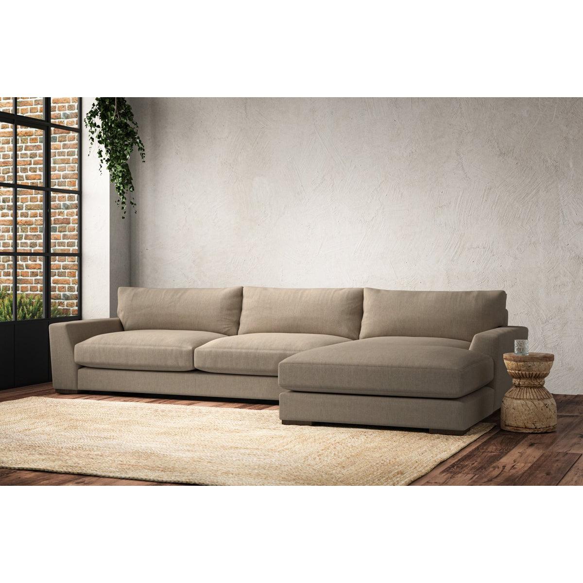 The laid-back sculptural shape of the Guddu grand right hand chaise sofa brings effortless style to an interior. The generous arms and deep seat cushions make this collection the perfect choice for families or those that like a bit of extra space to stretch out. Details include separate back cushions, exceptional quality fabrics and solid wood block feet. Each piece is handcrafted by experts using traditional techniques for a quality finish that celebrates the best of British craftmanship. The hardwood frame and high-grade steel serpentine springs are selected for enduring quality, and the cushions are made from foam with a fibre wrap for added comfort. The fabric is hand cut to size, playing close attention to the characteristics of the material, and the sculpted hardwood feet provides the finishing detail. Our upholstery fabrics are sourced from Italy’s finest mills and are chosen for their style and quality. We have selected a beautiful heavyweight, soft washed linen with an outstanding texture. Our linen is perfectly suited to upholstery, with an appealing natural, and tactile feel. It is also heavy and durable. The linen is FR treated for domestic upholstery ensuring peace of mind as well as meeting specialist UK furniture requirements. Our curated colour palette offers a variety of 11 sophisticated muted shades. Please note, our white background cut-out photography is shown in Natural for shape and style reference. Fabric Swatch Ordering We recommend ordering fabric swatches before placing your order, giving you the chance to feel the fabric and see your colour choices within your own home. You can order up to 6 free fabric swatches by clicking here. Before placing your order, it's important to take the time to measure the space you intend to place your made-to-order furniture to ensure it fits properly. You can read more in our Sofa Buying Guide.
