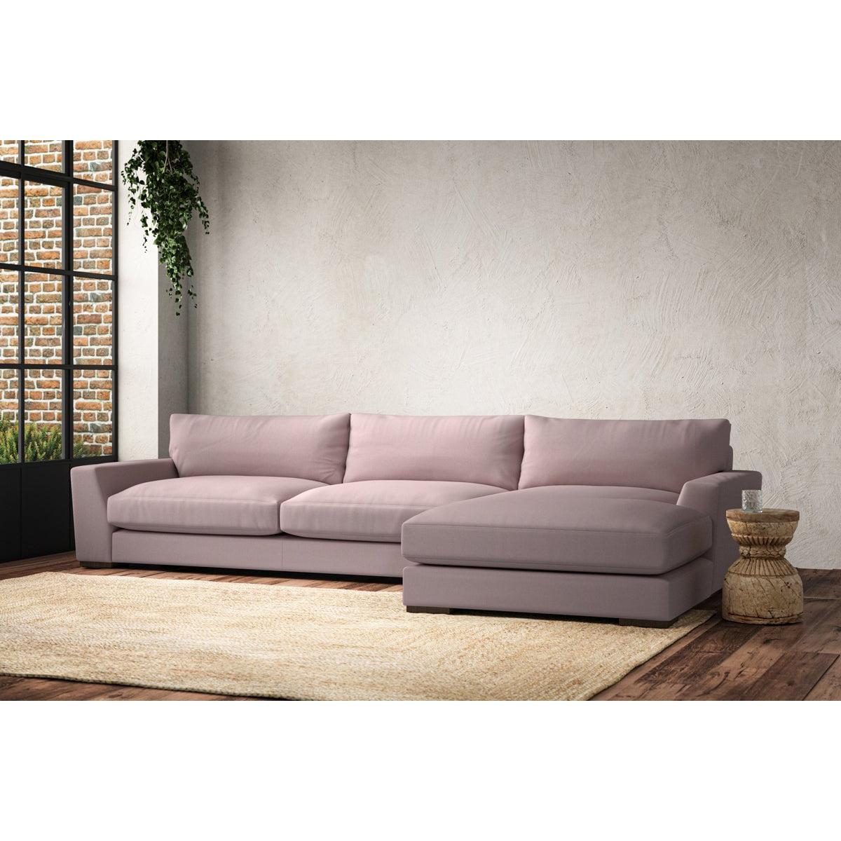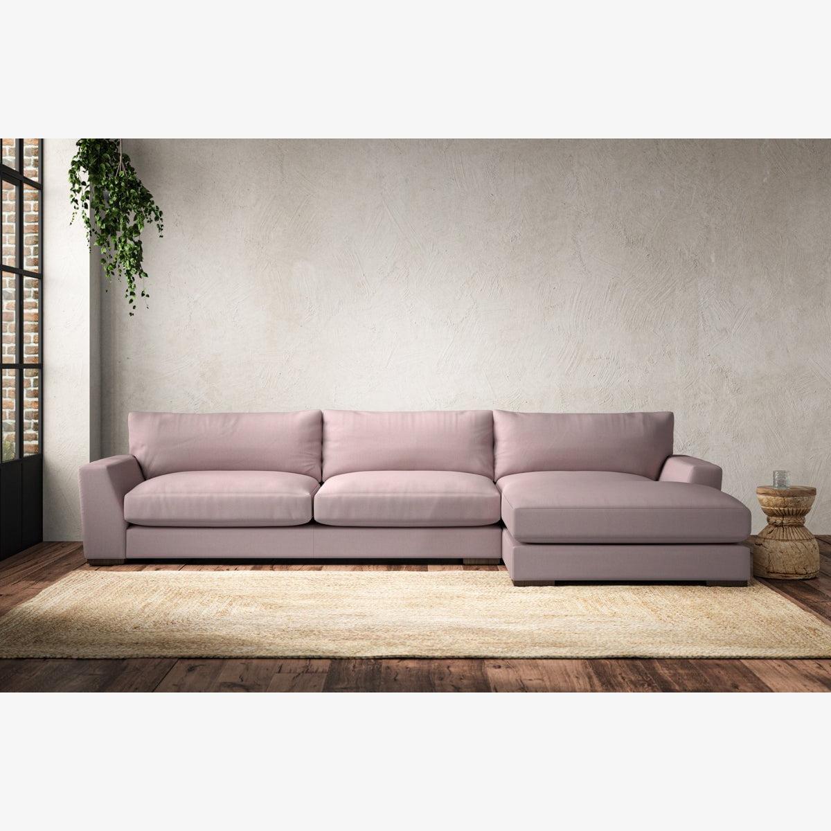 The laid-back sculptural shape of the Guddu grand right hand chaise sofa brings effortless style to an interior. The generous arms and deep seat cushions make this collection the perfect choice for families or those that like a bit of extra space to stretch out. Details include separate back cushions, exceptional quality fabrics and solid wood block feet. Each piece is handcrafted by experts using traditional techniques for a quality finish that celebrates the best of British craftmanship. The hardwood frame and high-grade steel serpentine springs are selected for enduring quality, and the cushions are made from foam with a fibre wrap for added comfort. The fabric is hand cut to size, playing close attention to the characteristics of the material, and the sculpted hardwood feet provides the finishing detail. Our upholstery fabrics are chosen for their style and quality, where all fabrics are FR treated for domestic upholstery ensuring peace of mind as well as meeting specialist UK furniture requirements. Our curated colour palette offers a variety of sophisticated muted shades. Please note, our white background cut-out photography is shown in Natural for shape and style reference. Fabric Swatch Ordering We recommend ordering fabric swatches before placing your order, giving you the chance to feel the fabric and see your colour choices within your own home. You can order up to 6 free fabric swatches by clicking here. Before placing your order, it's important to take the time to measure the space you intend to place your made-to-order furniture to ensure it fits properly. You can read more in our Sofa Buying Guide.
