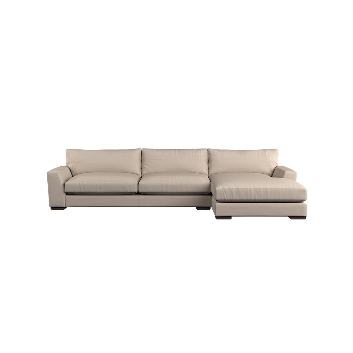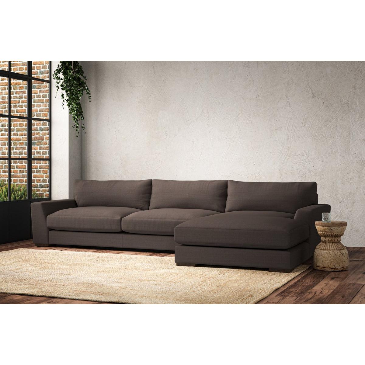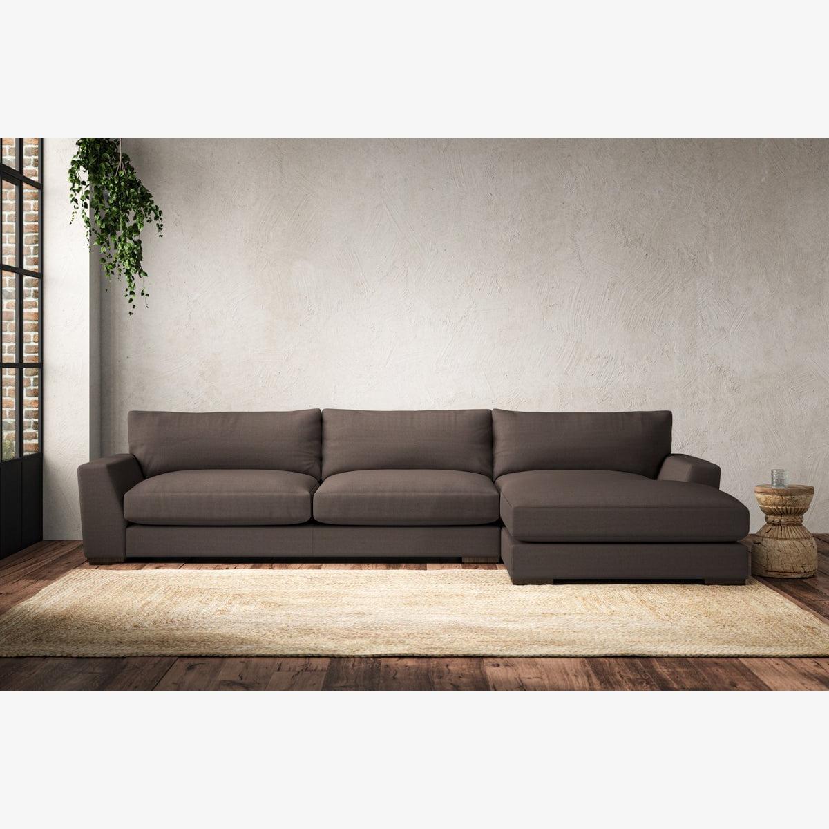 The laid-back sculptural shape of the Guddu grand right hand chaise sofa brings effortless style to an interior. The generous arms and deep seat cushions make this collection the perfect choice for families or those that like a bit of extra space to stretch out. Details include separate back cushions, exceptional quality fabrics and solid wood block feet. Each piece is handcrafted by experts using traditional techniques for a quality finish that celebrates the best of British craftmanship. The hardwood frame and high-grade steel serpentine springs are selected for enduring quality, and the cushions are made from foam with a fibre wrap for added comfort. The fabric is hand cut to size, playing close attention to the characteristics of the material, and the sculpted hardwood feet provides the finishing detail. Our upholstery fabrics are chosen for their style and quality, where all fabrics are FR treated for domestic upholstery ensuring peace of mind as well as meeting specialist UK furniture requirements. Our curated colour palette offers a variety of sophisticated muted shades. Please note, our white background cut-out photography is shown in Natural for shape and style reference. Fabric Swatch Ordering We recommend ordering fabric swatches before placing your order, giving you the chance to feel the fabric and see your colour choices within your own home. You can order up to 6 free fabric swatches by clicking here. Before placing your order, it's important to take the time to measure the space you intend to place your made-to-order furniture to ensure it fits properly. You can read more in our Sofa Buying Guide.