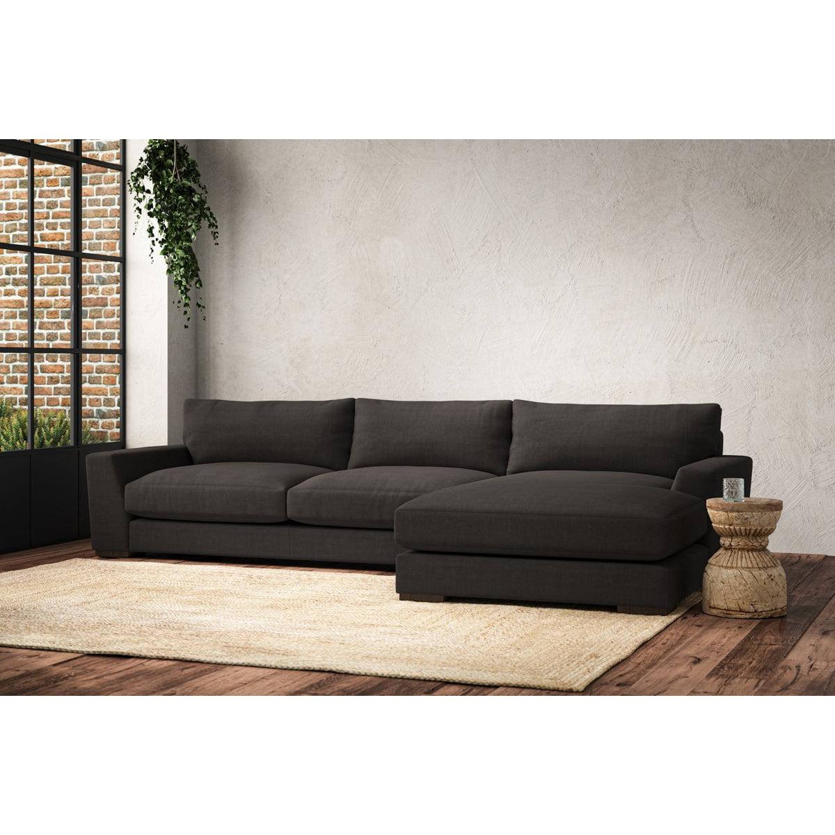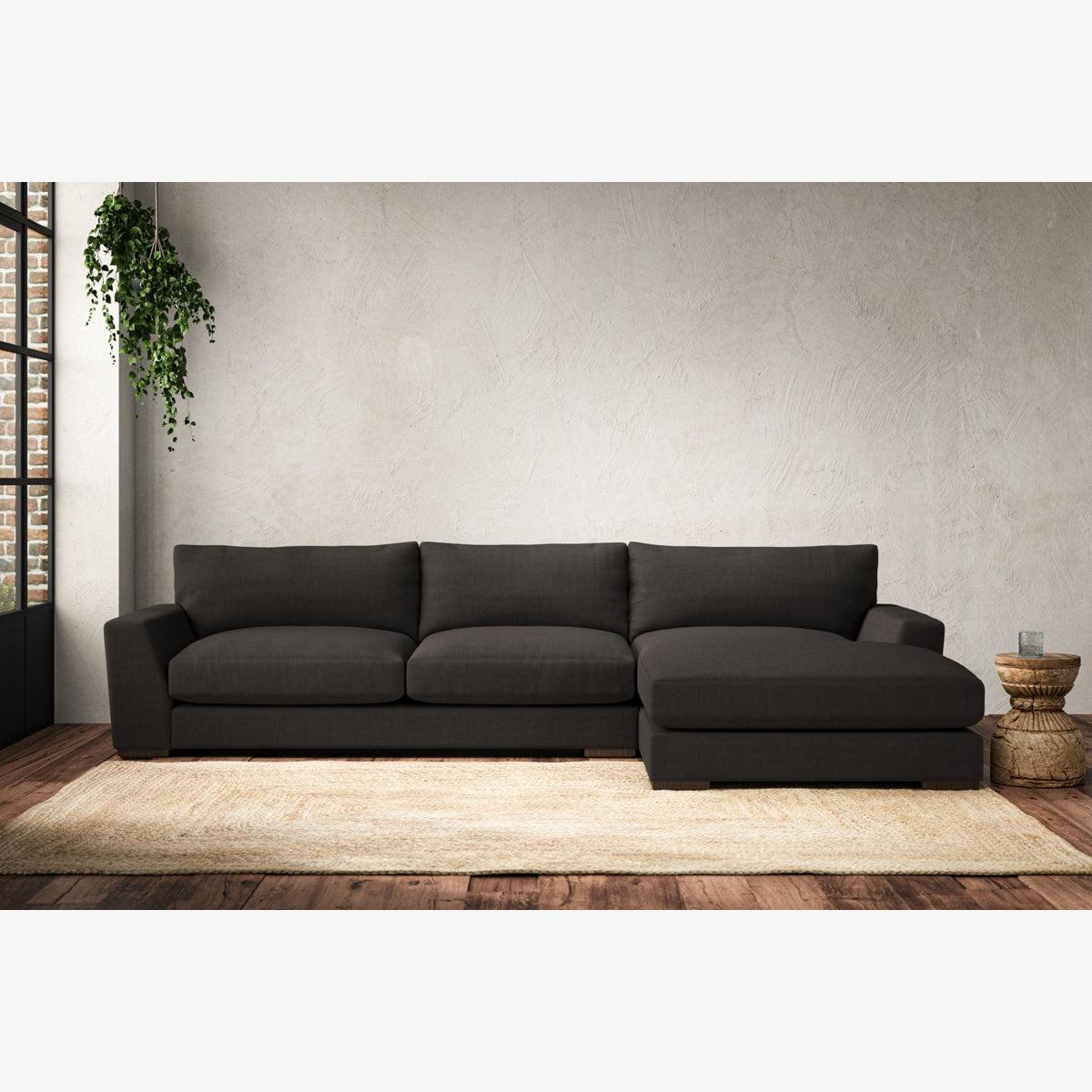 The laid-back sculptural shape of the Guddu large right hand chaise sofa brings effortless style to an interior. The generous arms and deep seat cushions make this collection the perfect choice for families or those that like a bit of extra space to stretch out. Details include separate back cushions, exceptional quality fabrics and solid wood block feet. Each piece is handcrafted by experts using traditional techniques for a quality finish that celebrates the best of British craftmanship. The hardwood frame and high-grade steel serpentine springs are selected for enduring quality, and the cushions are made from foam with a fibre wrap for added comfort. The fabric is hand cut to size, playing close attention to the characteristics of the material, and the sculpted hardwood feet provides the finishing detail. Our upholstery fabrics are sourced from Italy’s finest mills and are chosen for their style and quality. We have selected a beautiful heavyweight, soft washed linen with an outstanding texture. Our linen is perfectly suited to upholstery, with an appealing natural, and tactile feel. It is also heavy and durable. The linen is FR treated for domestic upholstery ensuring peace of mind as well as meeting specialist UK furniture requirements. Our curated colour palette offers a variety of 11 sophisticated muted shades. Please note, our white background cut-out photography is shown in Natural for shape and style reference. Fabric Swatch Ordering We recommend ordering fabric swatches before placing your order, giving you the chance to feel the fabric and see your colour choices within your own home. You can order up to 6 free fabric swatches by clicking here. Before placing your order, it's important to take the time to measure the space you intend to place your made-to-order furniture to ensure it fits properly. You can read more in our Sofa Buying Guide.