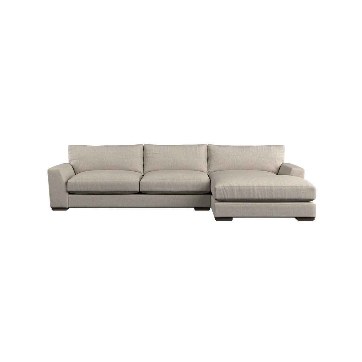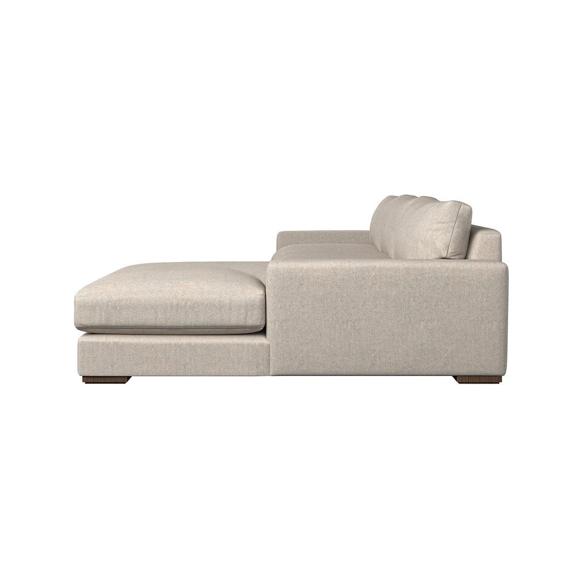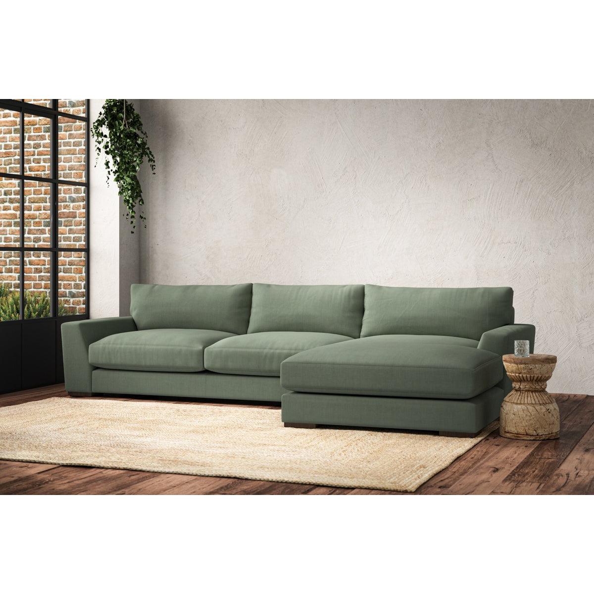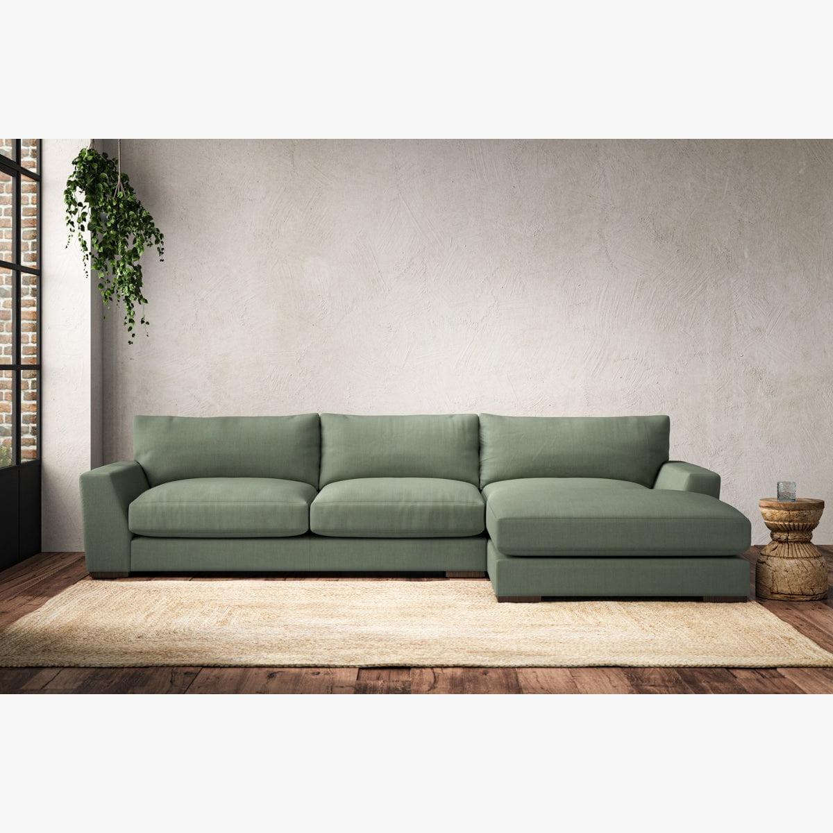 The laid-back sculptural shape of the Guddu large right hand chaise sofa brings effortless style to an interior. The generous arms and deep seat cushions make this collection the perfect choice for families or those that like a bit of extra space to stretch out. Details include separate back cushions, exceptional quality fabrics and solid wood block feet. Each piece is handcrafted by experts using traditional techniques for a quality finish that celebrates the best of British craftmanship. The hardwood frame and high-grade steel serpentine springs are selected for enduring quality, and the cushions are made from foam with a fibre wrap for added comfort. The fabric is hand cut to size, playing close attention to the characteristics of the material, and the sculpted hardwood feet provides the finishing detail. Our upholstery fabrics are sourced from Italy’s finest mills and are chosen for their style and quality. We have selected a beautiful heavyweight, soft washed linen with an outstanding texture. Our linen is perfectly suited to upholstery, with an appealing natural, and tactile feel. It is also heavy and durable. The linen is FR treated for domestic upholstery ensuring peace of mind as well as meeting specialist UK furniture requirements. Our curated colour palette offers a variety of 11 sophisticated muted shades. Please note, our white background cut-out photography is shown in Natural for shape and style reference. Fabric Swatch Ordering We recommend ordering fabric swatches before placing your order, giving you the chance to feel the fabric and see your colour choices within your own home. You can order up to 6 free fabric swatches by clicking here. Before placing your order, it's important to take the time to measure the space you intend to place your made-to-order furniture to ensure it fits properly. You can read more in our Sofa Buying Guide.