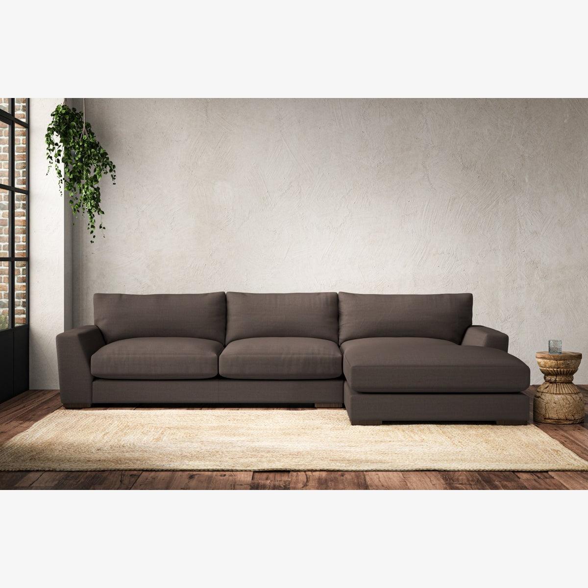 The laid-back sculptural shape of the Guddu large right hand chaise sofa brings effortless style to an interior. The generous arms and deep seat cushions make this collection the perfect choice for families or those that like a bit of extra space to stretch out. Details include separate back cushions, exceptional quality fabrics and solid wood block feet. Each piece is handcrafted by experts using traditional techniques for a quality finish that celebrates the best of British craftmanship. The hardwood frame and high-grade steel serpentine springs are selected for enduring quality, and the cushions are made from foam with a fibre wrap for added comfort. The fabric is hand cut to size, playing close attention to the characteristics of the material, and the sculpted hardwood feet provides the finishing detail. Our upholstery fabrics are chosen for their style and quality, where all fabrics are FR treated for domestic upholstery ensuring peace of mind as well as meeting specialist UK furniture requirements. Our curated colour palette offers a variety of sophisticated muted shades. Please note, our white background cut-out photography is shown in Natural for shape and style reference. Fabric Swatch Ordering We recommend ordering fabric swatches before placing your order, giving you the chance to feel the fabric and see your colour choices within your own home. You can order up to 6 free fabric swatches by clicking here. Before placing your order, it's important to take the time to measure the space you intend to place your made-to-order furniture to ensure it fits properly. You can read more in our Sofa Buying Guide.