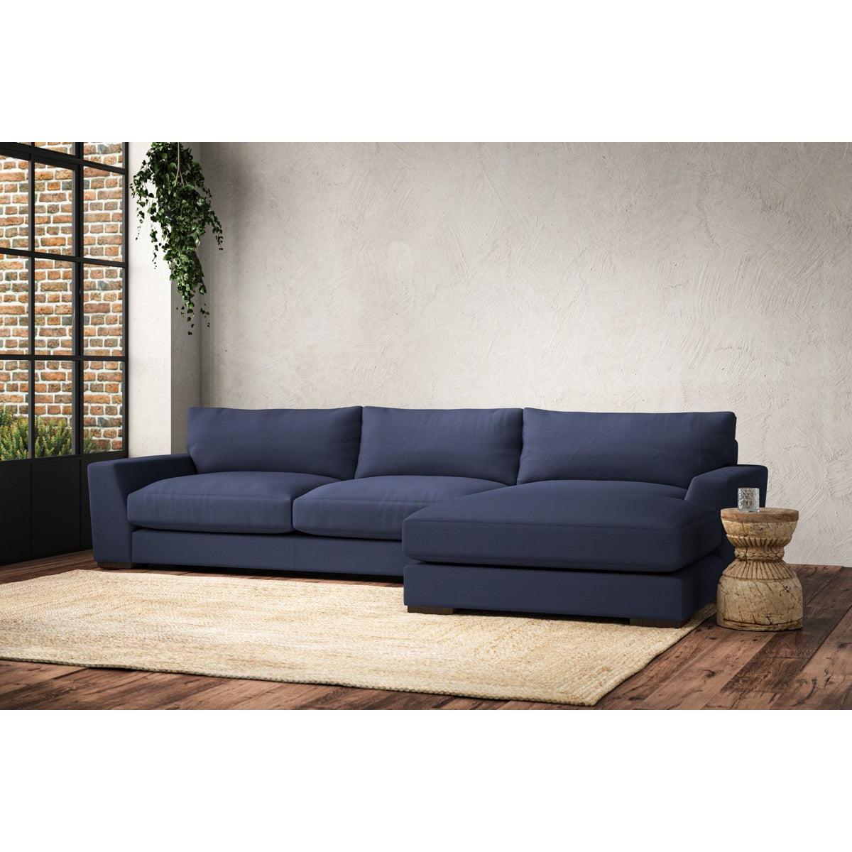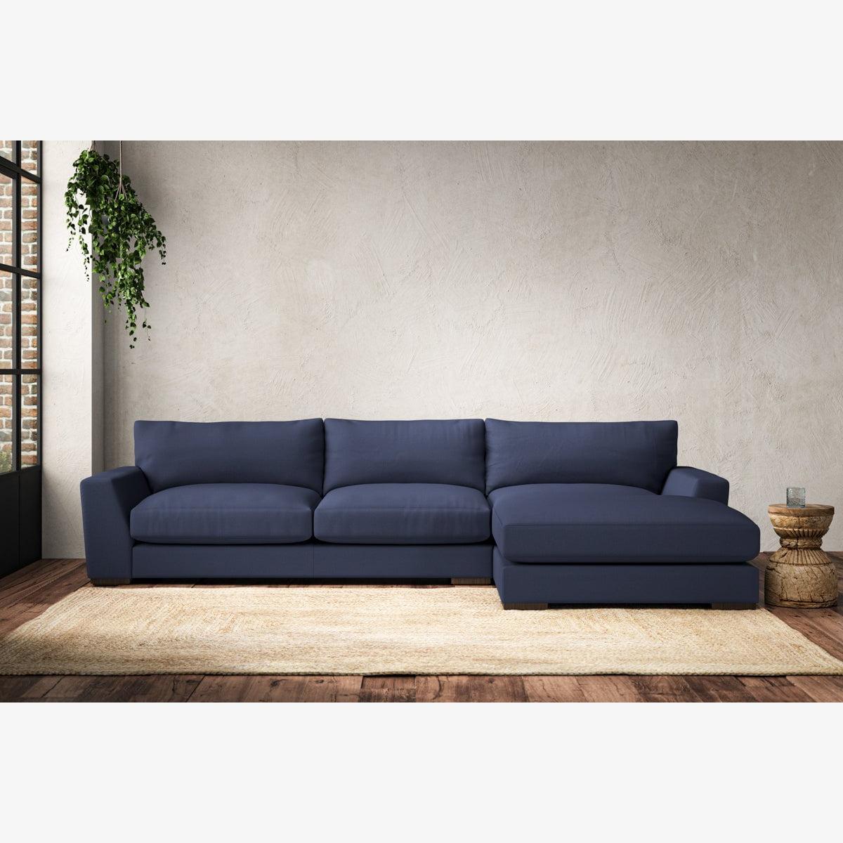 The laid-back sculptural shape of the Guddu large right hand chaise sofa brings effortless style to an interior. The generous arms and deep seat cushions make this collection the perfect choice for families or those that like a bit of extra space to stretch out. Details include separate back cushions, exceptional quality fabrics and solid wood block feet. Each piece is handcrafted by experts using traditional techniques for a quality finish that celebrates the best of British craftmanship. The hardwood frame and high-grade steel serpentine springs are selected for enduring quality, and the cushions are made from foam with a fibre wrap for added comfort. The fabric is hand cut to size, playing close attention to the characteristics of the material, and the sculpted hardwood feet provides the finishing detail. Our upholstery fabrics are chosen for their style and quality, where all fabrics are FR treated for domestic upholstery ensuring peace of mind as well as meeting specialist UK furniture requirements. Our curated colour palette offers a variety of sophisticated muted shades. Please note, our white background cut-out photography is shown in Natural for shape and style reference. Fabric Swatch Ordering We recommend ordering fabric swatches before placing your order, giving you the chance to feel the fabric and see your colour choices within your own home. You can order up to 6 free fabric swatches by clicking here. Before placing your order, it's important to take the time to measure the space you intend to place your made-to-order furniture to ensure it fits properly. You can read more in our Sofa Buying Guide.
