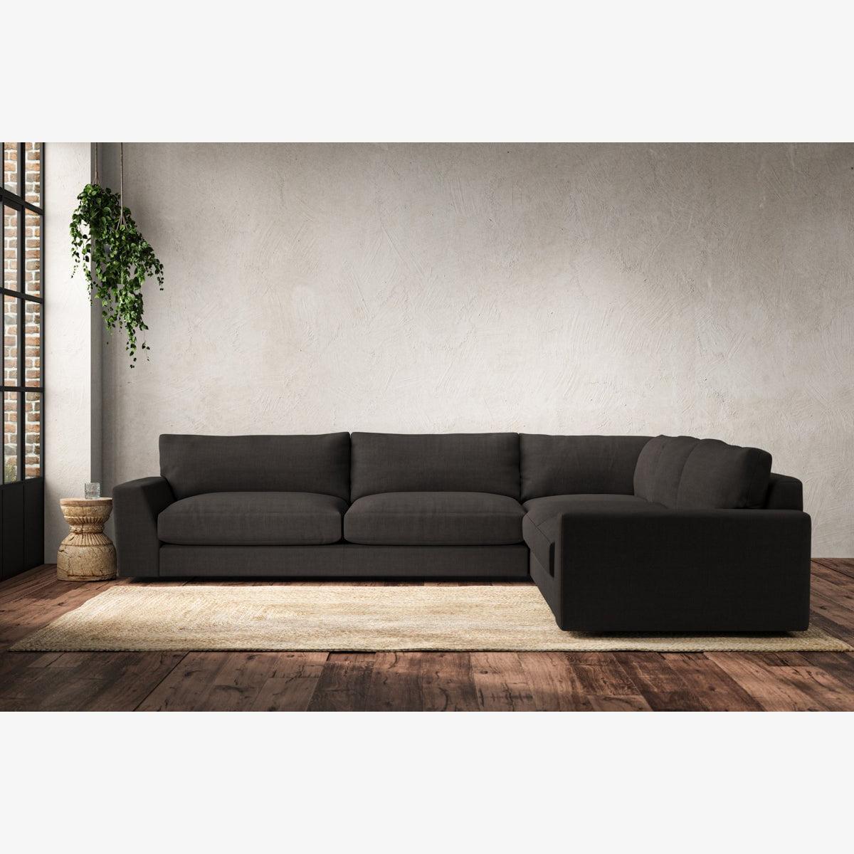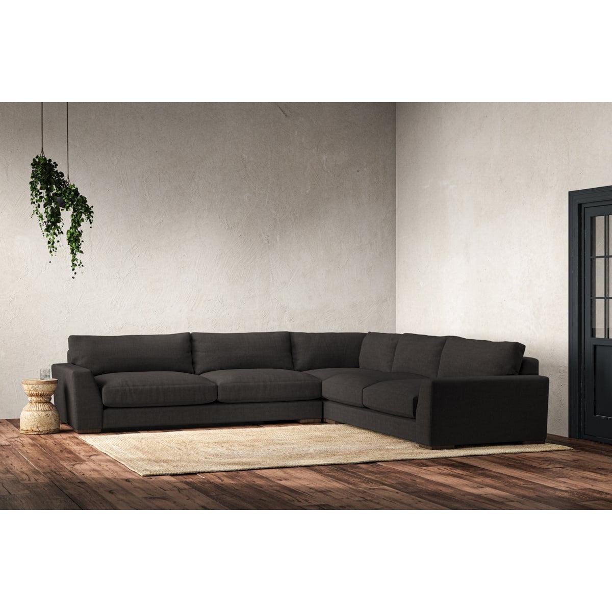The laid-back sculptural shape of the Guddu grand right hand corner sofa brings effortless style to an interior. The generous arms and deep seat cushions make this collection the perfect choice for families or those that like a bit of extra space to stretch out. Details include separate back cushions, exceptional quality fabrics and solid wood block feet. Each piece is handcrafted by experts using traditional techniques for a quality finish that celebrates the best of British craftmanship. The hardwood frame and high-grade steel serpentine springs are selected for enduring quality, and the cushions are made from foam with a fibre wrap for added comfort. The fabric is hand cut to size, playing close attention to the characteristics of the material, and the sculpted hardwood feet provides the finishing detail. Our upholstery fabrics are sourced from Italy’s finest mills and are chosen for their style and quality. We have selected a beautiful heavyweight, soft washed linen with an outstanding texture. Our linen is perfectly suited to upholstery, with an appealing natural, and tactile feel. It is also heavy and durable. The linen is FR treated for domestic upholstery ensuring peace of mind as well as meeting specialist UK furniture requirements. Our curated colour palette offers a variety of 11 sophisticated muted shades. Please note, our white background cut-out photography is shown in Natural for shape and style reference. Fabric Swatch Ordering We recommend ordering fabric swatches before placing your order, giving you the chance to feel the fabric and see your colour choices within your own home. You can order up to 6 free fabric swatches by clicking here. Before placing your order, it's important to take the time to measure the space you intend to place your made-to-order furniture to ensure it fits properly. You can read more in our Sofa Buying Guide.