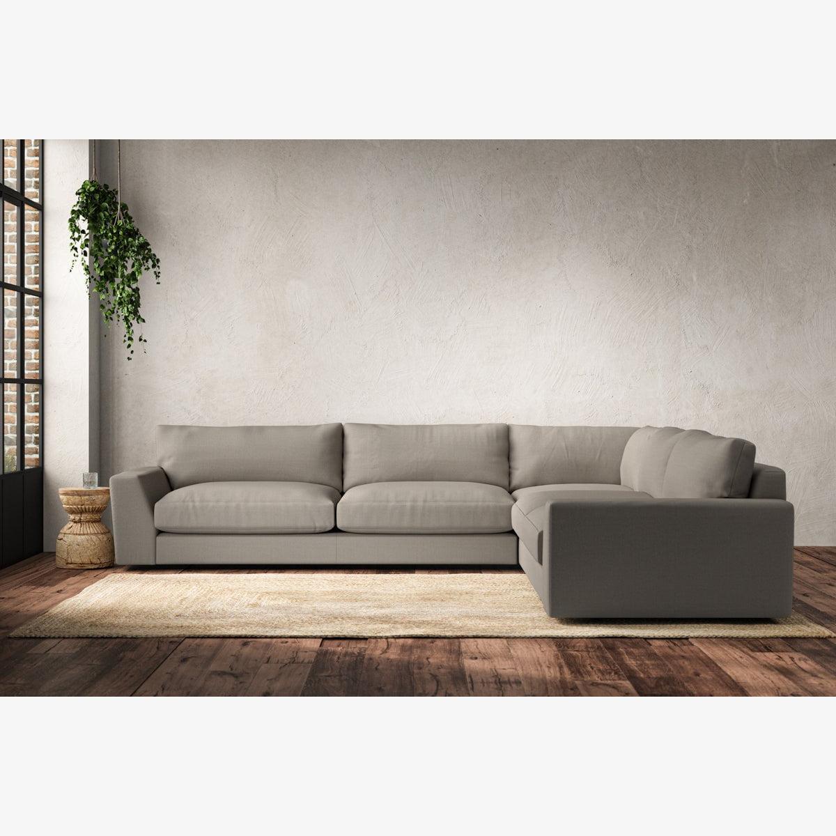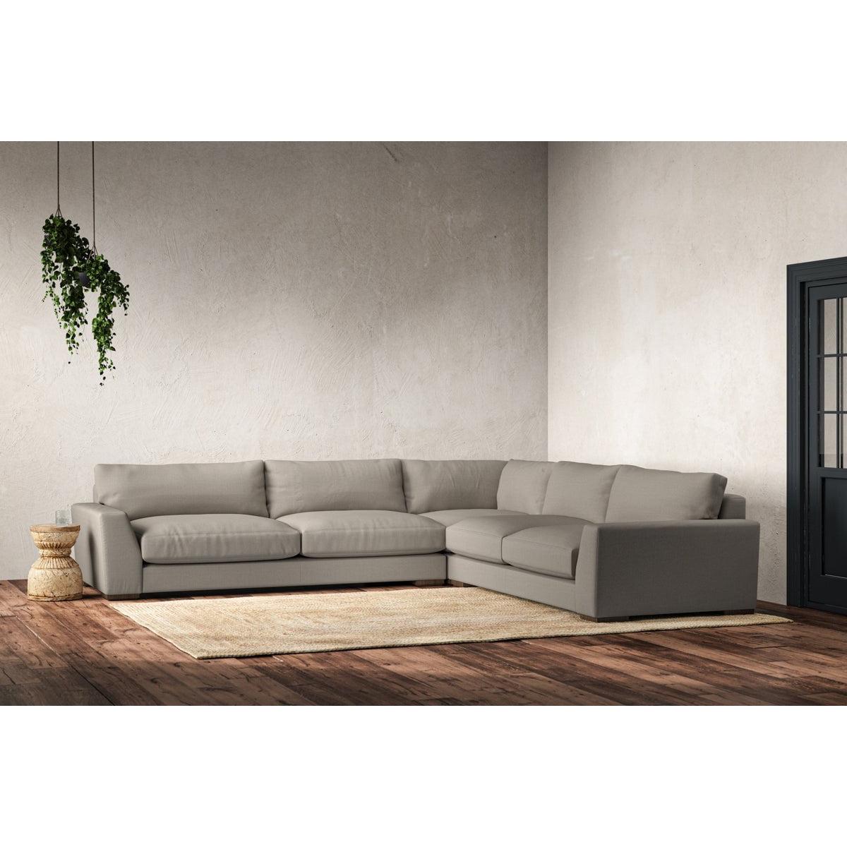 The laid-back sculptural shape of the Guddu grand right hand corner sofa brings effortless style to an interior. The generous arms and deep seat cushions make this collection the perfect choice for families or those that like a bit of extra space to stretch out. Details include separate back cushions, exceptional quality fabrics and solid wood block feet. Each piece is handcrafted by experts using traditional techniques for a quality finish that celebrates the best of British craftmanship. The hardwood frame and high-grade steel serpentine springs are selected for enduring quality, and the cushions are made from foam with a fibre wrap for added comfort. The fabric is hand cut to size, playing close attention to the characteristics of the material, and the sculpted hardwood feet provides the finishing detail. Our upholstery fabrics are chosen for their style and quality, where all fabrics are FR treated for domestic upholstery ensuring peace of mind as well as meeting specialist UK furniture requirements. Our curated colour palette offers a variety of sophisticated muted shades. Please note, our white background cut-out photography is shown in Natural for shape and style reference. Fabric Swatch OrderingWe recommend ordering fabric swatches before placing your order, giving you the chance to feel the fabric and see your colour choices within your own home. You can order up to 6 free fabric swatches by clicking here. it fit?Before placing your order, it's important to take the time to measure the space you intend to place your made-to-order furniture to ensure it fits properly. You can read more in our Sofa Buying Guide.