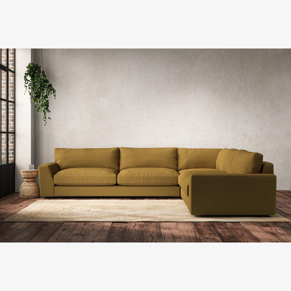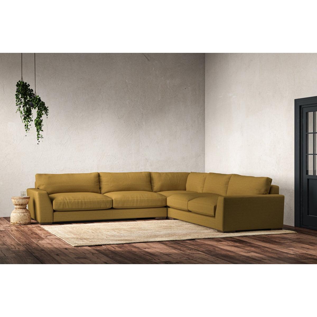 The laid-back sculptural shape of the Guddu grand right hand corner sofa brings effortless style to an interior. The generous arms and deep seat cushions make this collection the perfect choice for families or those that like a bit of extra space to stretch out. Details include separate back cushions, exceptional quality fabrics and solid wood block feet. Each piece is handcrafted by experts using traditional techniques for a quality finish that celebrates the best of British craftmanship. The hardwood frame and high-grade steel serpentine springs are selected for enduring quality, and the cushions are made from foam with a fibre wrap for added comfort. The fabric is hand cut to size, playing close attention to the characteristics of the material, and the sculpted hardwood feet provides the finishing detail. Our upholstery fabrics are chosen for their style and quality, where all fabrics are FR treated for domestic upholstery ensuring peace of mind as well as meeting specialist UK furniture requirements. Our curated colour palette offers a variety of sophisticated muted shades. Please note, our white background cut-out photography is shown in Natural for shape and style reference. Fabric Swatch Ordering We recommend ordering fabric swatches before placing your order, giving you the chance to feel the fabric and see your colour choices within your own home. You can order up to 6 free fabric swatches by clicking here. Before placing your order, it's important to take the time to measure the space you intend to place your made-to-order furniture to ensure it fits properly. You can read more in our Sofa Buying Guide.
