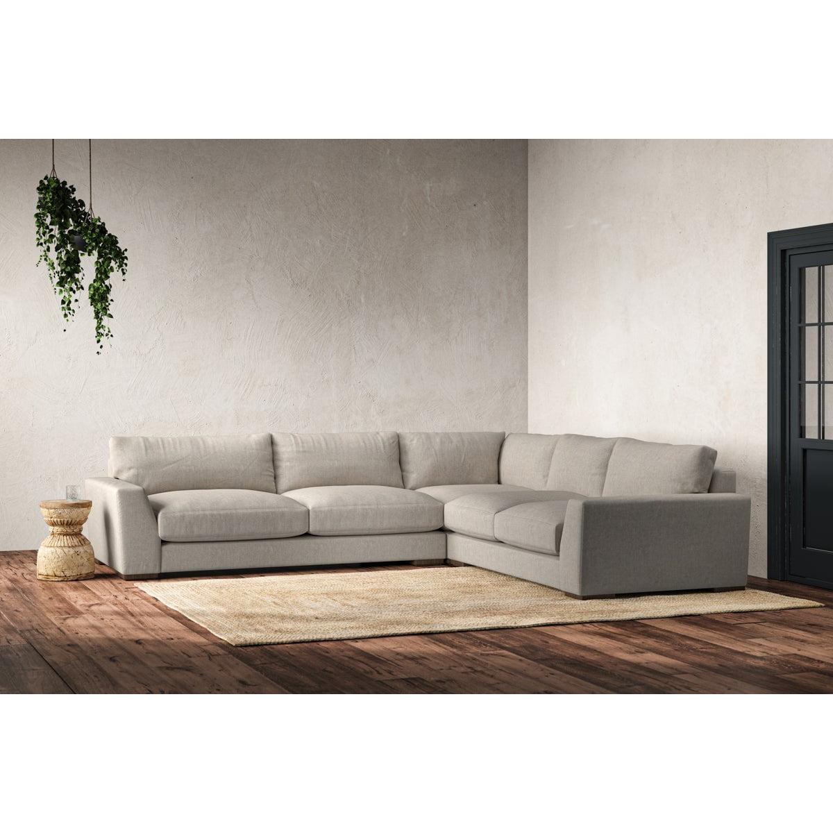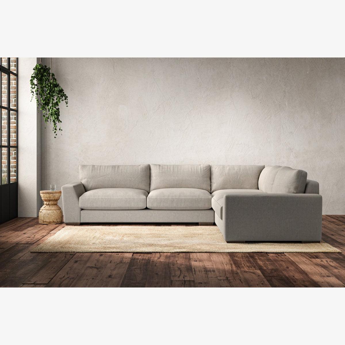 The laid-back sculptural shape of the Guddu large right hand corner sofa brings effortless style to an interior. The generous arms and deep seat cushions make this collection the perfect choice for families or those that like a bit of extra space to stretch out. Details include separate back cushions, exceptional quality fabrics and solid wood block feet. Each piece is handcrafted by experts using traditional techniques for a quality finish that celebrates the best of British craftmanship. The hardwood frame and high-grade steel serpentine springs are selected for enduring quality, and the cushions are made from foam with a fibre wrap for added comfort. The fabric is hand cut to size, playing close attention to the characteristics of the material, and the sculpted hardwood feet provides the finishing detail. Our upholstery fabrics are sourced from Italy’s finest mills and are chosen for their style and quality. We have selected a beautiful heavyweight, soft washed linen with an outstanding texture. Our linen is perfectly suited to upholstery, with an appealing natural, and tactile feel. It is also heavy and durable. The linen is FR treated for domestic upholstery ensuring peace of mind as well as meeting specialist UK furniture requirements. Our curated colour palette offers a variety of 11 sophisticated muted shades. Please note, our white background cut-out photography is shown in Natural for shape and style reference. Fabric Swatch OrderingWe recommend ordering fabric swatches before placing your order, giving you the chance to feel the fabric and see your colour choices within your own home. You can order up to 6 free fabric swatches by clicking here. it fit?Before placing your order, it's important to take the time to measure the space you intend to place your made-to-order furniture to ensure it fits properly. You can read more in our Sofa Buying Guide.