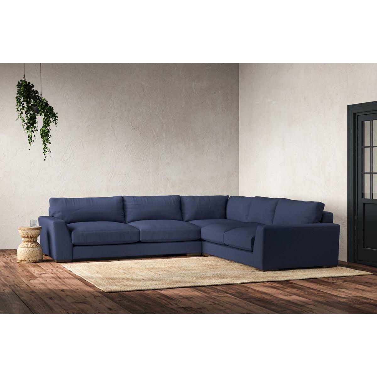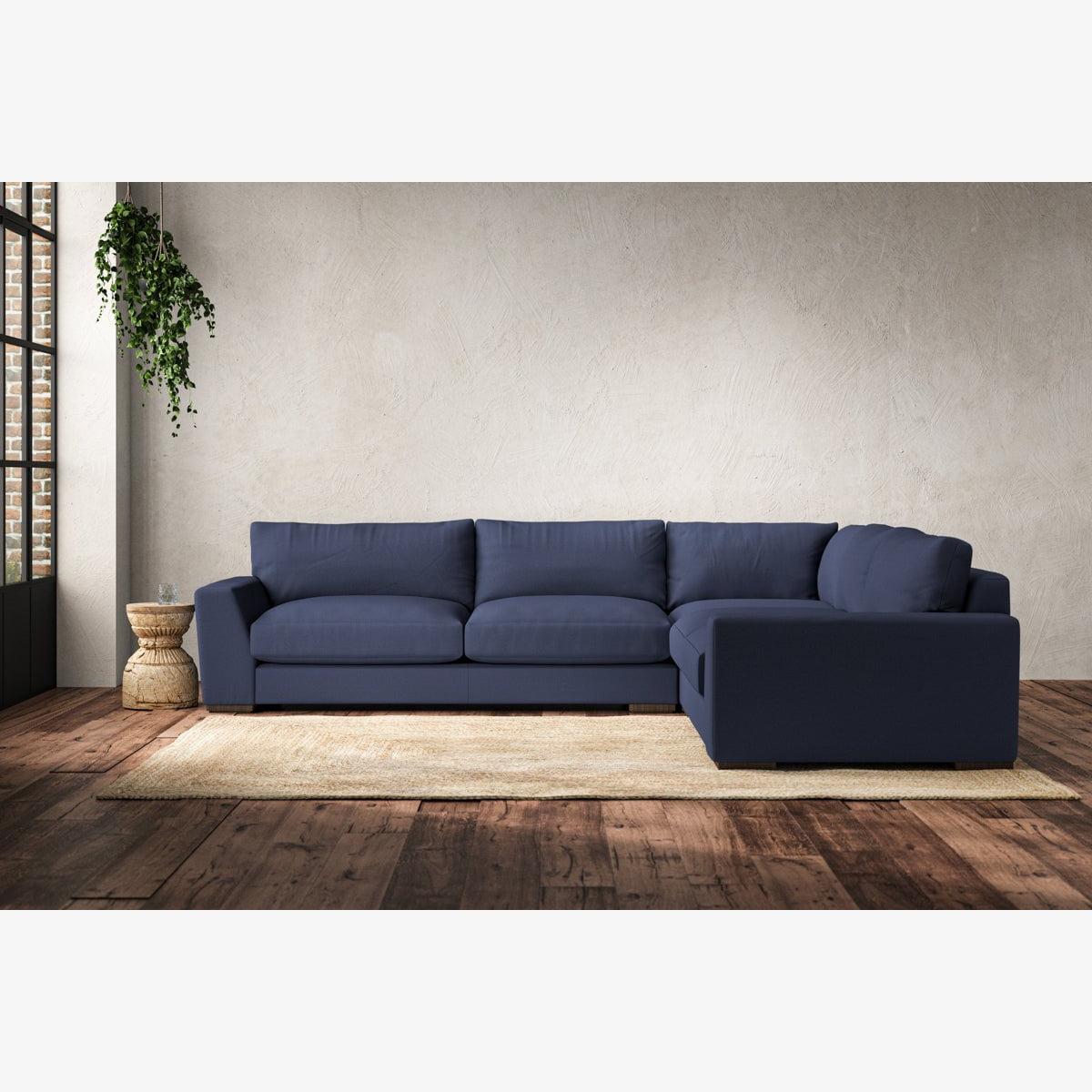 The laid-back sculptural shape of the Guddu large right hand corner sofa brings effortless style to an interior. The generous arms and deep seat cushions make this collection the perfect choice for families or those that like a bit of extra space to stretch out. Details include separate back cushions, exceptional quality fabrics and solid wood block feet. Each piece is handcrafted by experts using traditional techniques for a quality finish that celebrates the best of British craftmanship. The hardwood frame and high-grade steel serpentine springs are selected for enduring quality, and the cushions are made from foam with a fibre wrap for added comfort. The fabric is hand cut to size, playing close attention to the characteristics of the material, and the sculpted hardwood feet provides the finishing detail. Our upholstery fabrics are chosen for their style and quality, where all fabrics are FR treated for domestic upholstery ensuring peace of mind as well as meeting specialist UK furniture requirements. Our curated colour palette offers a variety of sophisticated muted shades. Please note, our white background cut-out photography is shown in Natural for shape and style reference. Fabric Swatch Ordering We recommend ordering fabric swatches before placing your order, giving you the chance to feel the fabric and see your colour choices within your own home. You can order up to 6 free fabric swatches by clicking here. Before placing your order, it's important to take the time to measure the space you intend to place your made-to-order furniture to ensure it fits properly. You can read more in our Sofa Buying Guide.
