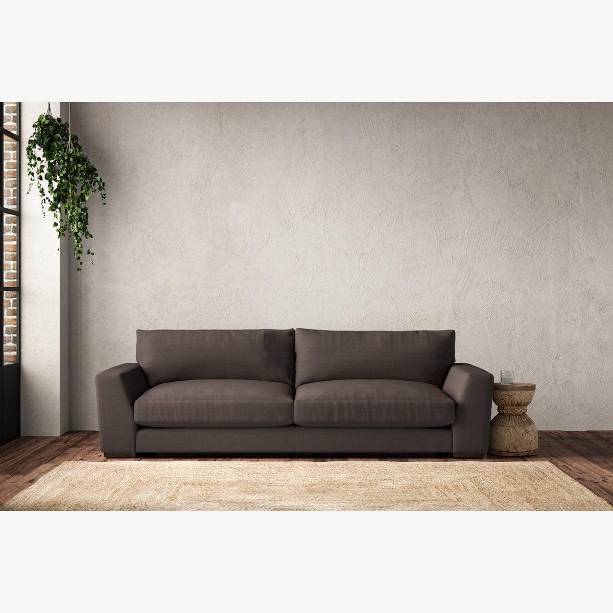The laid-back sculptural shape of the Guddu grand sofa brings effortless style to an interior. The generous arms and deep seat cushions make this collection the perfect choice for families or those that like a bit of extra space to stretch out. Details include separate back cushions, exceptional quality fabrics and solid wood block feet. Each piece is handcrafted by experts using traditional techniques for a quality finish that celebrates the best of British craftmanship. The hardwood frame and high-grade steel serpentine springs are selected for enduring quality, and the cushions are made from foam with a fibre wrap for added comfort. The fabric is hand cut to size, playing close attention to the characteristics of the material, and the sculpted hardwood feet provides the finishing detail. Our upholstery fabrics are chosen for their style and quality, where all fabrics are FR treated for domestic upholstery ensuring peace of mind as well as meeting specialist UK furniture requirements. Our curated colour palette offers a variety of sophisticated muted shades. Please note, our white background cut-out photography is shown in Natural for shape and style reference. Fabric Swatch Ordering We recommend ordering fabric swatches before placing your order, giving you the chance to feel the fabric and see your colour choices within your own home. You can order up to 6 free fabric swatches by clicking here. Before placing your order, it's important to take the time to measure the space you intend to place your made-to-order furniture to ensure it fits properly. You can read more in our Sofa Buying Guide.