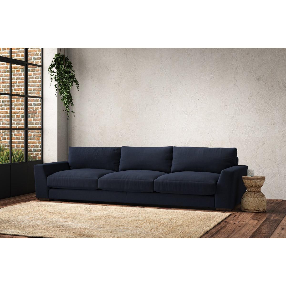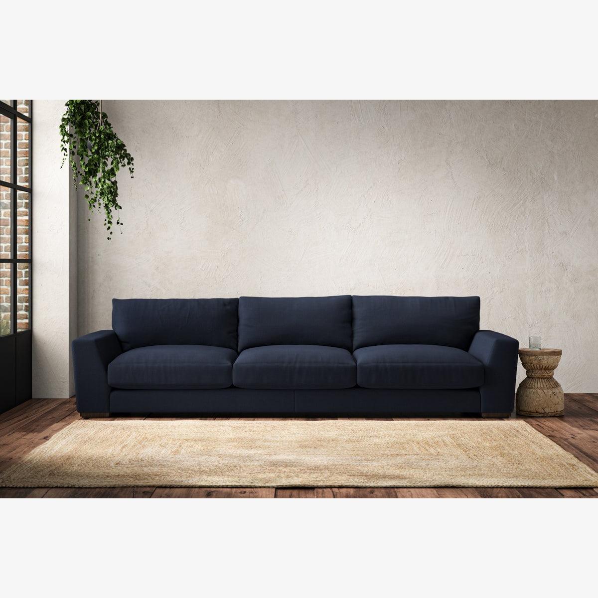The laid-back sculptural shape of the Guddu super grand sofa brings effortless style to an interior. The generous arms and deep seat cushions make this collection the perfect choice for families or those that like a bit of extra space to stretch out. Details include separate back cushions, exceptional quality fabrics and solid wood block feet. Each piece is handcrafted by experts using traditional techniques for a quality finish that celebrates the best of British craftmanship. The hardwood frame and high-grade steel serpentine springs are selected for enduring quality, and the cushions are made from foam with a fibre wrap for added comfort. The fabric is hand cut to size, playing close attention to the characteristics of the material, and the sculpted hardwood feet provides the finishing detail. Our upholstery fabrics are sourced from Italy’s finest mills and are chosen for their style and quality. We have selected a beautiful heavyweight, soft washed linen with an outstanding texture. Our linen is perfectly suited to upholstery, with an appealing natural, and tactile feel. It is also heavy and durable. The linen is FR treated for domestic upholstery ensuring peace of mind as well as meeting specialist UK furniture requirements. Our curated colour palette offers a variety of 11 sophisticated muted shades. Please note, our white background cut-out photography is shown in Natural for shape and style reference. Fabric Swatch Ordering We recommend ordering fabric swatches before placing your order, giving you the chance to feel the fabric and see your colour choices within your own home. You can order up to 6 free fabric swatches by clicking here. Before placing your order, it's important to take the time to measure the space you intend to place your made-to-order furniture to ensure it fits properly. You can read more in our Sofa Buying Guide.