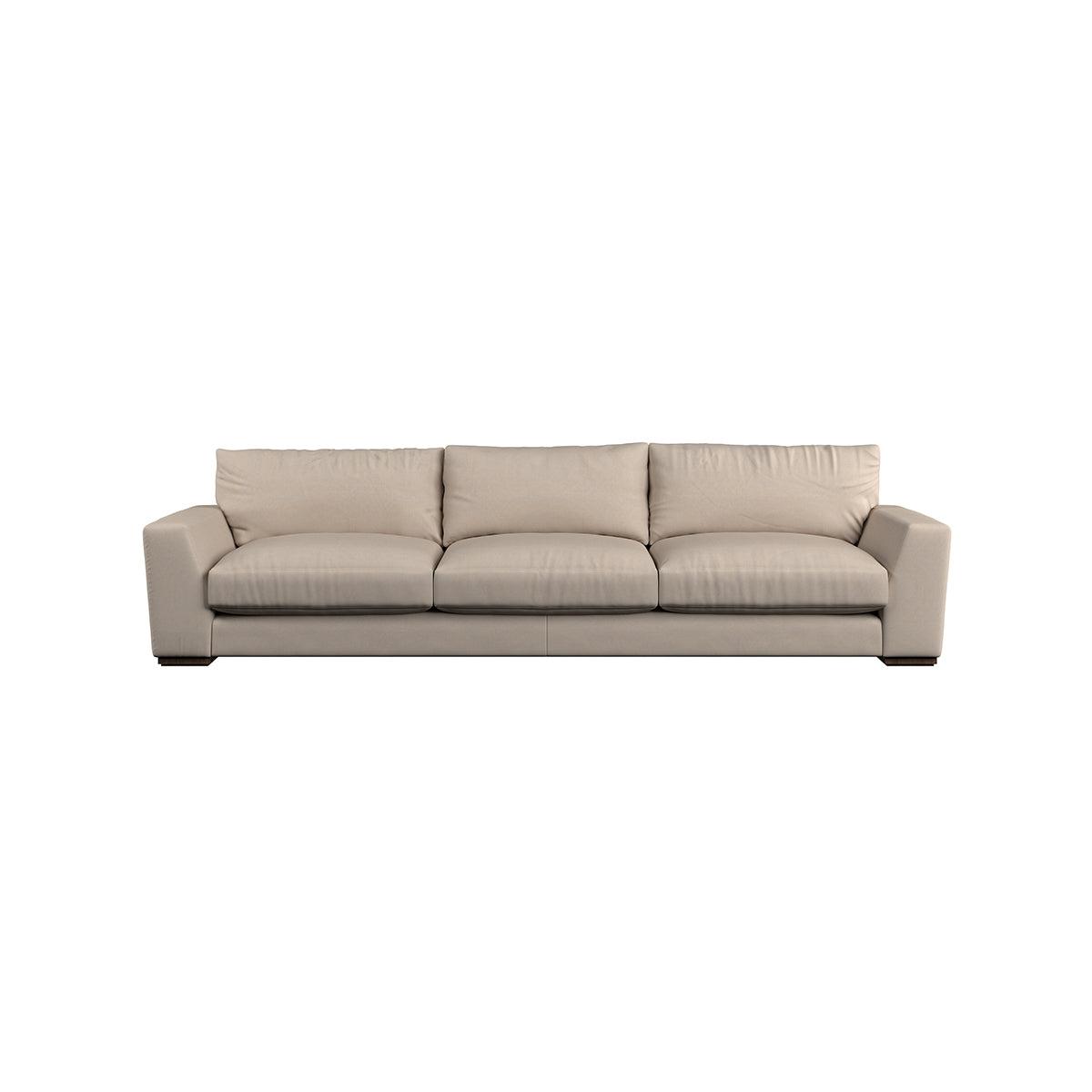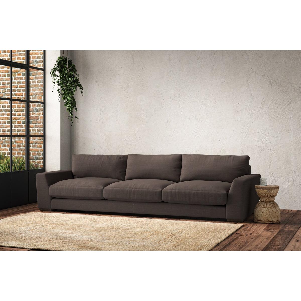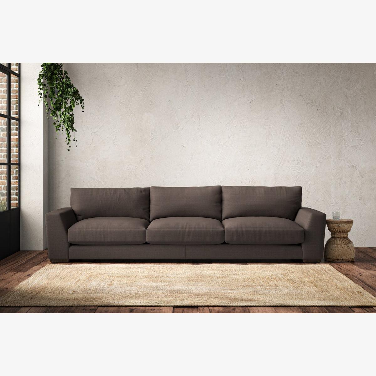 The laid-back sculptural shape of the Guddu super grand sofa brings effortless style to an interior. The generous arms and deep seat cushions make this collection the perfect choice for families or those that like a bit of extra space to stretch out. Details include separate back cushions, exceptional quality fabrics and solid wood block feet. Each piece is handcrafted by experts using traditional techniques for a quality finish that celebrates the best of British craftmanship. The hardwood frame and high-grade steel serpentine springs are selected for enduring quality, and the cushions are made from foam with a fibre wrap for added comfort. The fabric is hand cut to size, playing close attention to the characteristics of the material, and the sculpted hardwood feet provides the finishing detail. Our upholstery fabrics are chosen for their style and quality, where all fabrics are FR treated for domestic upholstery ensuring peace of mind as well as meeting specialist UK furniture requirements. Our curated colour palette offers a variety of sophisticated muted shades. Please note, our white background cut-out photography is shown in Natural for shape and style reference. Fabric Swatch Ordering We recommend ordering fabric swatches before placing your order, giving you the chance to feel the fabric and see your colour choices within your own home. You can order up to 6 free fabric swatches by clicking here. Before placing your order, it's important to take the time to measure the space you intend to place your made-to-order furniture to ensure it fits properly. You can read more in our Sofa Buying Guide.