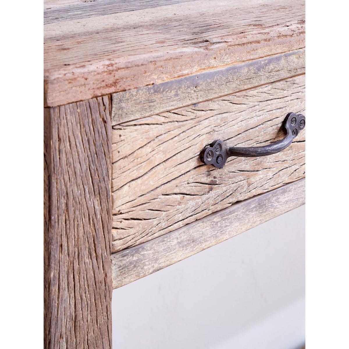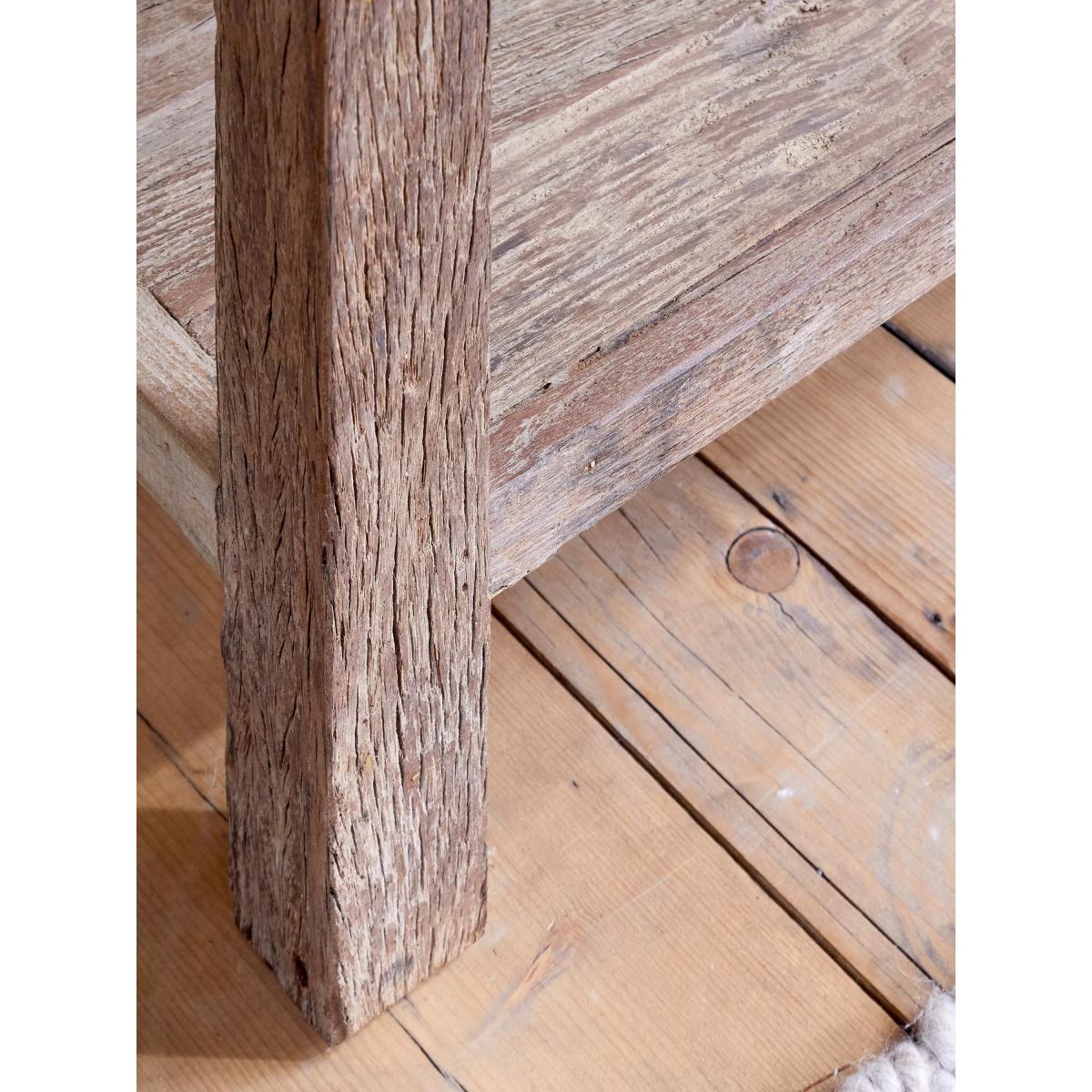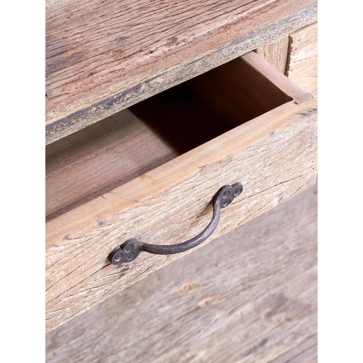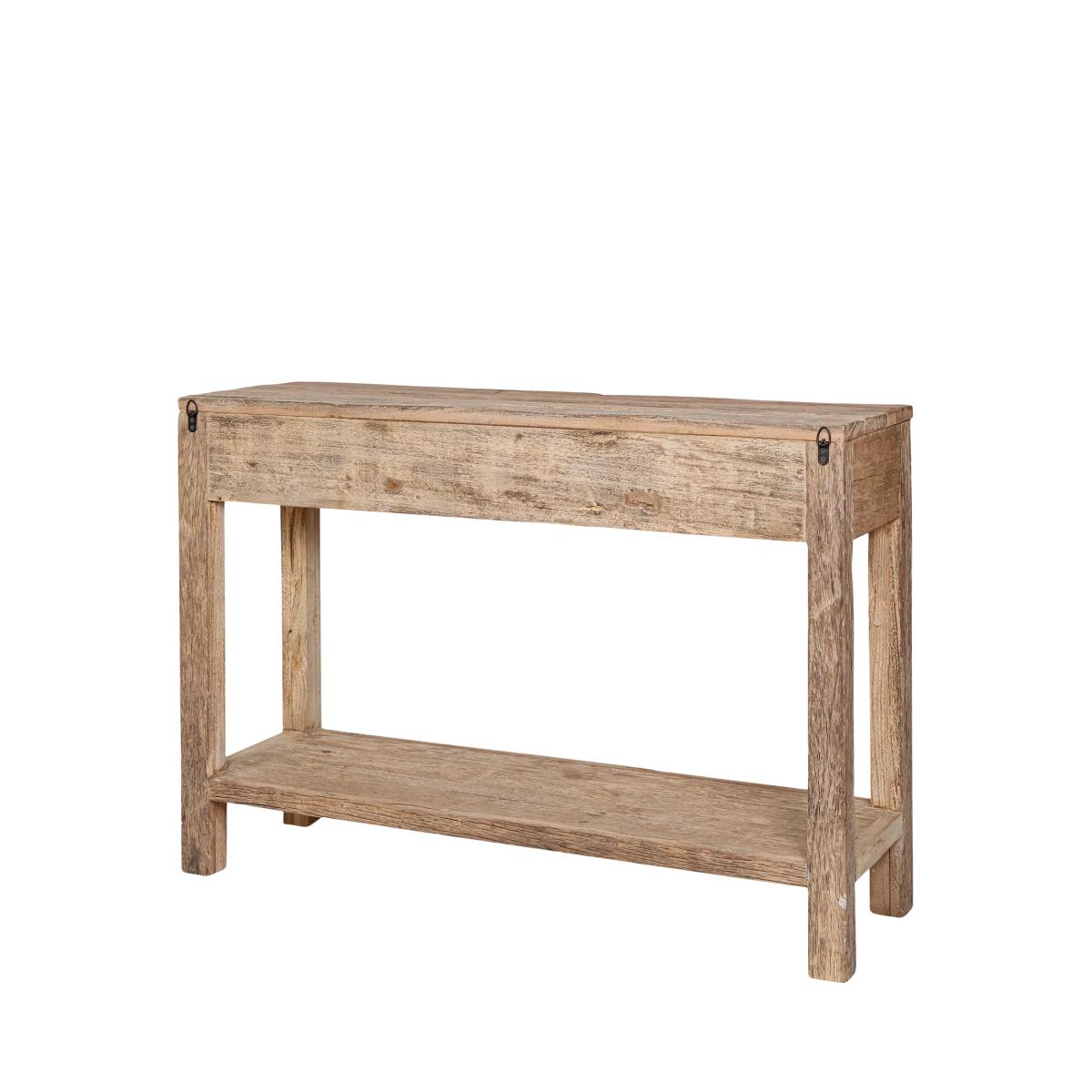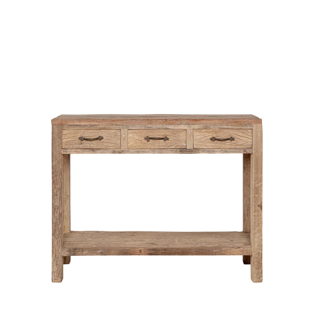 The Ibo console has three useful drawers for extra storage, bringing a distinctive reclaimed look as well as versatility and functionality to your living space. Perfect for a hallway, landing, kitchen or living room, this strong and sturdy piece is great for keeping order and displaying favourite items while also exuding effortless style. In a considered design detail that adds the perfect finishing touch to this understated piece, the parcel shelf offers extra storage to help create a clutter-free space. The Ibo collection has an ingenious and creative origin story; beginning its journey as the wooden panels on Indian trucks. The weathered tone and imperfections of the materials come through beautifully, with every piece showing unique variations in the tone of the wood, authentic rough textures, and knots and splits in the grain which only add to the rustic charm.
