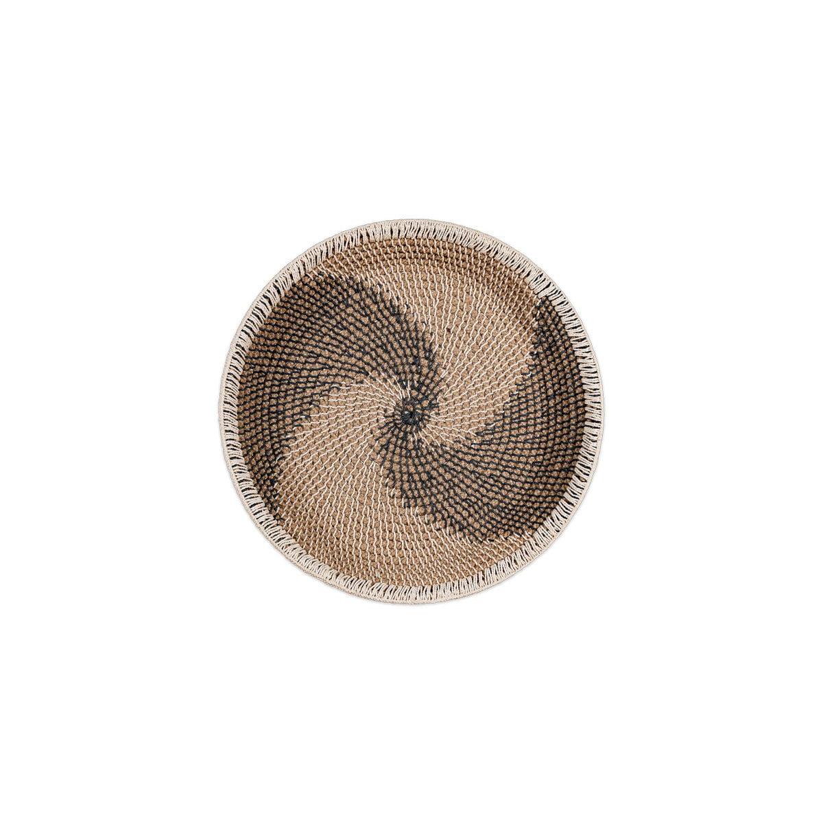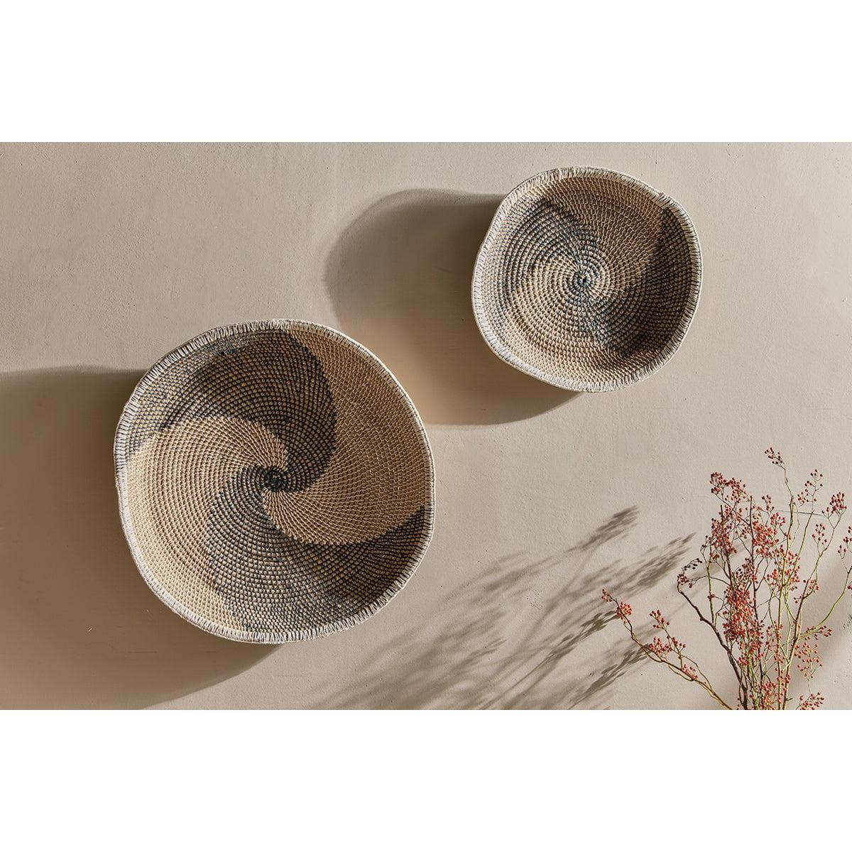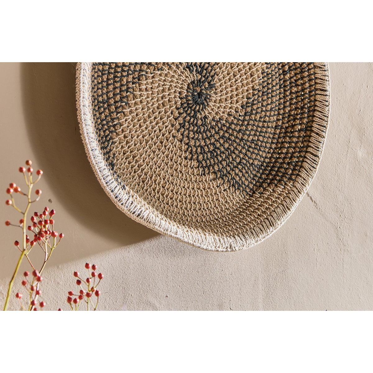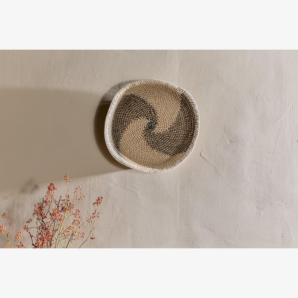 The appealing swirls of this striking Idana basket wall art are the careful work of an NGO group from southern India. The baskets are truly unique and demonstrate the age old techniques of making yarn, coiling and stitching. The natural and black tones help to extenuate this eye- catching design and make this a statement piece of wall art. The NGO was established to support rural women in drought prone areas. Crops would and still do fail and farming conditions are tough. The NGO helps these women earn a supplementary income allowing them to support their own families. The Idana basket wall art are rich with texture and provide a unique decorative piece for a wall display. All dyes are natural.