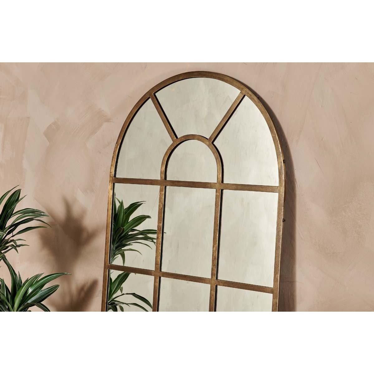 The striking architectural detail of the Imoma full length mirror makes it a glorious show piece, with the arched top and elegant windows adding to the stunning composotion of this skilfully crafted piece. The Imoma is made from iron and finished with an elegant brass finish, making it perfect as a focal point at the end of a hallway, to add interest to a living space, or simply to work well resting securely on a floor against a wall. | nkuku Imoma Iron Full Length Arch Mirror | Mirrors | Brass