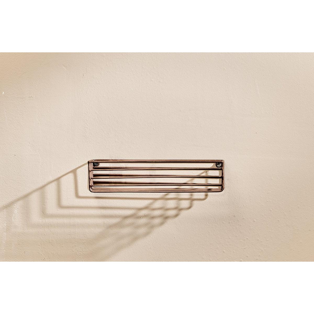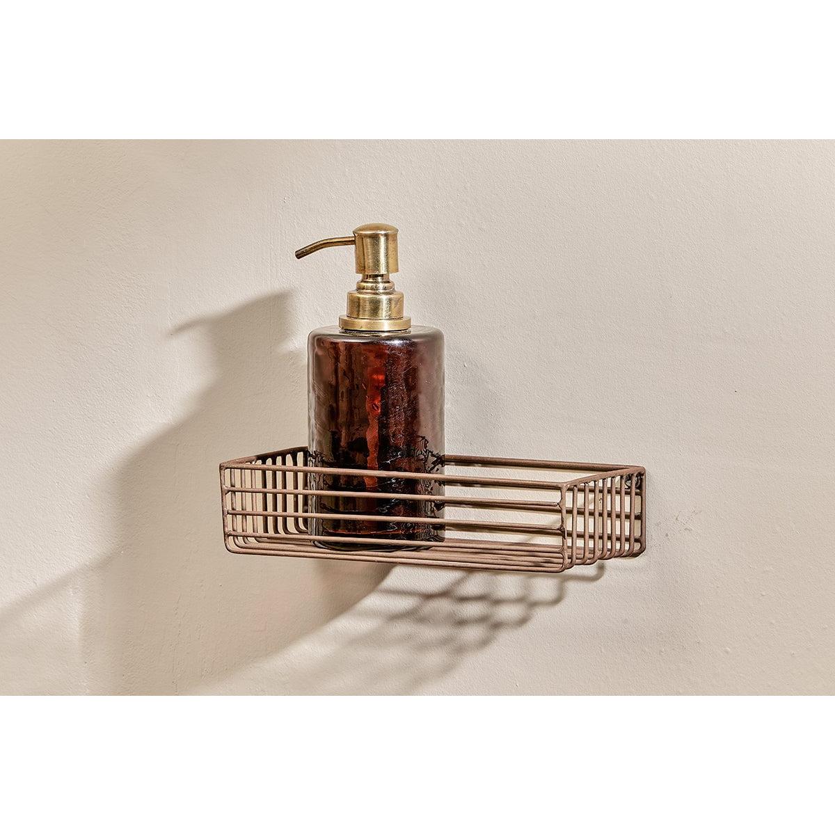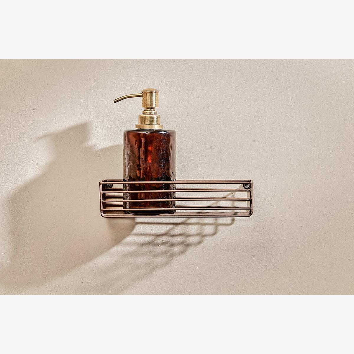 The Indore wire shelf has an industrial look. This practical shelf is designed to hold our one litre dispenser bottles along with our smaller soap dispensers. It fits neatly to a wall in clean silhouette. The iron is powder coated making it suitable for a bathroom or shower and has an aged brass tone.