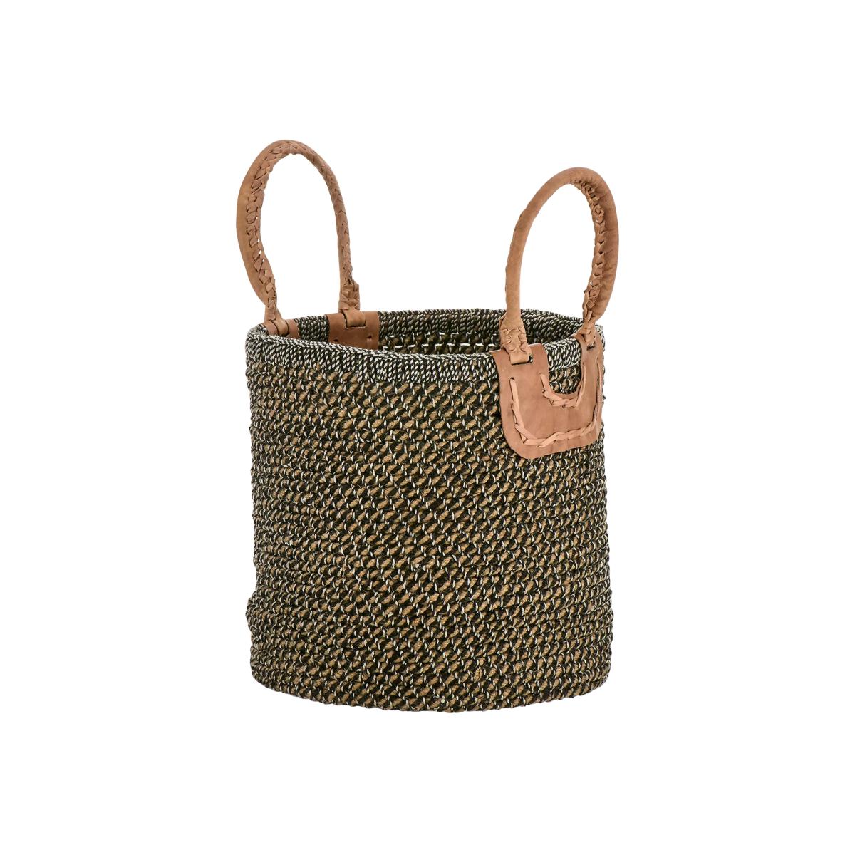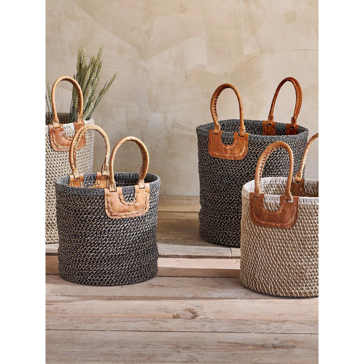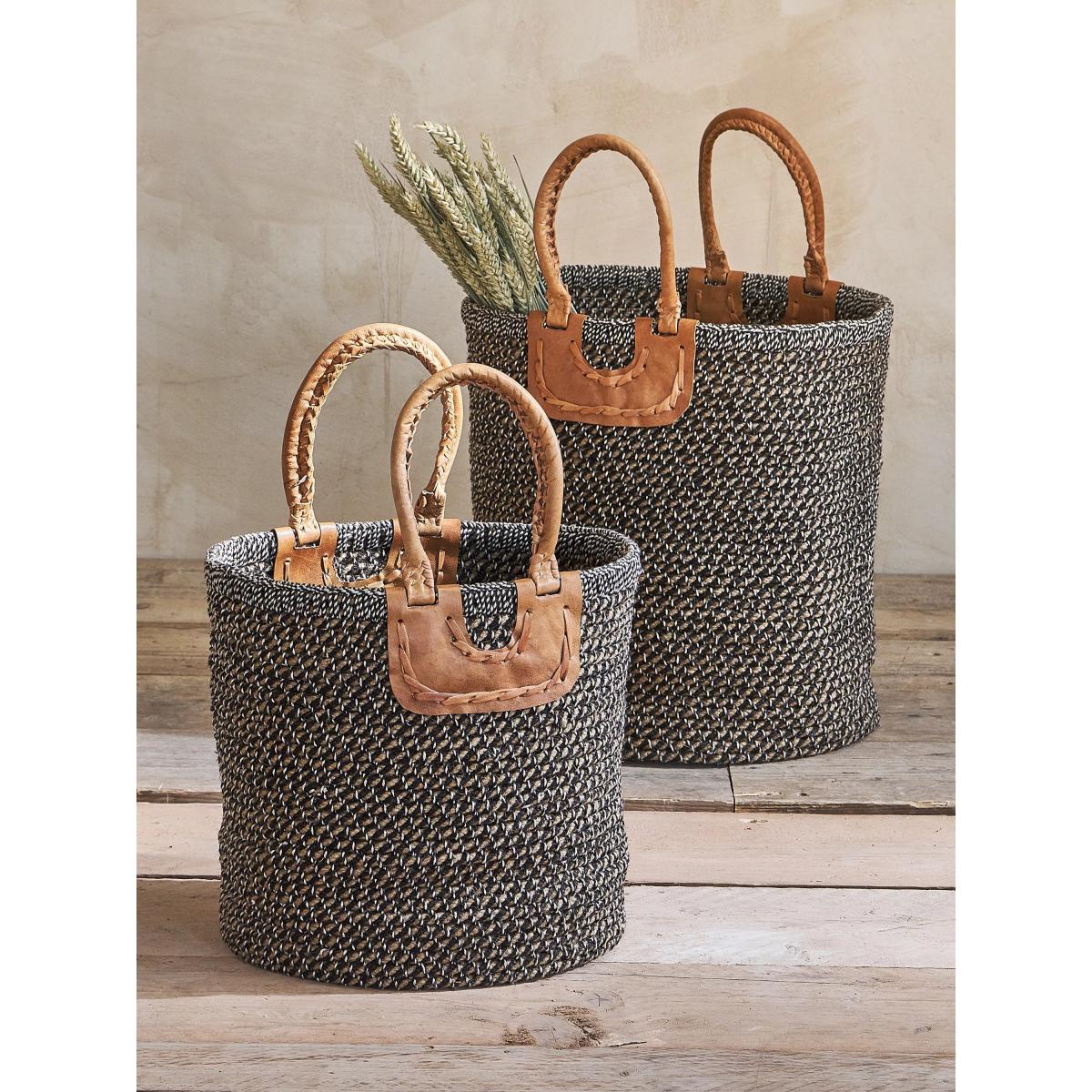 These wonderfully, crafted charcoal coloured baskets are handmade by NGO supporting rural craftswomen. They are naturally dyed, hand spun and woven using natural fibres. The baskets are made up of a series of coils in this rigid shape, while the handles are hand stitched from goat leather, naturally dyed with tree bark and vegetable extract.