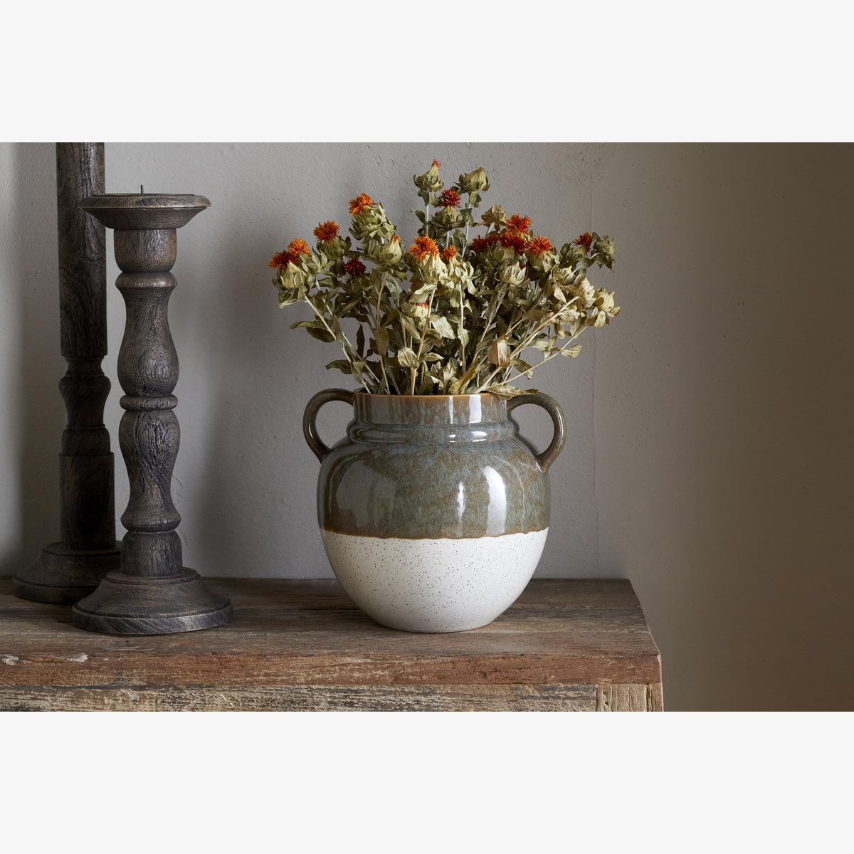 Bring a cosy look and feel to your home with our beautifully crafted Inha vase. The combination of tonal terracotta and neutral hues creates a soft, elegant design that complements any room. The inside of the vase has a double layer of glaze, making it suitable for holding water and fresh flowers. Available in both small and large sizes, these vases can be styled alone or as a set, with or without flowers.