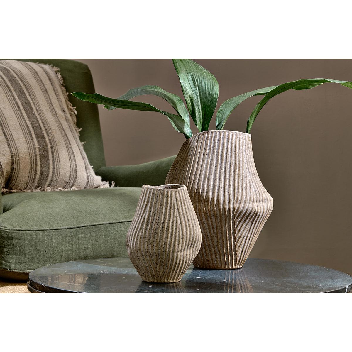 The organic tactile forms of our Kalai ceramics collection are hand shaped in Portugal and make a perfect addition to any home, adding softness and interest to a display. The grooved surface is finished with a glaze that reacts in the kiln to create a naturally textured appearance that is unique to each piece. Easy to style, it fits with any interior scheme. Beautiful as a stand-alone sculptural piece or filled with dried flowers.