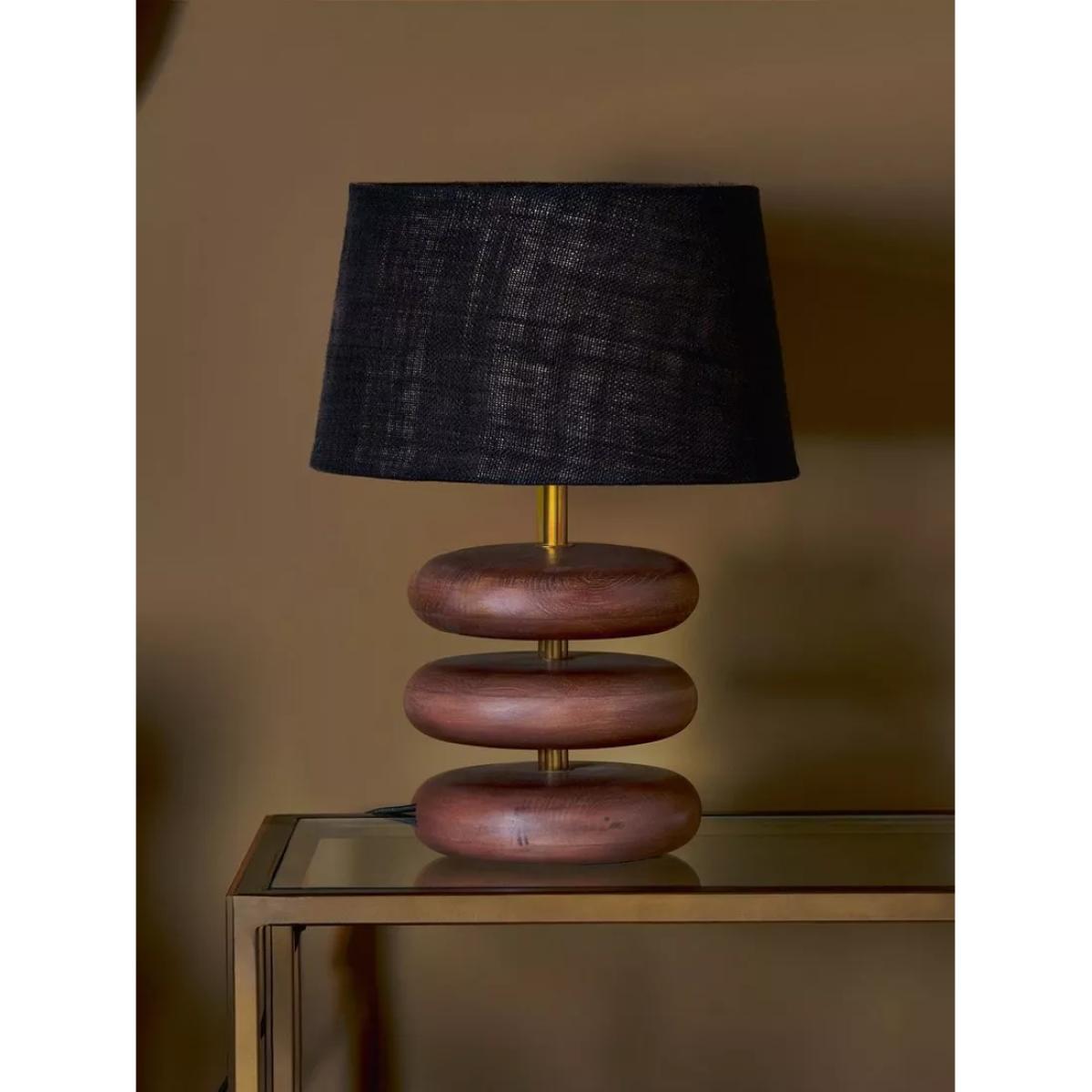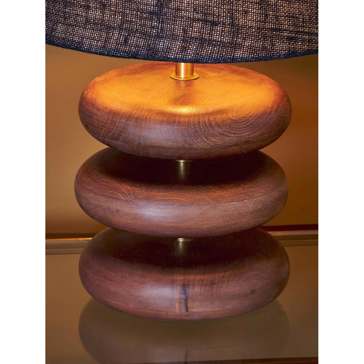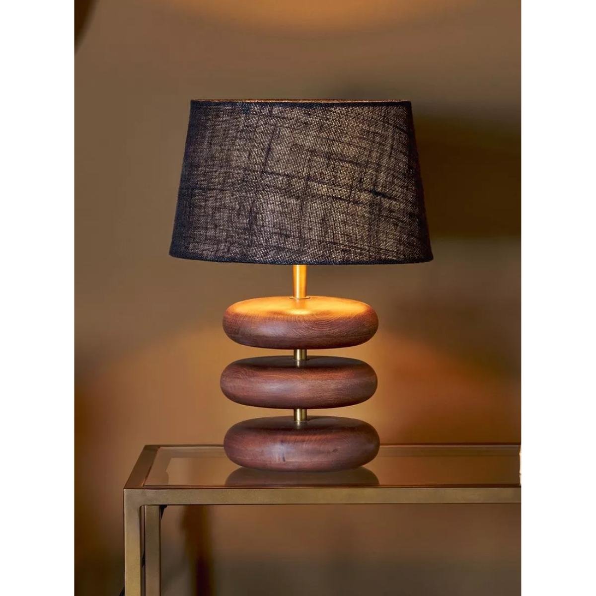 The unique shape and rustic wood finish of the Kankad table lamp base make for a striking piece that will add warmth and interest to any living space. The three smooth mango wood discs are stacked on an antique brass stem, creating an elegant statement piece with a sculptural look. Ideal for bringing warmth and light to a dark corner of a living room, this lamp celebrates the versatility and durability of mango wood. Team with nkuku's medium-sized Dia Jute Lampshade sold separately.